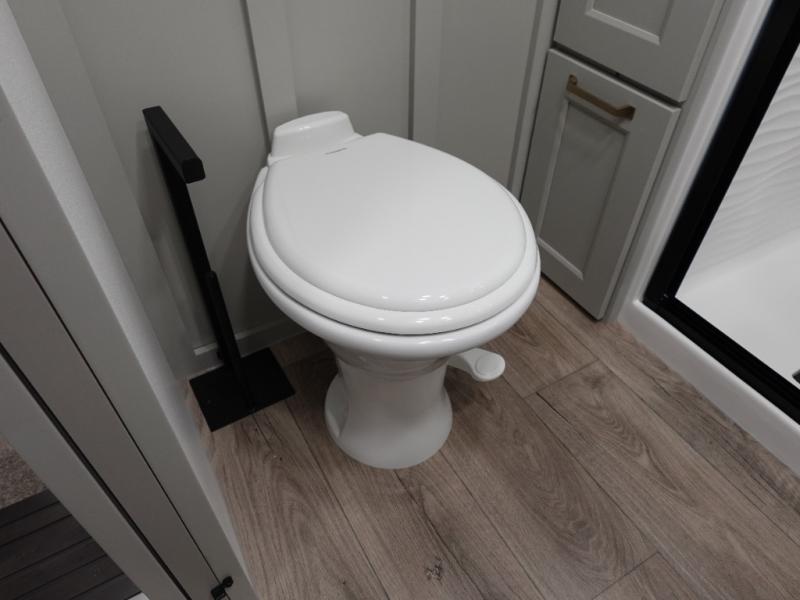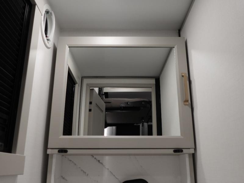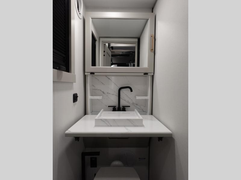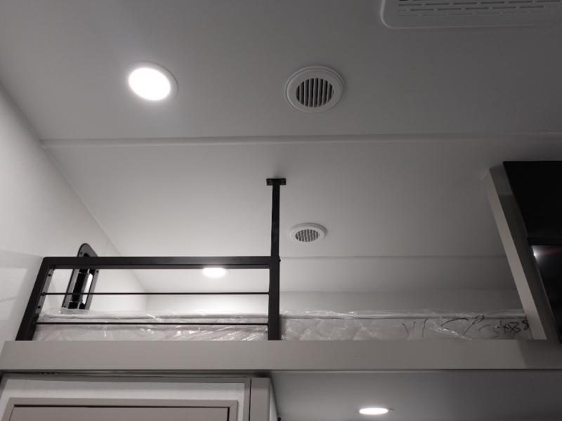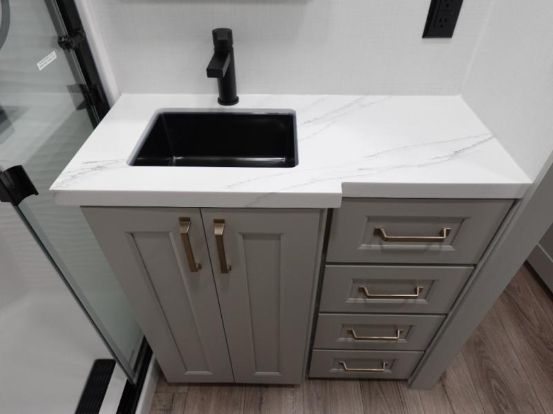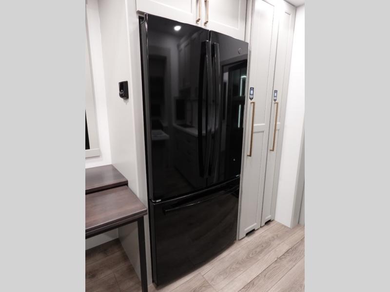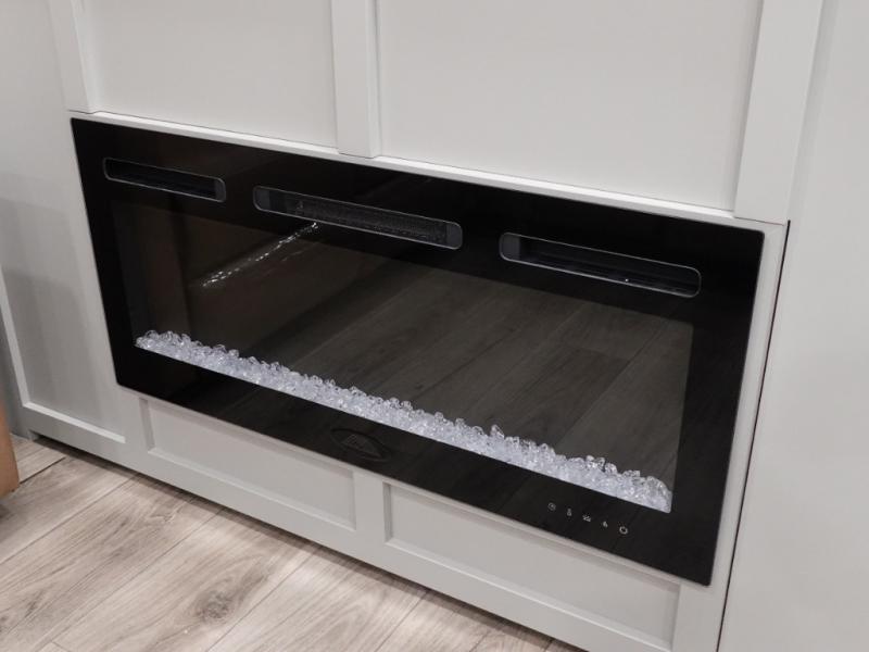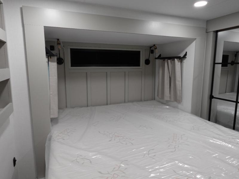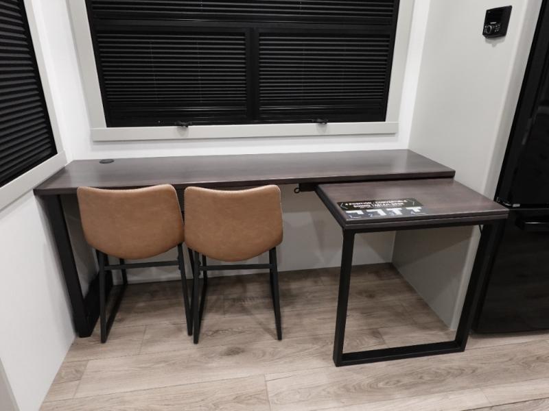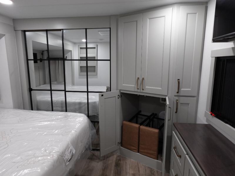 This toy hauler may just be the one you've been looking for! The garage/flex space with fold-away half bath walls will allow you to utilize the garage how you need it, plus there is an adjustable tie-down system, independent dual sofas, plus a loft for storage and a twin bed to sleep more campers! The garage patio with a 1,500 lb. capacity is another feature you are sure to love, especially with its own awning to keep you protected from the elements. Head to the kitchen to prepare meals with a 24" GE oven with a four burner range, a GE microwave with an air fryer, plus a spacious GE Energy Star 19 cu. ft. refrigerator. The island with two stools will let others visit with you while you cook, and there are even hidden dog bowls. You'll find the convertible dining table/L-desk will be accommodating since it can be use to dine at, and to get some work done. You may just find yourselves spending most of your time on the L-sofa in front of the TV and fireplace. A full bath is up front by the bedroom, and here you'll find neon shower lighting, a residential shower system, and pull-out linen storage to keep towels ready to use. After a day outdoors you'll love nothing more than coming back to your own bedroom with a king bed slide out, TV, a walk-in closet, and many more storage spaces. And we haven't even touched on the exterior features, like the 3-way pass-through storage, three power awnings, an air compressor to fill up tires, and the list goes on and on!