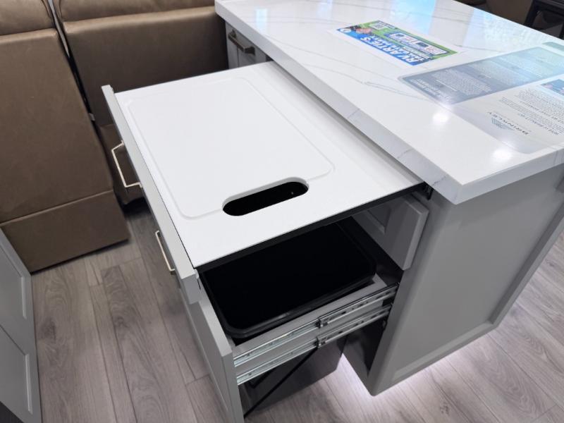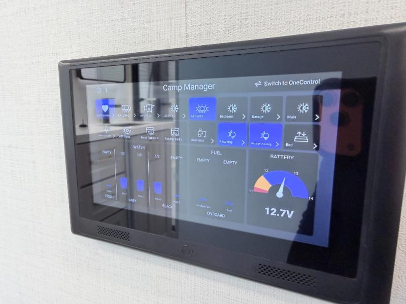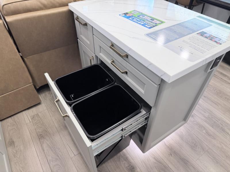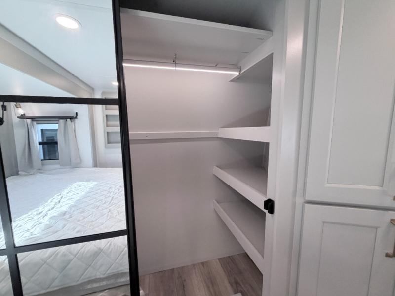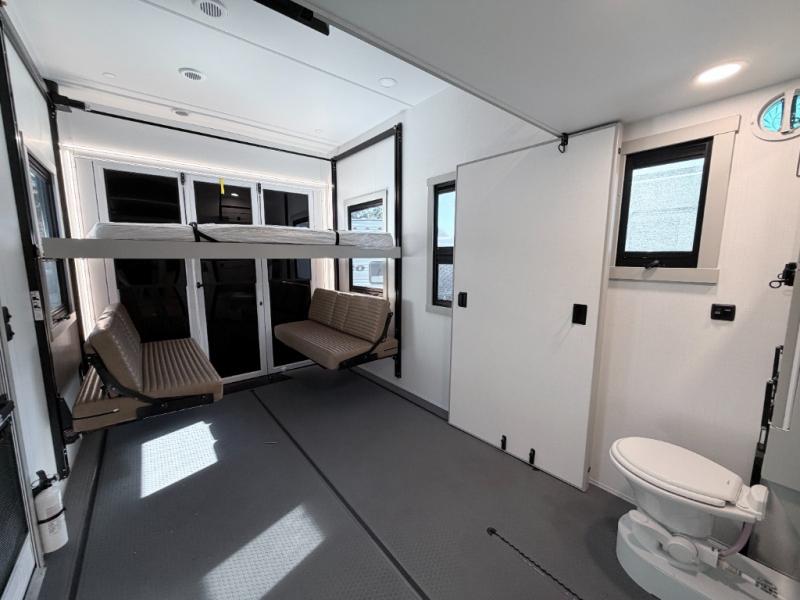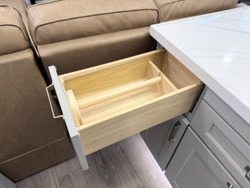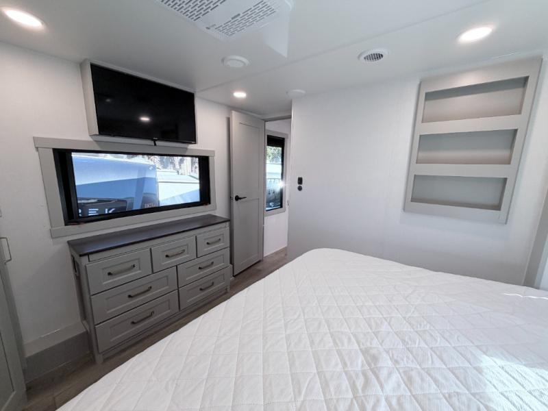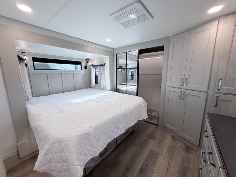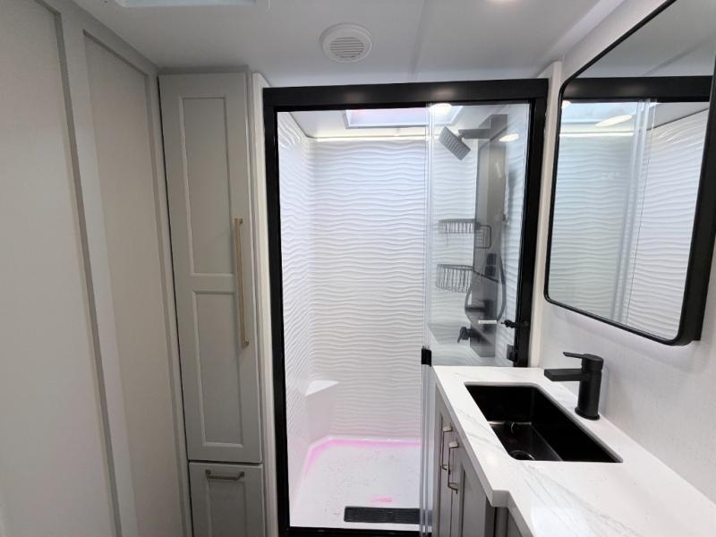 The full front bath includes a residential shower system, neon lighting, and pull-out linen storage. In the private bedroom, enjoy a king bed slide, a walk-in closet, multiple wardrobes, and an available TV. Motion-activated bed lights and premium wood trim construction elevate the experience.
