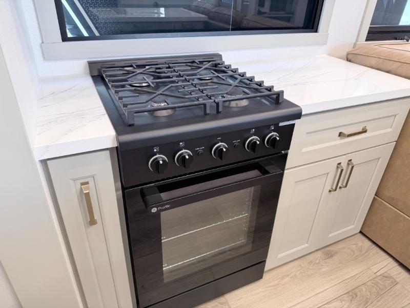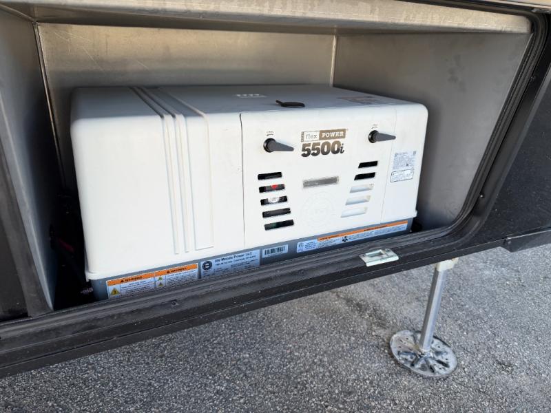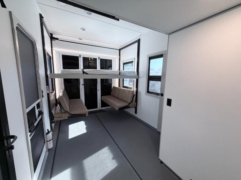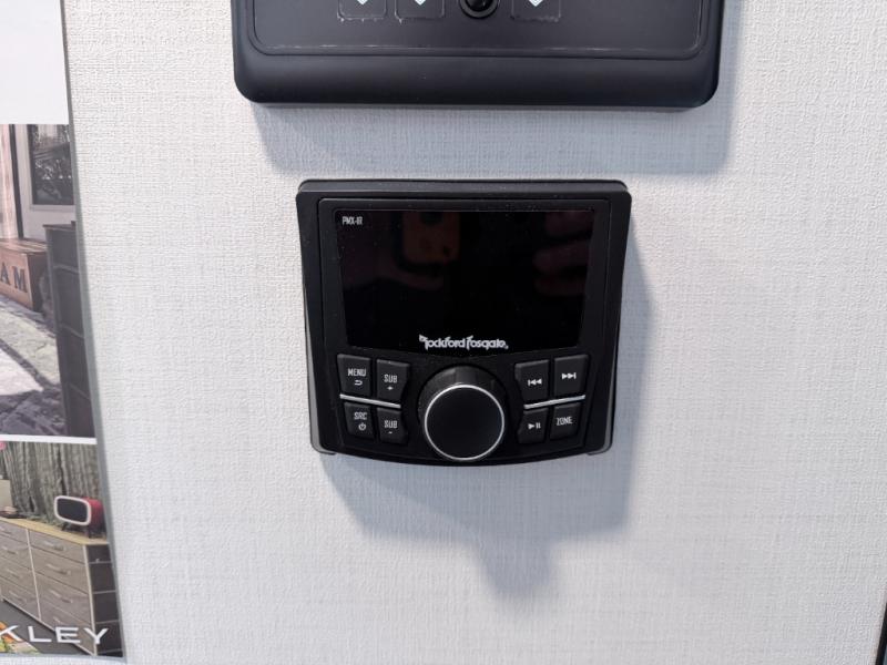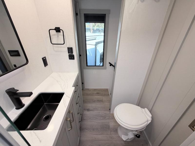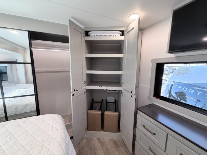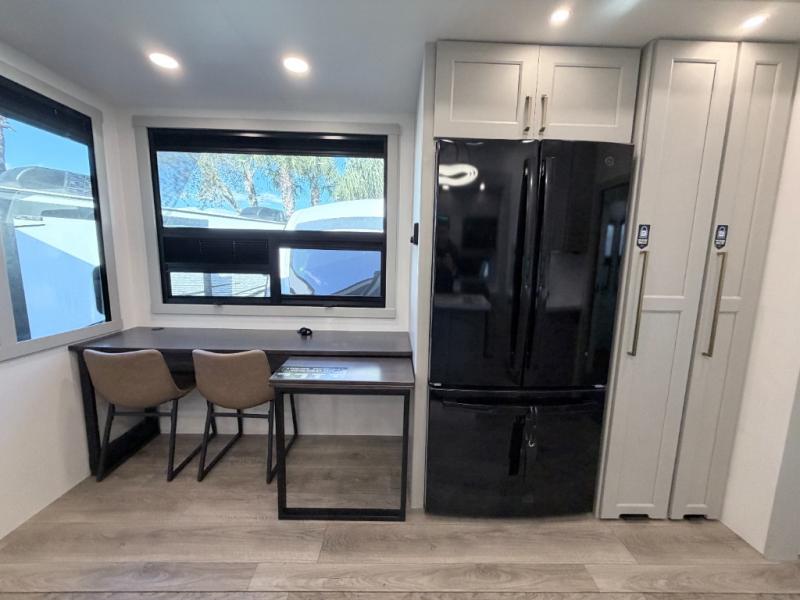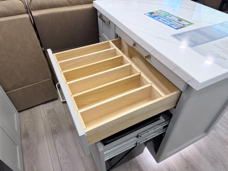 The full front bath includes a residential shower system, neon lighting, and pull-out linen storage. In the private bedroom, enjoy a king bed slide, a walk-in closet, multiple wardrobes, and an available TV. Motion-activated bed lights and premium wood trim construction elevate the experience.