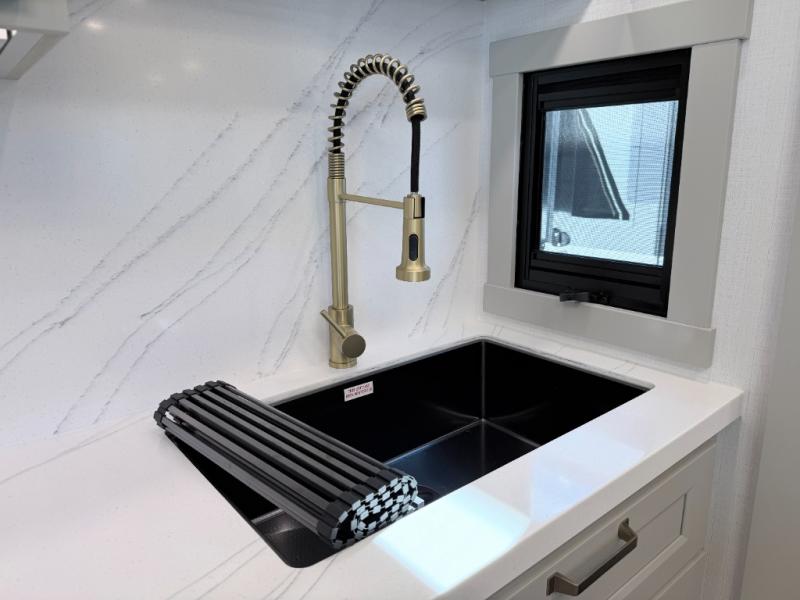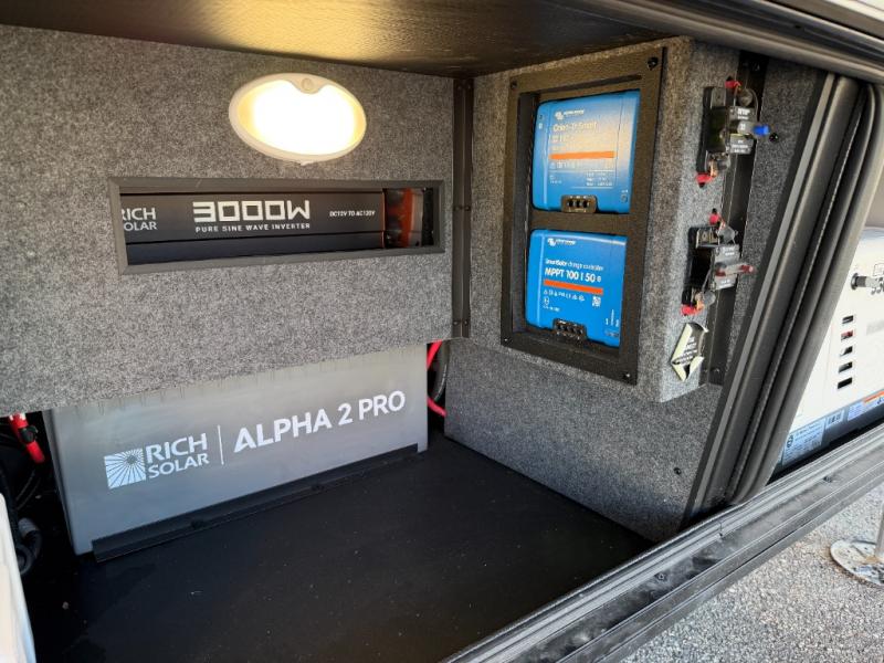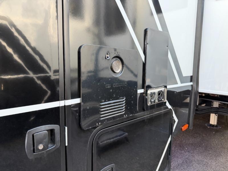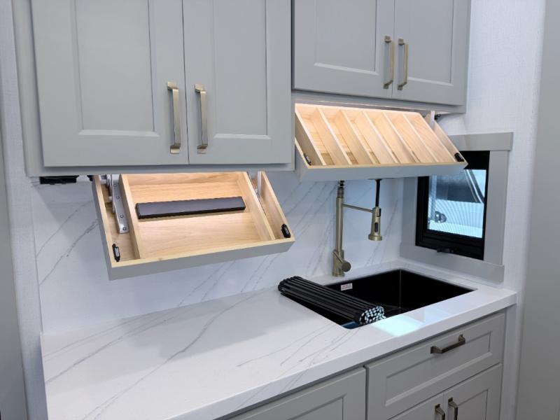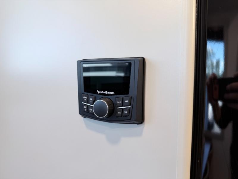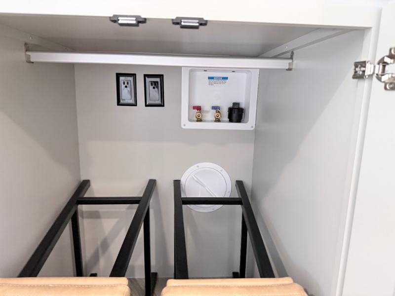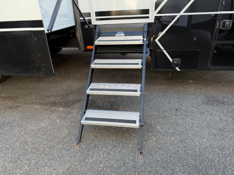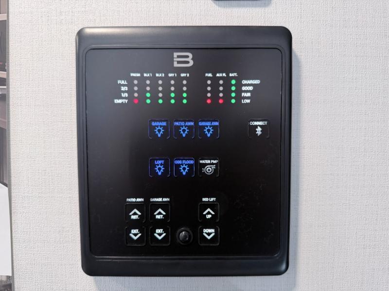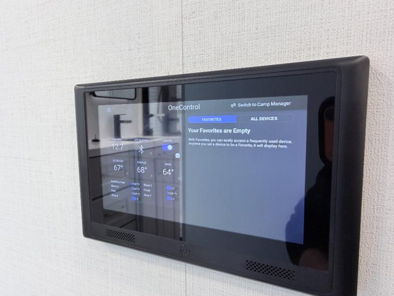 The full front bath includes a residential shower system, neon lighting, and pull-out linen storage. In the private bedroom, enjoy a king bed slide, a walk-in closet, multiple wardrobes, and an available TV. Motion-activated bed lights and premium wood trim construction elevate the experience.