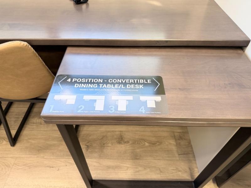 The newly upgraded L-shaped sofa creates a wide-open, comfortable lounge area directly in front of the entertainment center with fireplace. The convertible dining table/L-desk provides a space to work, dine, or unwind—whatever your day calls for.