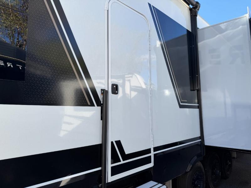 This premium toy hauler delivers unmatched flexibility and comfort, starting with the 14' garage/flex space featuring fold-away half bath walls, an adjustable tie-down system, independent dual sofas, and an upper loft with room for storage and a twin mattress. The rear patio system with 1,500 lb. capacity and its own awning creates an incredible outdoor living space perfect for relaxing after a long day on the trails.