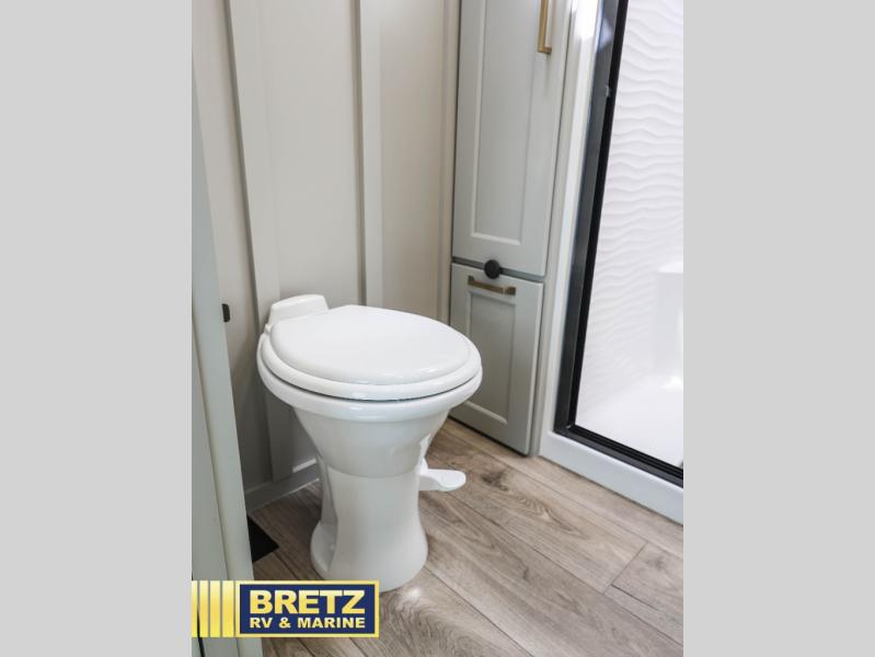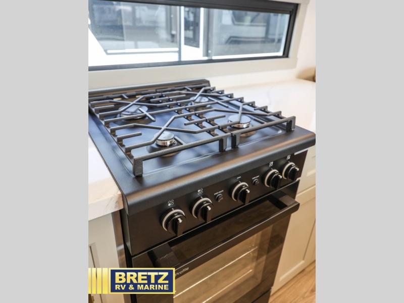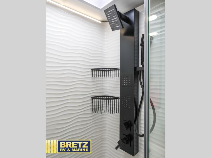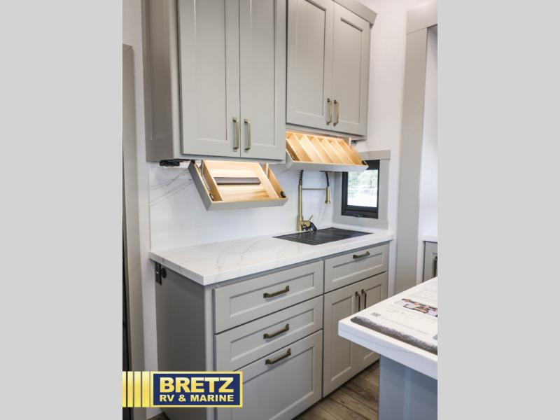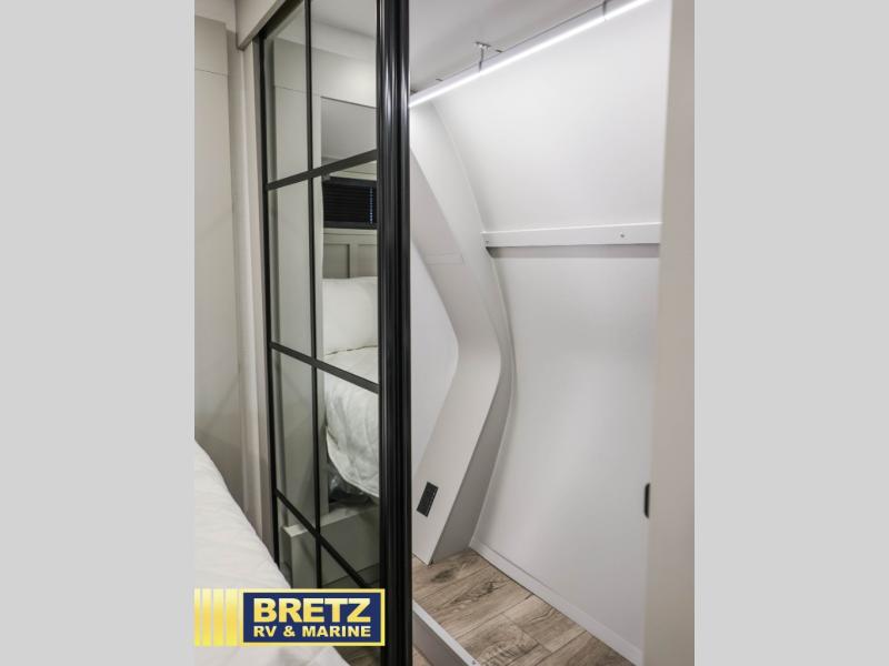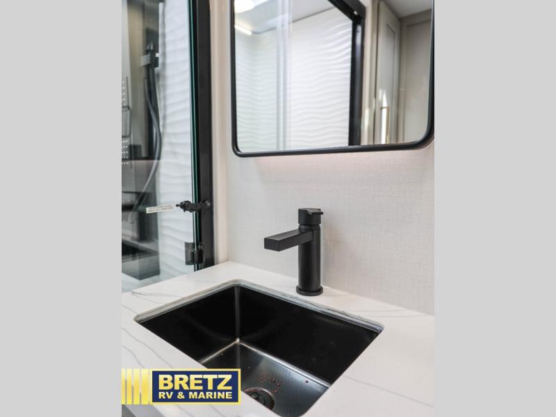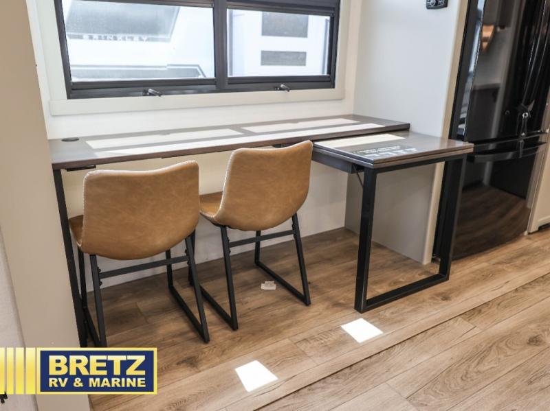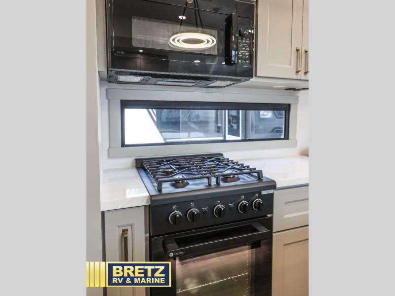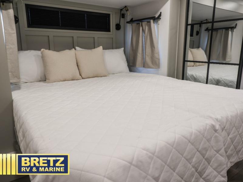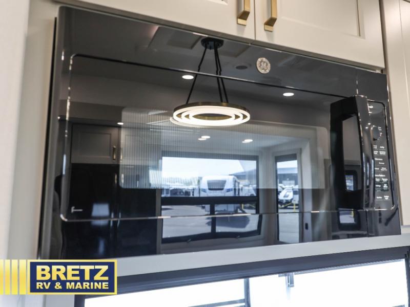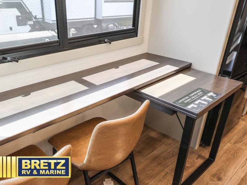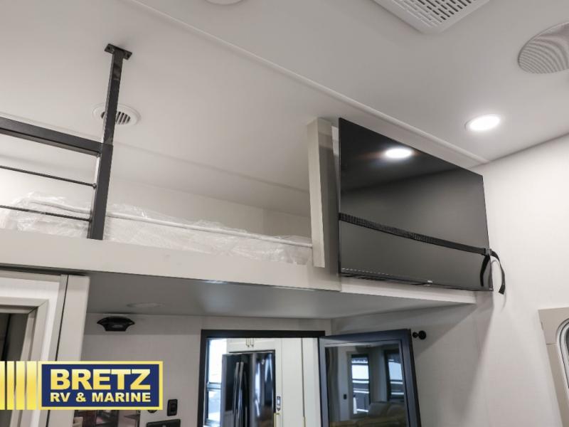 This toy hauler may just be the one you've been looking for! The garage/flex space with fold-away half bath walls will allow you to utilize the garage how you need it, plus there is an adjustable tie-down system, independent dual sofas, plus a loft for storage and a twin bed to sleep more campers! The garage patio with a 1,500 lb. capacity is another feature you are sure to love, especially with its own awning to keep you protected from the elements. Head to the kitchen to prepare meals with a 24" GE oven with a four burner range, a GE microwave with an air fryer, plus a spacious GE Energy Star 19 cu. ft. refrigerator. The island with two stools will let others visit with you while you cook, and there are even hidden dog bowls. You'll find the convertible dining table/L-desk will be accommodating since it can be use to dine at, and to get some work done. You may just find yourselves spending most of your time on the L-sofa in front of the TV and fireplace. A full bath is up front by the bedroom, and here you'll find neon shower lighting, a residential shower system, and pull-out linen storage to keep towels ready to use. After a day outdoors you'll love nothing more than coming back to your own bedroom with a king bed slide out, TV, a walk-in closet, and many more storage spaces. And we haven't even touched on the exterior features, like the 3-way pass-through storage, three power awnings, an air compressor to fill up tires, and the list goes on and on!