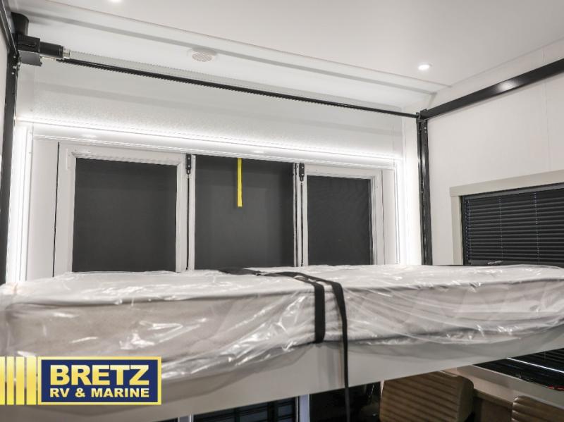 With any Model G toy hauler fifth wheel by Brinkley you will enjoy luxurious amenities, tons of storage space, and innovative features that have been developed and tested in the real world. Durable construction includes an industry leading PDI process, an industry best insulation package, and reinforced and walkable slide roofs. Some of the exterior features you'll find are a 3-way pass-through with a multi-functional flip-up bulkhead wall, under I-beam storage, a MAX-Vision reverse lighting system, and a low-maintenance roof to name a few. A Rockford Fosgate audio system comes standard, along with a OneControl app system that lets you control your fifth wheel's functions right from your mobile device. You will find the solar system with a designated storage area to be ultra convenient, plus there is a FlexPower 5500 with a dual fuel inverter generator for all your power needs. Head inside to find a residential interior with Brinkley's CraftSense wood trim construction, floating entrance steps, integrated window screens and insulated blackout blinds, and residential solid surface countertops plus backsplash. You will also enjoy the neon shower lighting and recessed medicine cabinets in the bath, plus motion activated LED bed lights and dual bedside outlets in the bedroom. Choose a Model G toy hauler fifth wheel to experience all the luxury it has to offer!