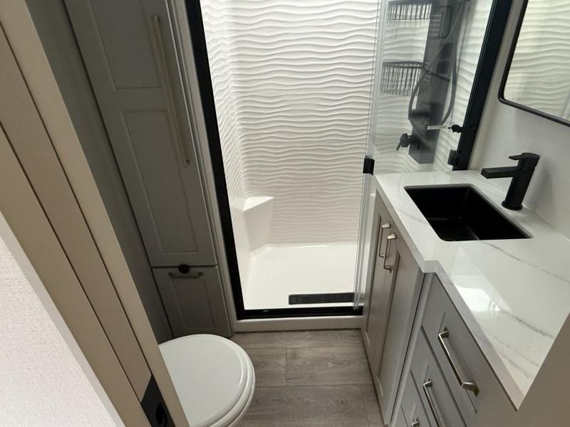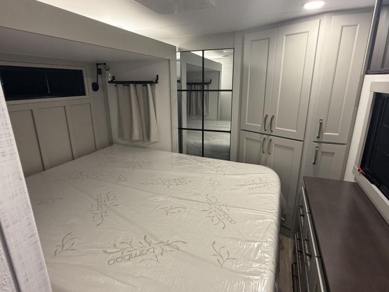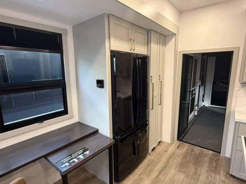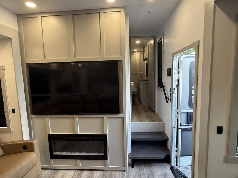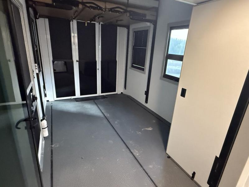 This toy hauler may just be the one you've been looking for! The garage/flex space with fold-away half bath walls will allow you to utilize the garage how you need it, plus there is an adjustable tie-down system, independent dual sofas, plus a loft for storage and a twin bed to sleep more campers! The garage patio with a 1,500 lb. capacity is another feature you are sure to love, especially with its own awning to keep you protected from the elements. Head to the kitchen to prepare meals with a 24" GE oven with a four-burner range, a GE microwave with an air fryer, plus a spacious GE Energy Star 19 cu. ft. refrigerator. The island with two stools will let others visit with you while you cook, and there are even hidden dog bowls. You'll find the convertible dining table/L-desk will be accommodating since it can be used to dine at, and to get some work done. You may just find yourselves spending most of your time on the L-sofa in front of the TV and fireplace. A full bath is up front by the bedroom, and here you'll find neon shower lighting, a residential shower system, and pull-out linen storage to keep towels ready to use. After a day outdoors you'll love nothing more than coming back to your own bedroom with a king bed slide out, TV, a walk-in closet, and many more storage spaces. And we haven't even touched on the exterior features, like the 3-way pass-through storage, four power awnings, an air compressor to fill up tires, and the list goes on and on!