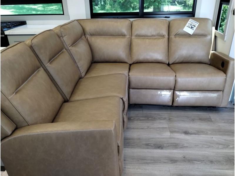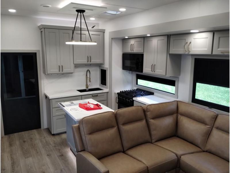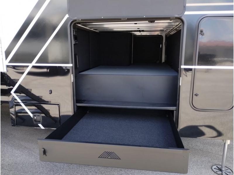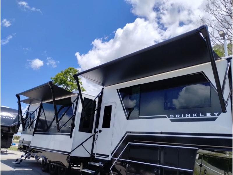 With any Model G toy hauler fifth wheel by Brinkley you will enjoy luxurious amenities, tons of storage space, and innovative features that have been developed and tested in the real world. Durable construction includes an industry leading PDI process, an industry best insulation package, and reinforced and walkable slide roofs. Some of the exterior features you'll find are a 3-way pass-through with a multi-functional flip-up bulkhead wall, under I-beam storage, a MAX-Vision reverse lighting system, and a low-maintenance roof to name a few. A Rockford Fosgate audio system comes standard, along with a OneControl app system that lets you control your fifth wheel's functions right from your mobile device. You will find the solar system with a designated storage area to be ultra convenient, plus there is a FlexPower 5500 with a dual fuel inverter generator for all your power needs. Head inside to find a residential interior with Brinkley's CraftSense wood trim construction, floating entrance steps, integrated window screens and insulated blackout blinds, and residential solid surface countertops plus backsplash. You will also enjoy the neon shower lighting and recessed medicine cabinets in the bath, plus motion activated LED bed lights and dual bedside outlets in the bedroom. Choose a Model G toy hauler fifth wheel to experience all the luxury it has to offer!