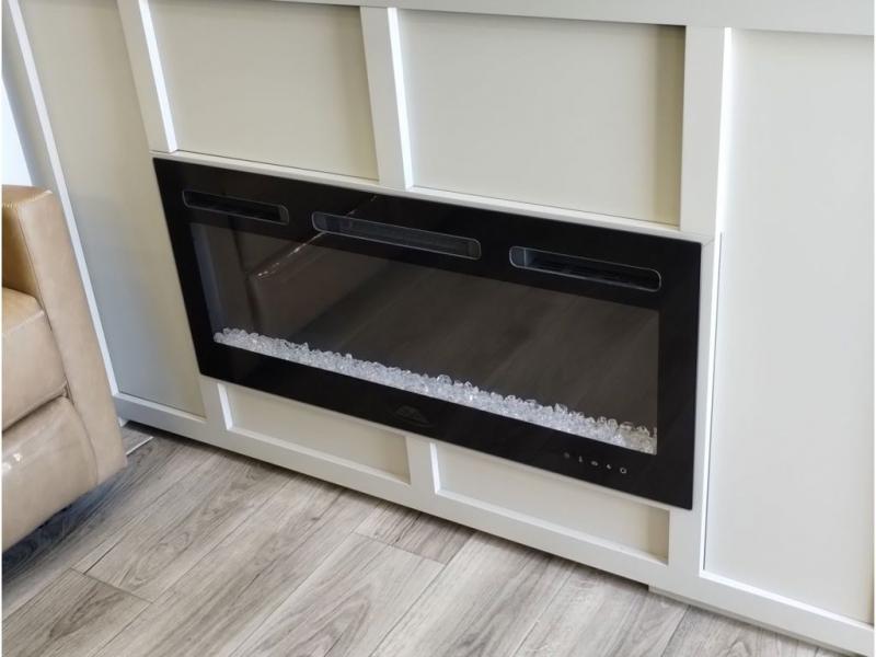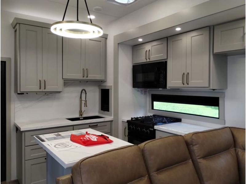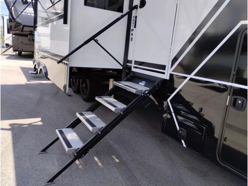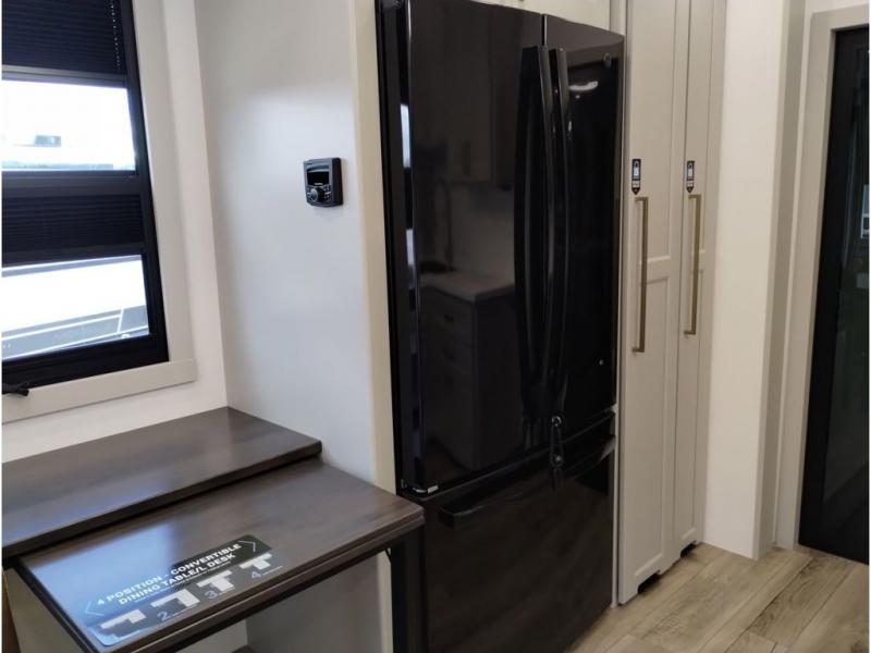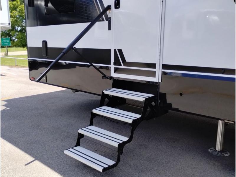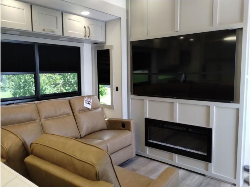 This toy hauler may just be the one you've been looking for! The garage/flex space with fold-away half bath walls will allow you to utilize the garage how you need it, plus there is an adjustable tie-down system, independent dual sofas, plus a loft for storage and a twin bed to sleep more campers! The garage patio with a 1,500 lb. capacity is another feature you are sure to love, especially with its own awning to keep you protected from the elements. Head to the kitchen to prepare meals with a 24" GE oven with a four burner range, a GE microwave with an air fryer, plus a spacious GE Energy Star 19 cu. ft. refrigerator. The island with two stools will let others visit with you while you cook, and there are even hidden dog bowls. You'll find the convertible dining table/L-desk will be accommodating since it can be use to dine at, and to get some work done. You may just find yourselves spending most of your time on the L-sofa in front of the TV and fireplace. A full bath is up front by the bedroom, and here you'll find neon shower lighting, a residential shower system, and pull-out linen storage to keep towels ready to use. After a day outdoors you'll love nothing more than coming back to your own bedroom with a king bed slide out, TV, a walk-in closet, and many more storage spaces. And we haven't even touched on the exterior features, like the 3-way pass-through storage, three power awnings, an air compressor to fill up tires, and the list goes on and on!