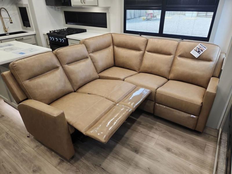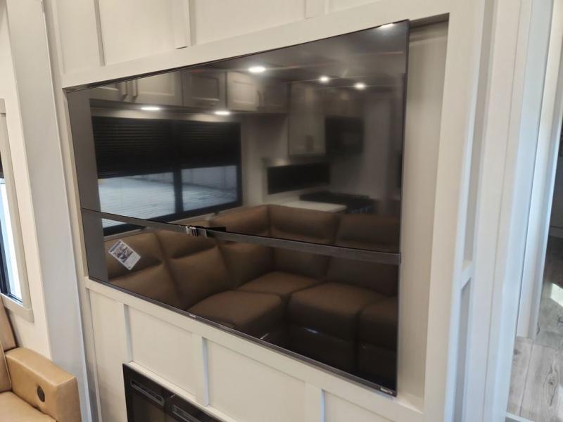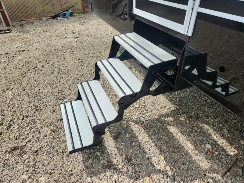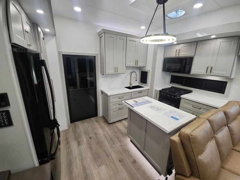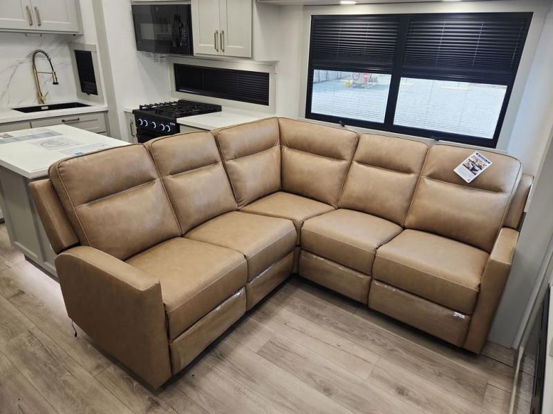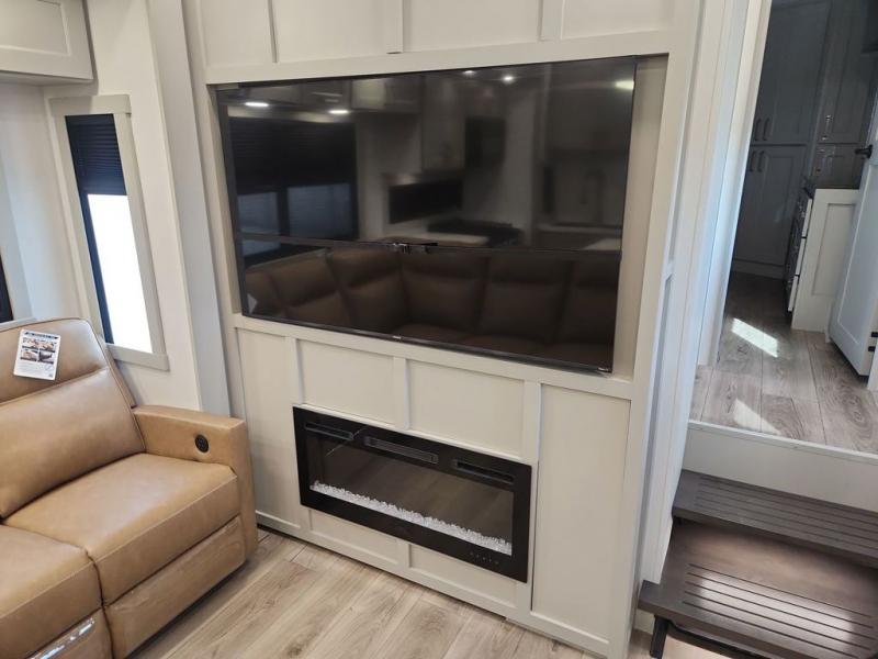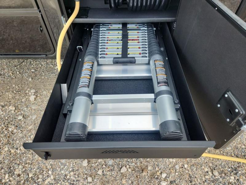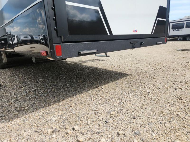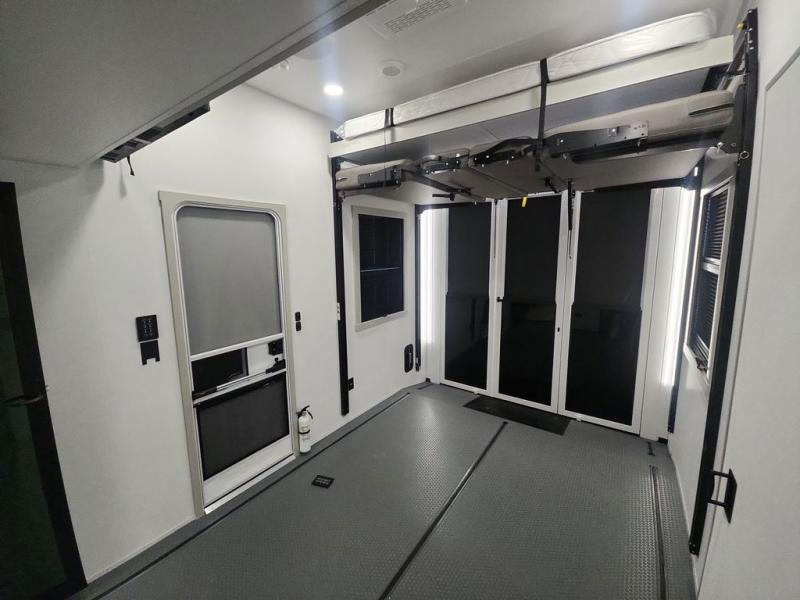 This toy hauler may just be the one you've been looking for! The garage/flex space with fold-away half bath walls will allow you to utilize the garage how you need it, plus there is an adjustable tie-down system, independent dual sofas, plus a loft for storage and a twin bed to sleep more campers! The garage patio with a 1,500 lb. capacity is another feature you are sure to love, especially with its own awning to keep you protected from the elements. Head to the kitchen to prepare meals with a 24" GE oven with a four burner range, a GE microwave with an air fryer, plus a spacious GE Energy Star 19 cu. ft. refrigerator. The island with two stools will let others visit with you while you cook, and there are even hidden dog bowls. You'll find the convertible dining table/L-desk will be accommodating since it can be use to dine at, and to get some work done. You may just find yourselves spending most of your time on the L-sofa in front of the TV and fireplace. A full bath is up front by the bedroom, and here you'll find neon shower lighting, a residential shower system, and pull-out linen storage to keep towels ready to use. After a day outdoors you'll love nothing more than coming back to your own bedroom with a king bed slide out, TV, a walk-in closet, and many more storage spaces. And we haven't even touched on the exterior features, like the 3-way pass-through storage, three power awnings, an air compressor to fill up tires, and the list goes on and on!