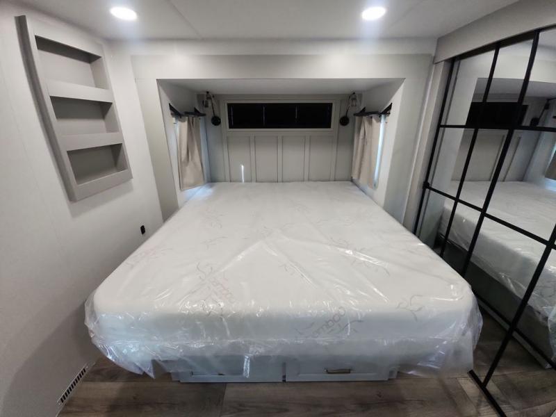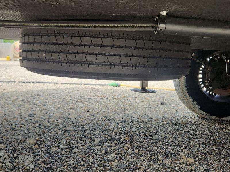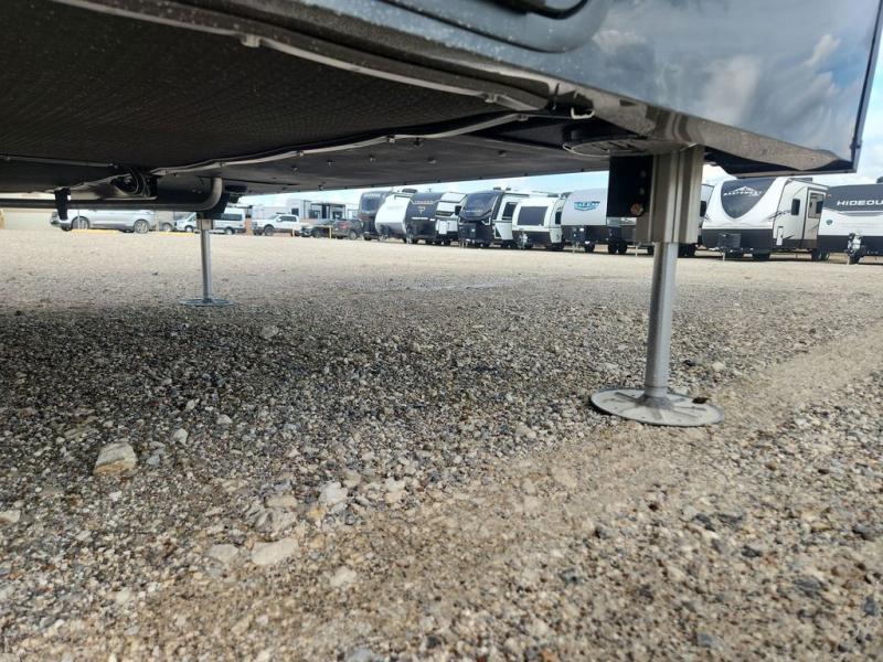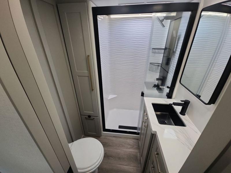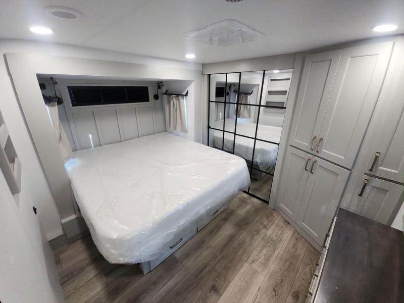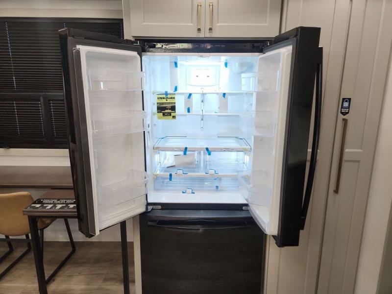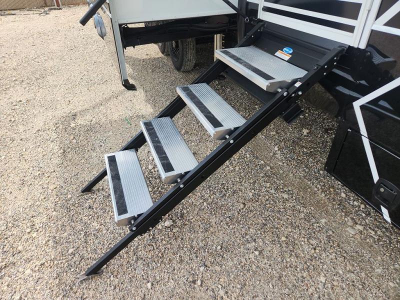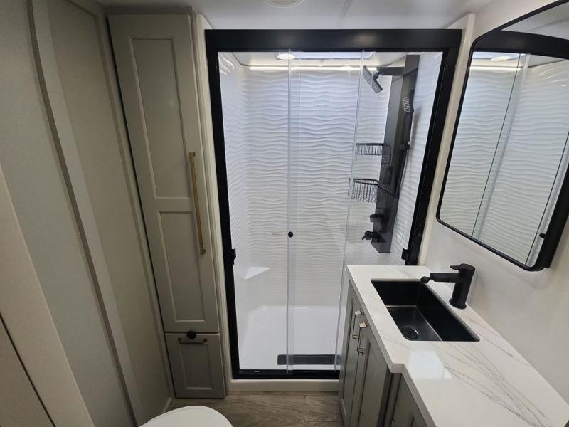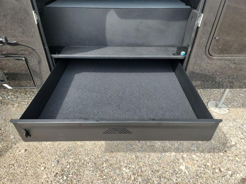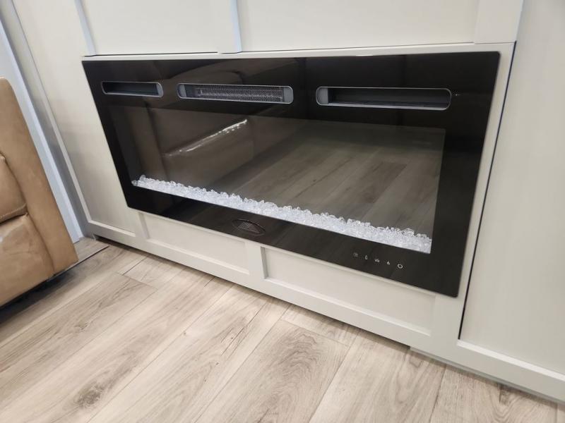 This toy hauler may just be the one you've been looking for! The garage/flex space with fold-away half bath walls will allow you to utilize the garage how you need it, plus there is an adjustable tie-down system, independent dual sofas, plus a loft for storage and a twin bed to sleep more campers! The garage patio with a 1,500 lb. capacity is another feature you are sure to love, especially with its own awning to keep you protected from the elements. Head to the kitchen to prepare meals with a 24" GE oven with a four burner range, a GE microwave with an air fryer, plus a spacious GE Energy Star 19 cu. ft. refrigerator. The island with two stools will let others visit with you while you cook, and there are even hidden dog bowls. You'll find the convertible dining table/L-desk will be accommodating since it can be use to dine at, and to get some work done. You may just find yourselves spending most of your time on the L-sofa in front of the TV and fireplace. A full bath is up front by the bedroom, and here you'll find neon shower lighting, a residential shower system, and pull-out linen storage to keep towels ready to use. After a day outdoors you'll love nothing more than coming back to your own bedroom with a king bed slide out, TV, a walk-in closet, and many more storage spaces. And we haven't even touched on the exterior features, like the 3-way pass-through storage, three power awnings, an air compressor to fill up tires, and the list goes on and on!