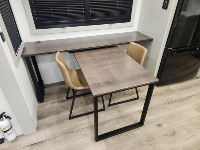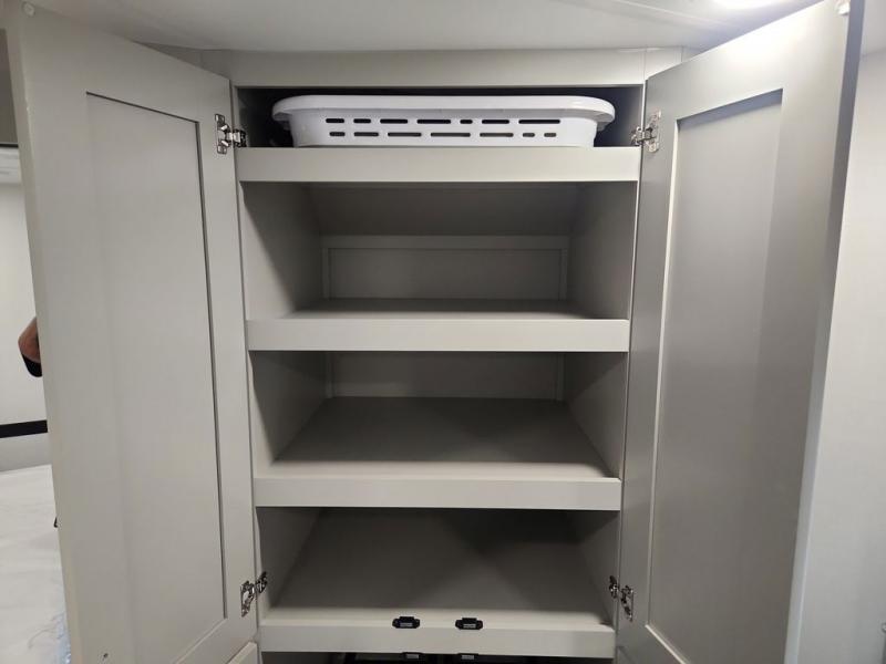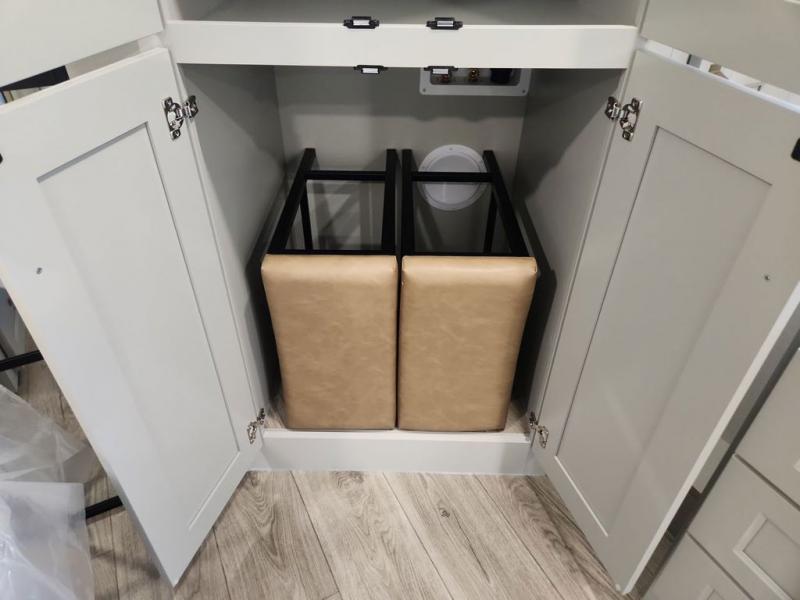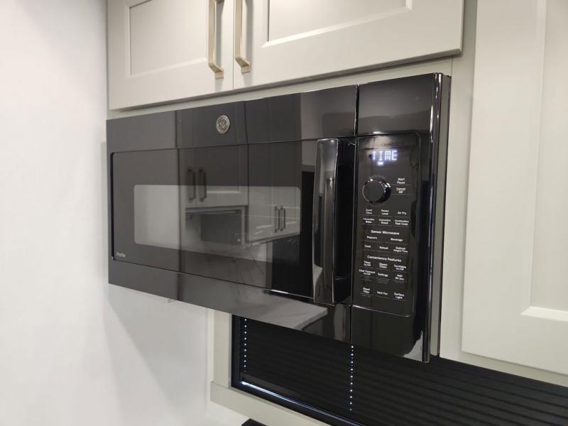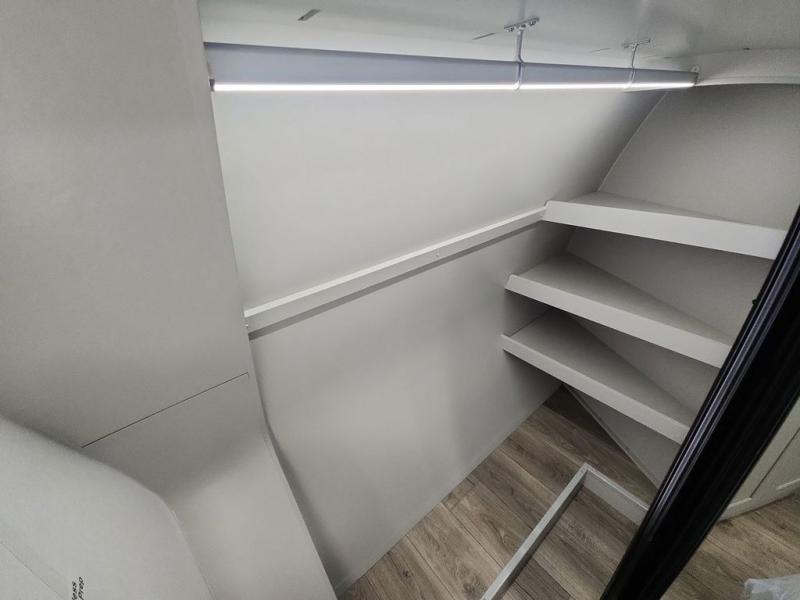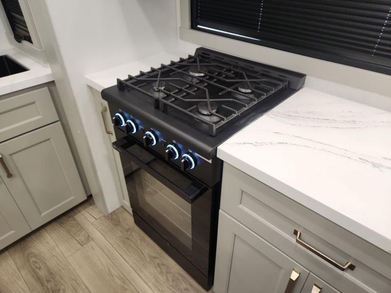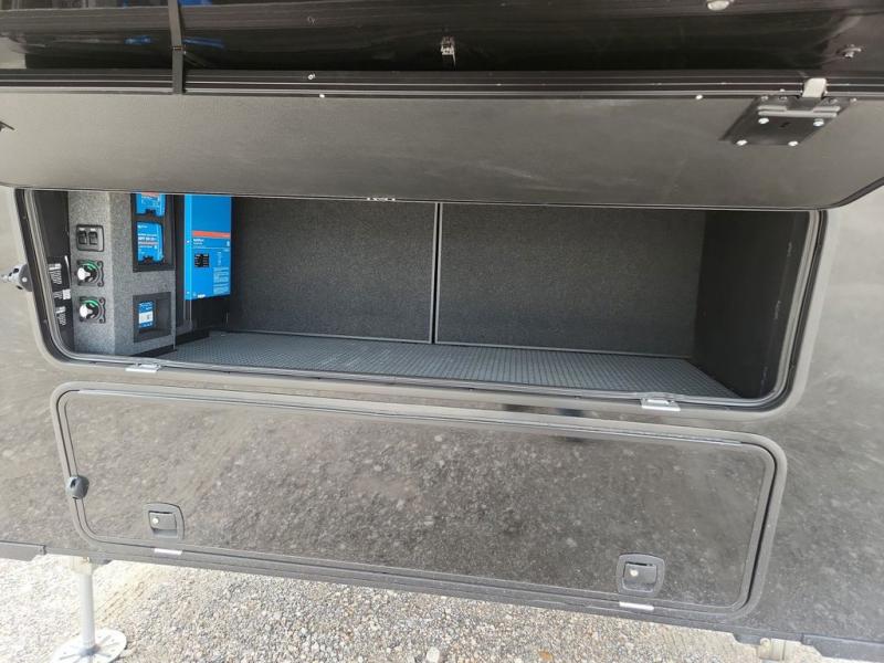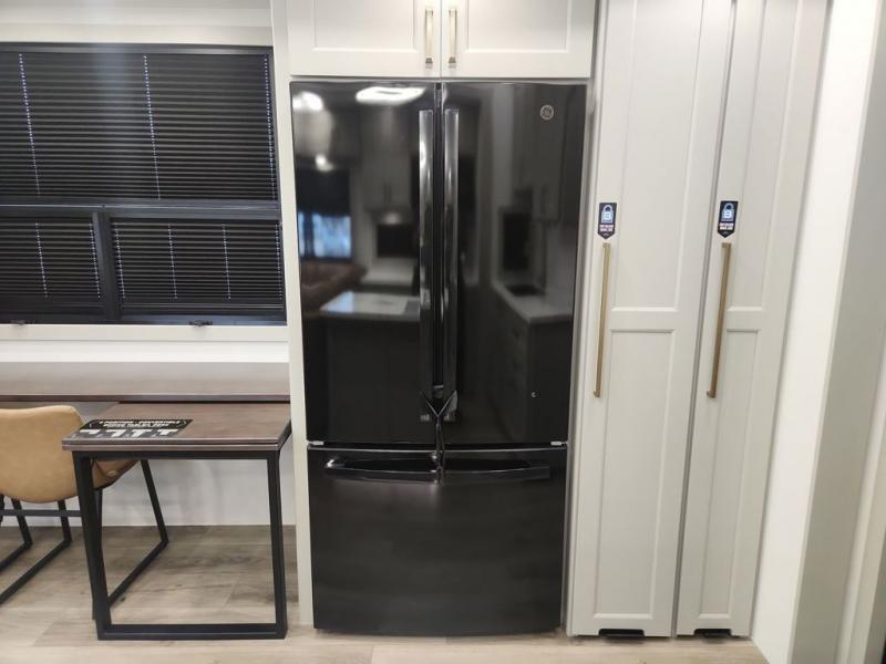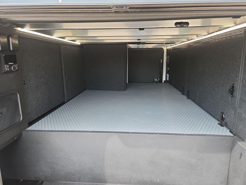This toy hauler may just be the one you've been looking for! The garage/flex space with fold-away half bath walls will allow you to utilize the garage how you need it, plus there is an adjustable tie-down system, independent dual sofas, plus a loft for storage and a twin bed to sleep more campers! The garage patio with a 1,500 lb. capacity is another feature you are sure to love, especially with its own awning to keep you protected from the elements. Head to the kitchen to prepare meals with a 24" GE oven with a four burner range, a GE microwave with an air fryer, plus a spacious GE Energy Star 19 cu. ft. refrigerator. The island with two stools will let others visit with you while you cook, and there are even hidden dog bowls. You'll find the convertible dining table/L-desk will be accommodating since it can be use to dine at, and to get some work done. You may just find yourselves spending most of your time on the L-sofa in front of the TV and fireplace. A full bath is up front by the bedroom, and here you'll find neon shower lighting, a residential shower system, and pull-out linen storage to keep towels ready to use. After a day outdoors you'll love nothing more than coming back to your own bedroom with a king bed slide out, TV, a walk-in closet, and many more storage spaces. And we haven't even touched on the exterior features, like the 3-way pass-through storage, three power awnings, an air compressor to fill up tires, and the list goes on and on!