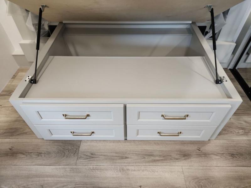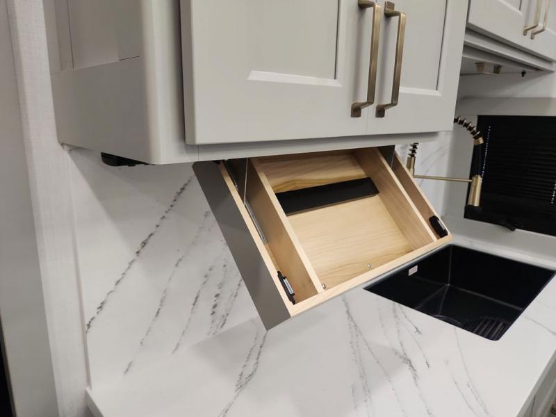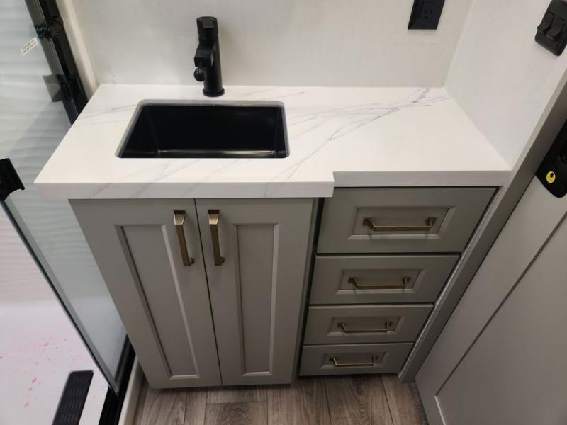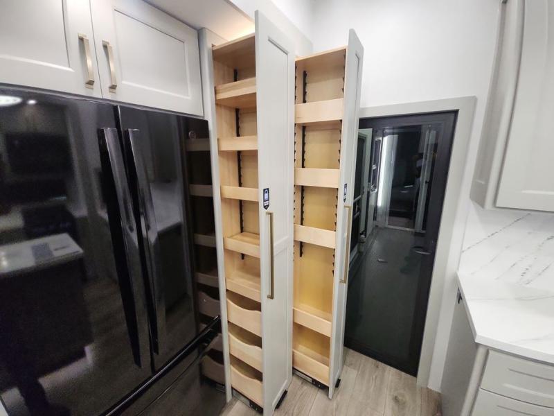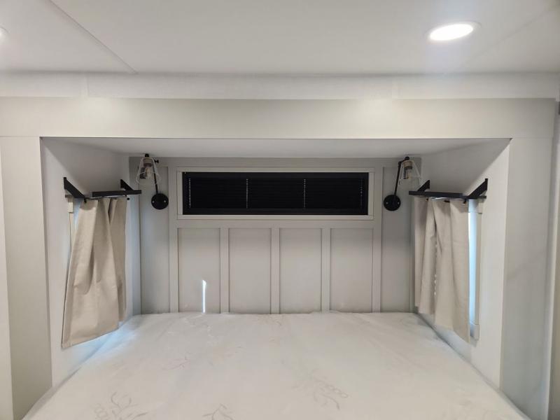 With any Model G toy hauler fifth wheel by Brinkley you will enjoy luxurious amenities, tons of storage space, and innovative features that have been developed and tested in the real world. Durable construction includes an industry leading PDI process, an industry best insulation package, and reinforced and walkable slide roofs. Some of the exterior features you'll find are a 3-way pass-through with a multi-functional flip-up bulkhead wall, under I-beam storage, a MAX-Vision reverse lighting system, and a low-maintenance roof to name a few. A Rockford Fosgate audio system comes standard, along with a OneControl app system that lets you control your fifth wheel's functions right from your mobile device. You will find the solar system with a designated storage area to be ultra convenient, plus there is a FlexPower 5500 with a dual fuel inverter generator for all your power needs. Head inside to find a residential interior with Brinkley's CraftSense wood trim construction, floating entrance steps, integrated window screens and insulated blackout blinds, and residential solid surface countertops plus backsplash. You will also enjoy the neon shower lighting and recessed medicine cabinets in the bath, plus motion activated LED bed lights and dual bedside outlets in the bedroom. Choose a Model G toy hauler fifth wheel to experience all the luxury it has to offer!