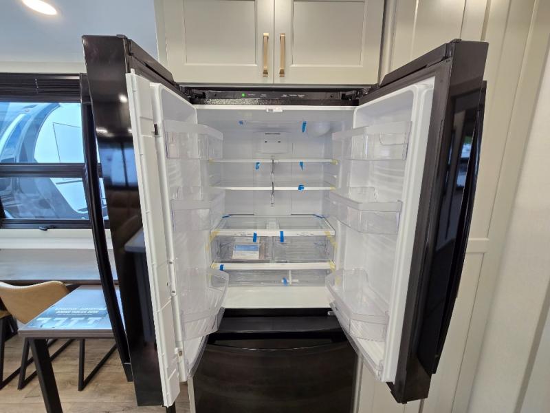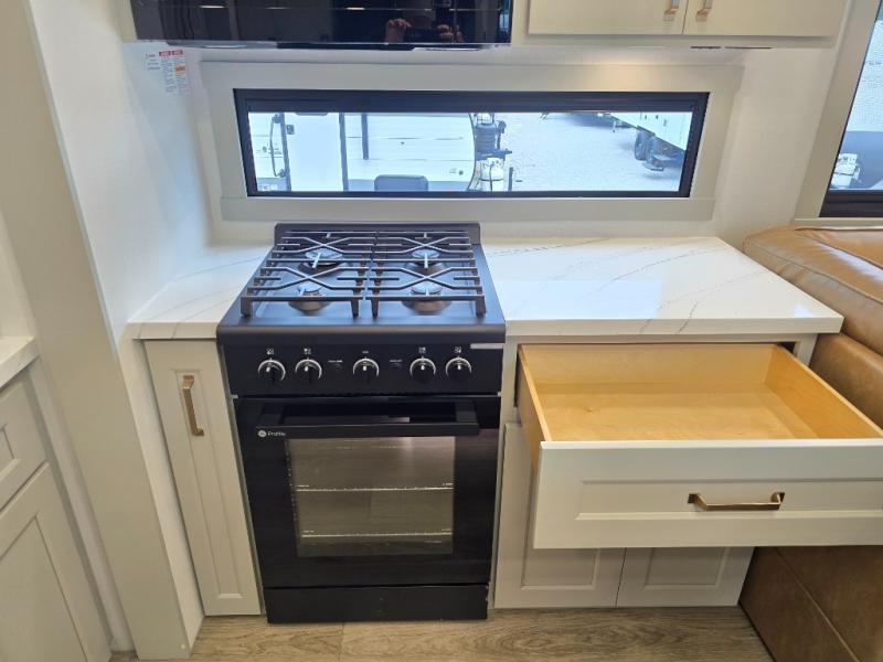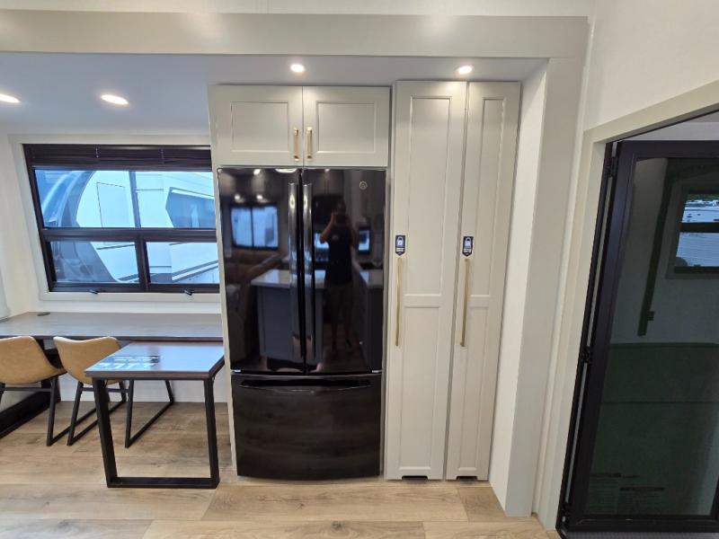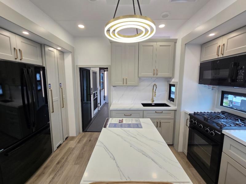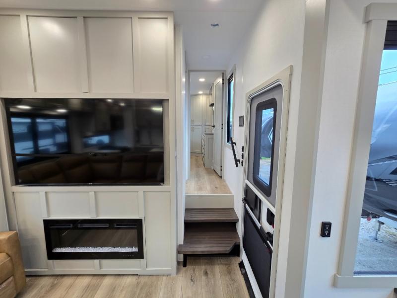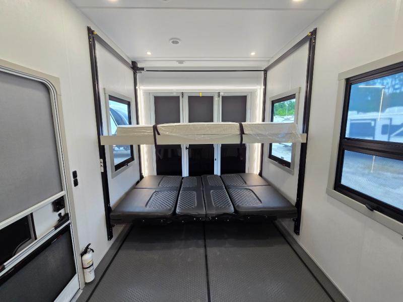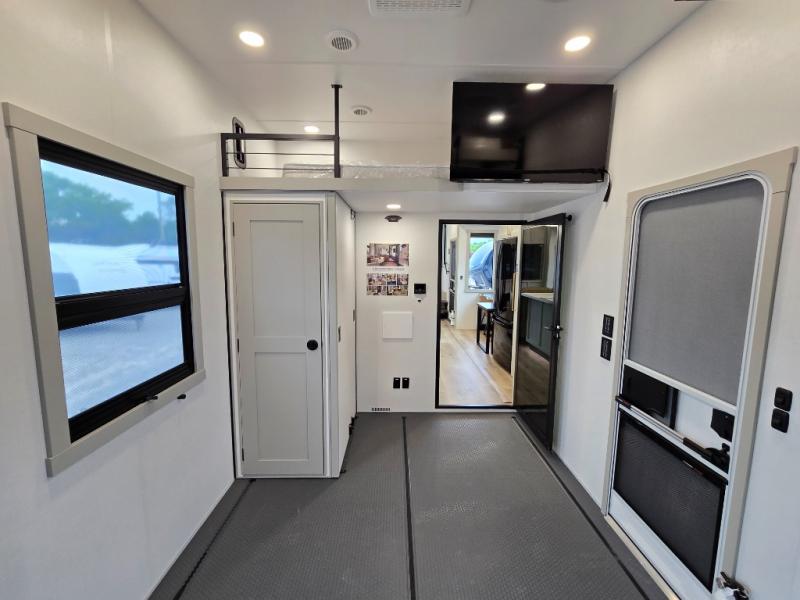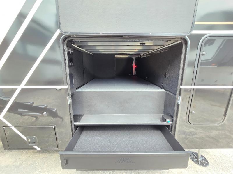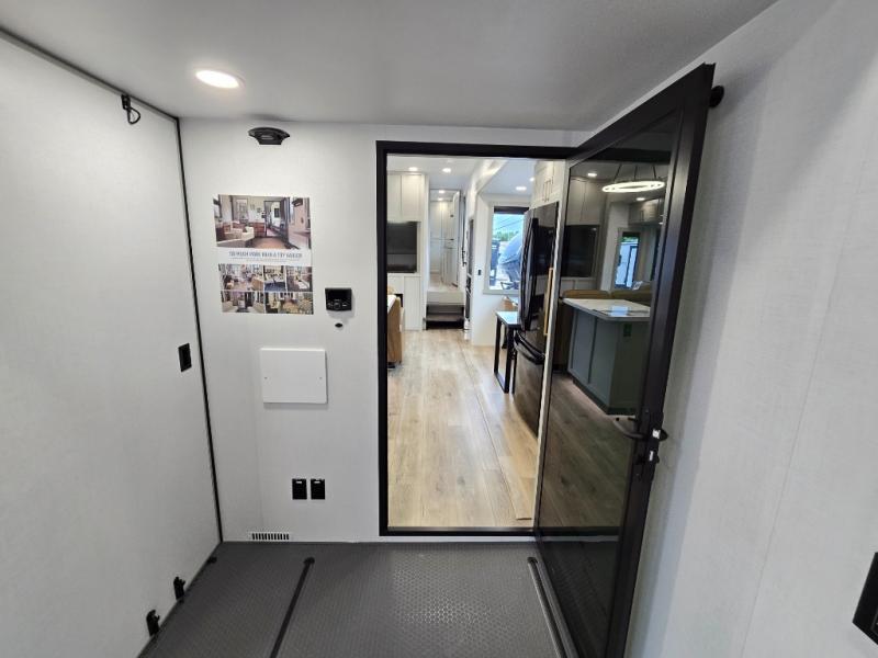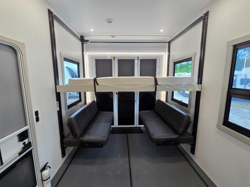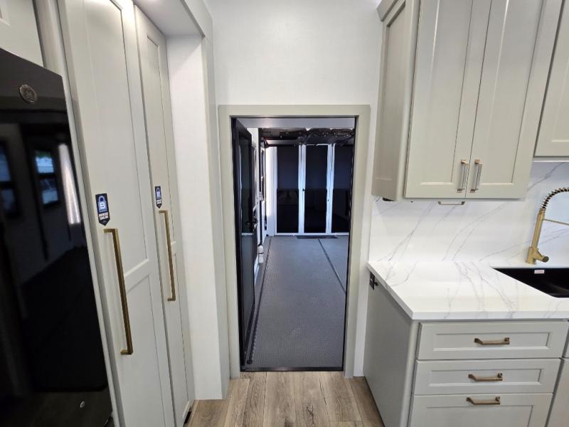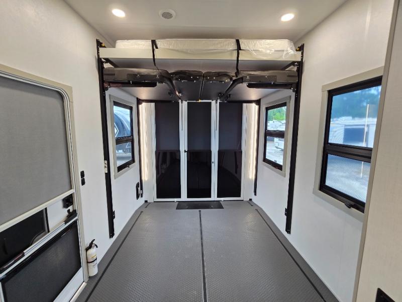 This toy hauler may just be the one you've been looking for! The garage/flex space with fold-away half bath walls will allow you to utilize the garage how you need it, plus there is an adjustable tie-down system, independent dual sofas, plus a loft for storage and a twin bed to sleep more campers! The garage patio with a 1,500 lb. capacity is another feature you are sure to love, especially with its own awning to keep you protected from the elements. Head to the kitchen to prepare meals with a 24" GE oven with a four burner range, a GE microwave with an air fryer, plus a spacious GE Energy Star 19 cu. ft. refrigerator. The island with two stools will let others visit with you while you cook, and there are even hidden dog bowls. You'll find the convertible dining table/L-desk will be accommodating since it can be use to dine at, and to get some work done. You may just find yourselves spending most of your time on the L-sofa in front of the TV and fireplace. A full bath is up front by the bedroom, and here you'll find neon shower lighting, a residential shower system, and pull-out linen storage to keep towels ready to use. After a day outdoors you'll love nothing more than coming back to your own bedroom with a king bed slide out, TV, a walk-in closet, and many more storage spaces. And we haven't even touched on the exterior features, like the 3-way pass-through storage, three power awnings, an air compressor to fill up tires, and the list goes on and on!