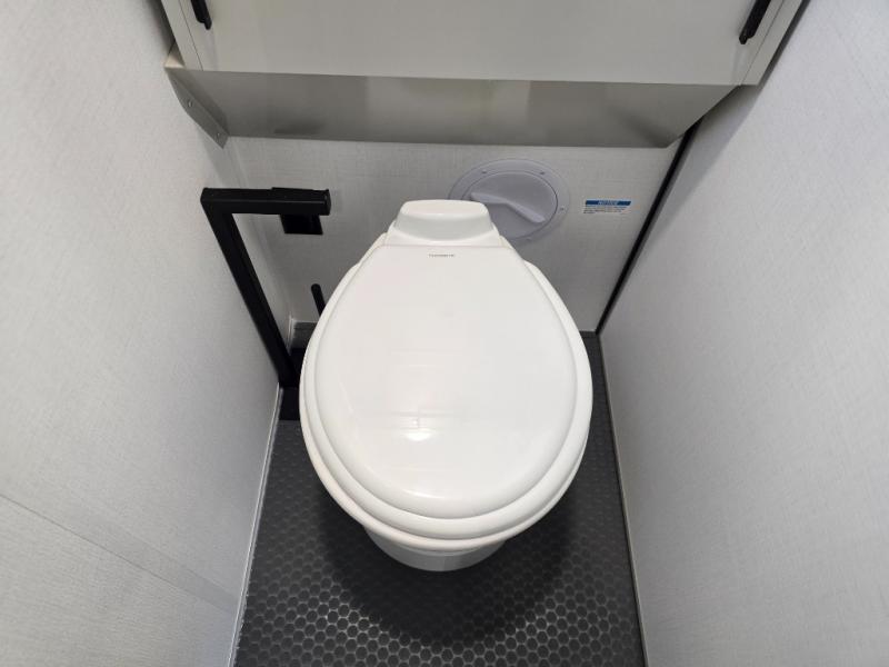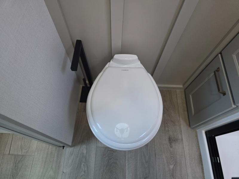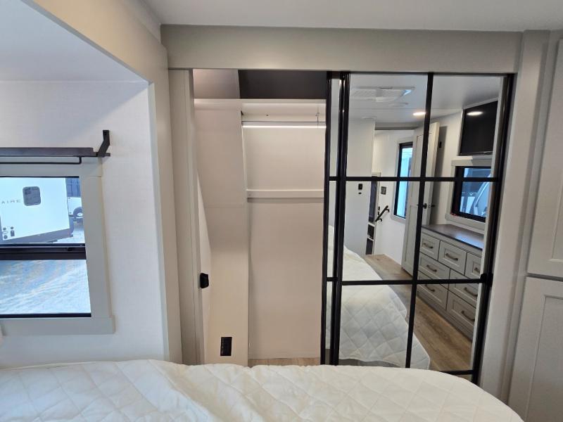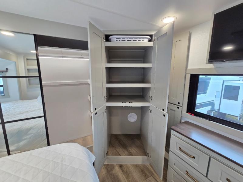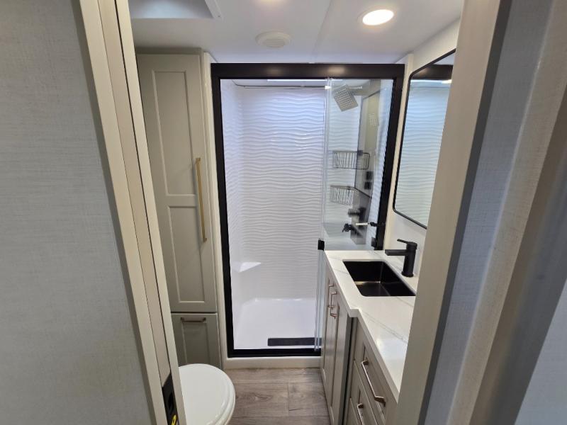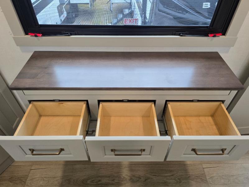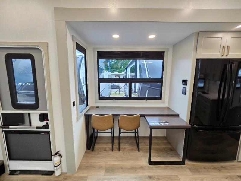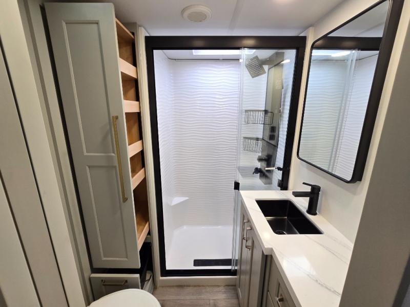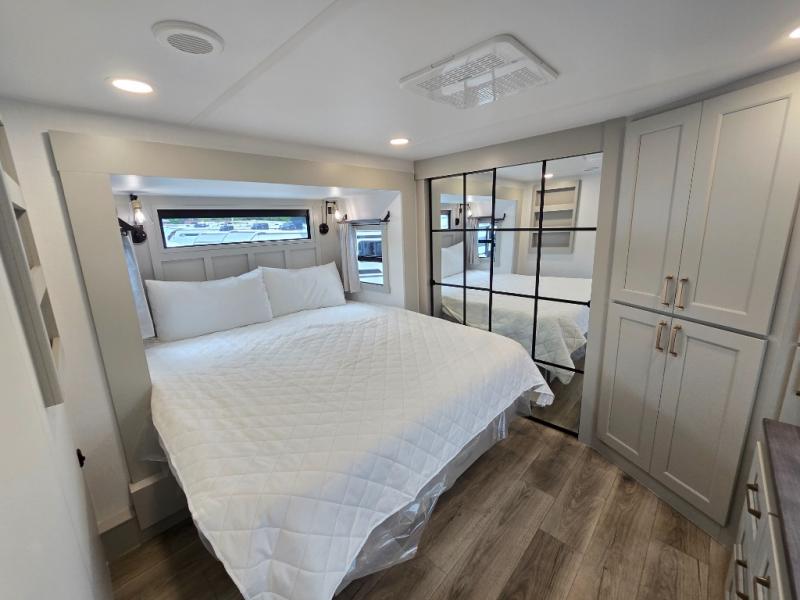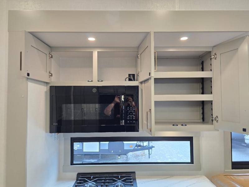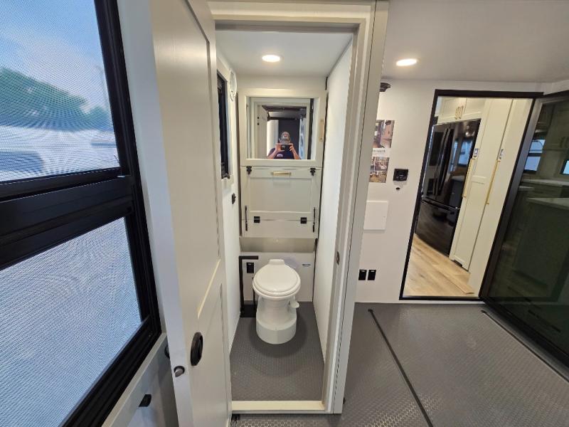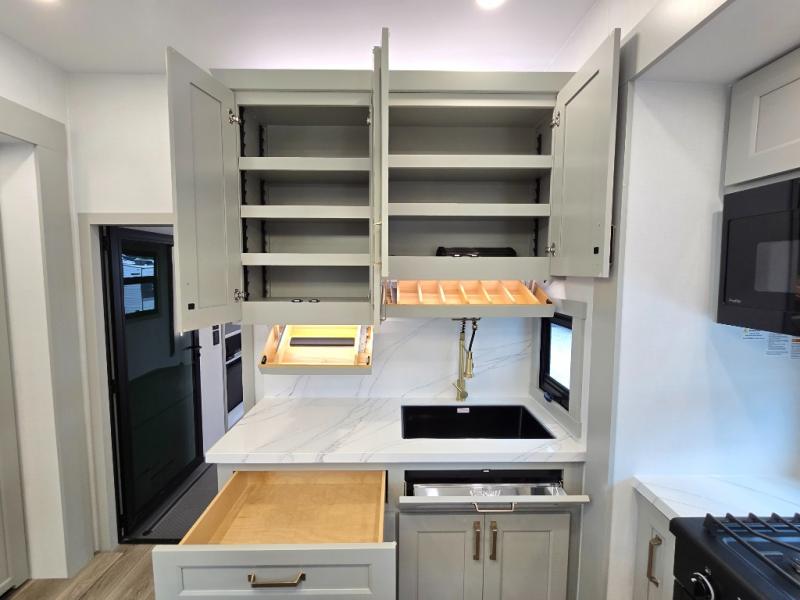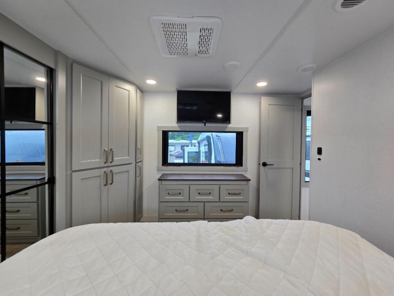 This toy hauler may just be the one you've been looking for! The garage/flex space with fold-away half bath walls will allow you to utilize the garage how you need it, plus there is an adjustable tie-down system, independent dual sofas, plus a loft for storage and a twin bed to sleep more campers! The garage patio with a 1,500 lb. capacity is another feature you are sure to love, especially with its own awning to keep you protected from the elements. Head to the kitchen to prepare meals with a 24" GE oven with a four burner range, a GE microwave with an air fryer, plus a spacious GE Energy Star 19 cu. ft. refrigerator. The island with two stools will let others visit with you while you cook, and there are even hidden dog bowls. You'll find the convertible dining table/L-desk will be accommodating since it can be use to dine at, and to get some work done. You may just find yourselves spending most of your time on the L-sofa in front of the TV and fireplace. A full bath is up front by the bedroom, and here you'll find neon shower lighting, a residential shower system, and pull-out linen storage to keep towels ready to use. After a day outdoors you'll love nothing more than coming back to your own bedroom with a king bed slide out, TV, a walk-in closet, and many more storage spaces. And we haven't even touched on the exterior features, like the 3-way pass-through storage, three power awnings, an air compressor to fill up tires, and the list goes on and on!