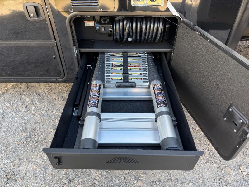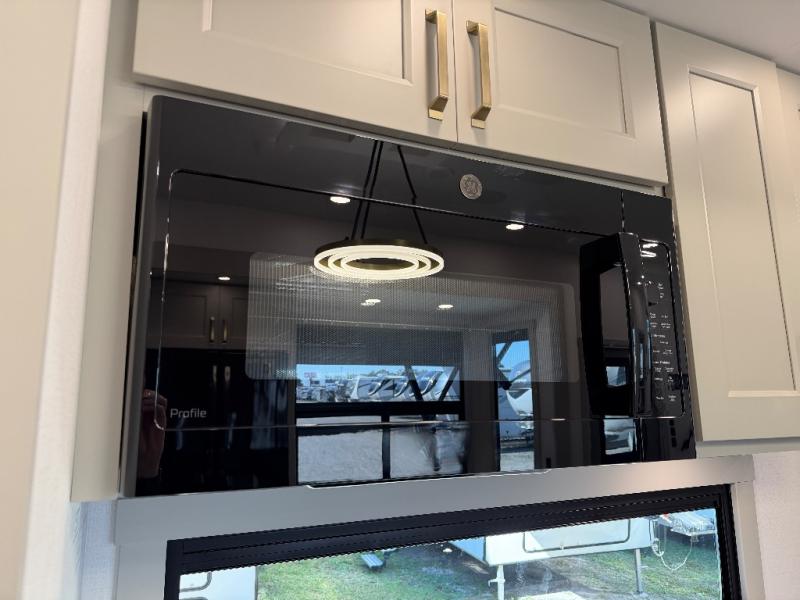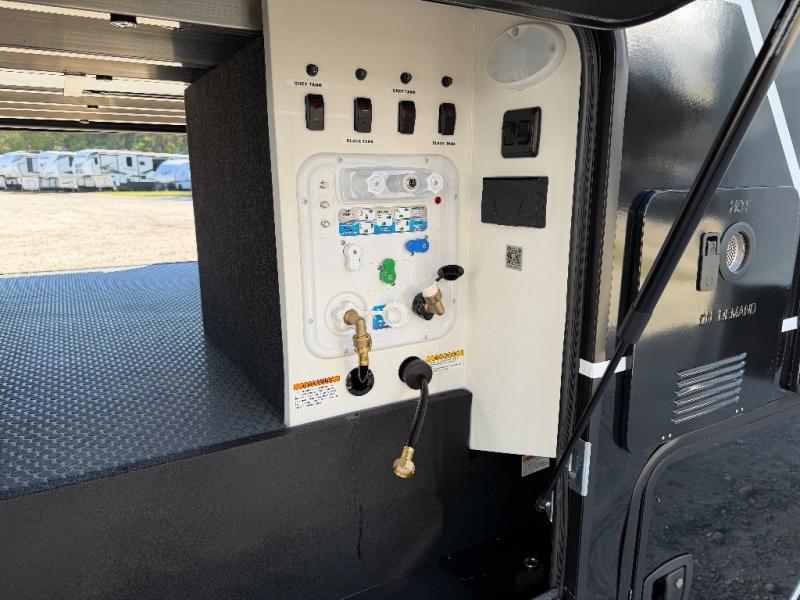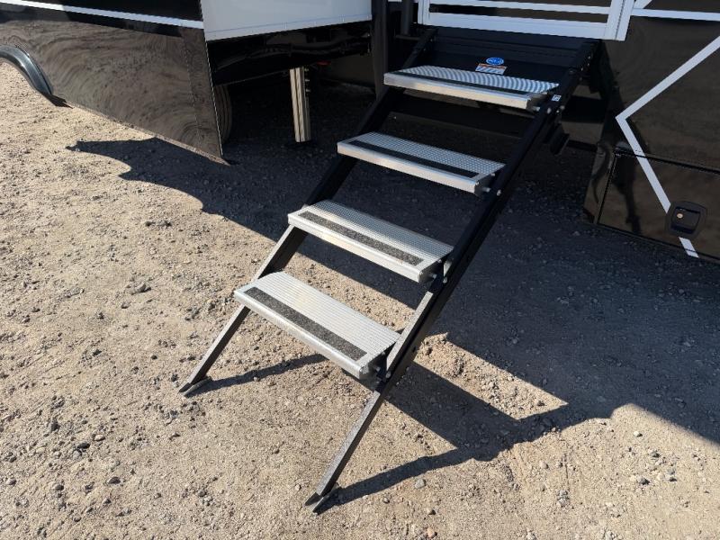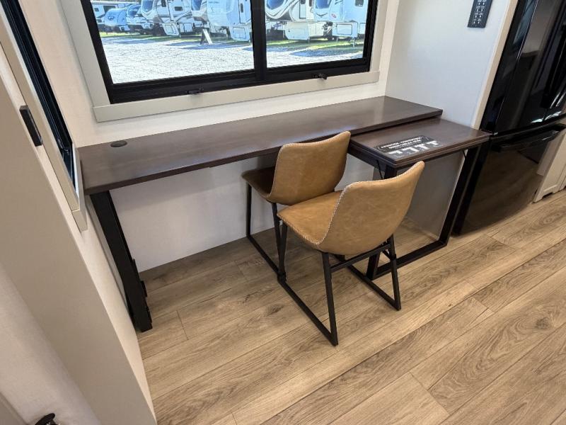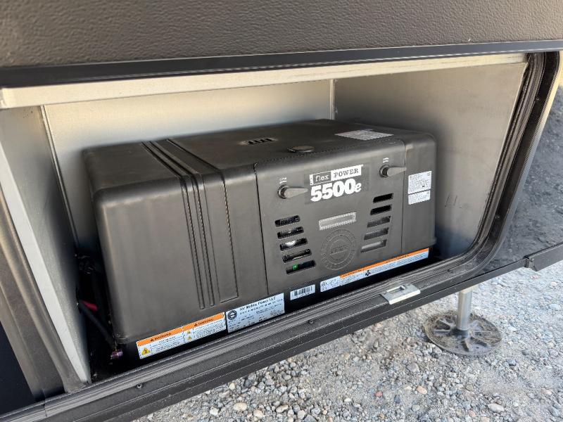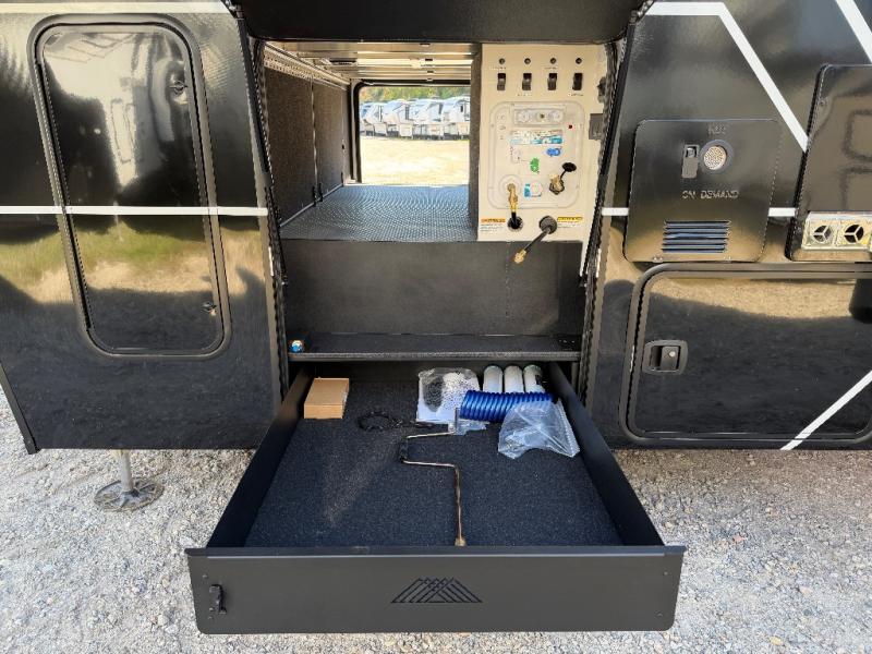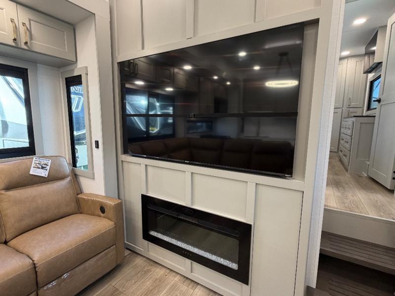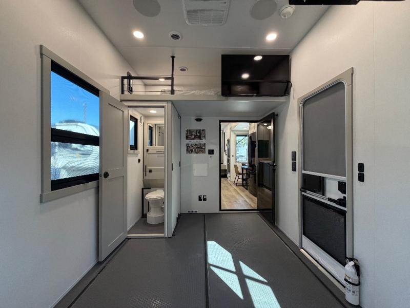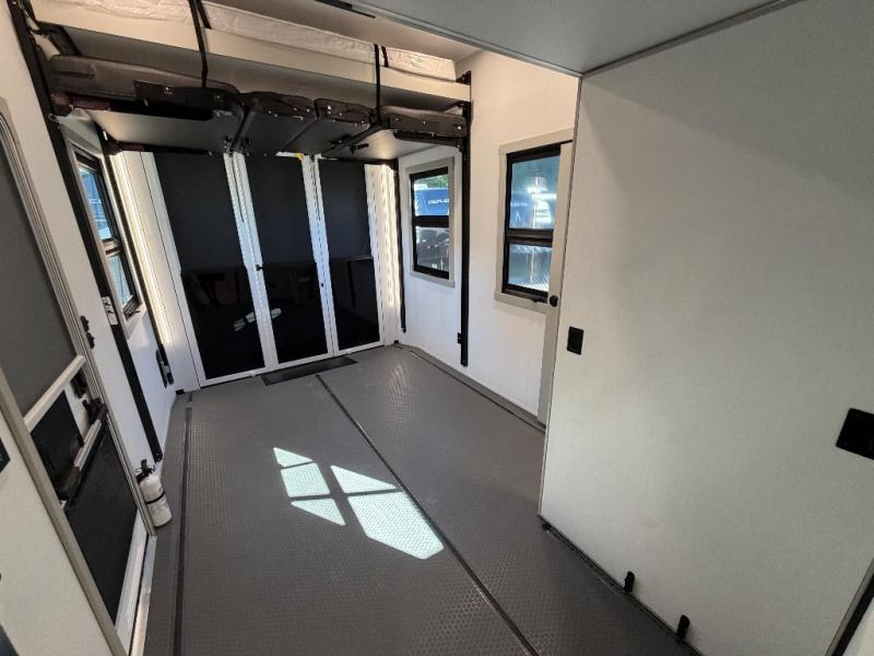 This toy hauler may just be the one you've been looking for! The garage/flex space with fold-away half bath walls will allow you to utilize the garage how you need it, plus there is an adjustable tie-down system, independent dual sofas, plus a loft for storage and a twin bed to sleep more campers! The garage patio with a 1,500 lb. capacity is another feature you are sure to love, especially with its own awning to keep you protected from the elements. Head to the kitchen to prepare meals with a 24" GE oven with a four burner range, a GE microwave with an air fryer, plus a spacious GE Energy Star 19 cu. ft. refrigerator. The island with two stools will let others visit with you while you cook, and there are even hidden dog bowls. You'll find the convertible dining table/L-desk will be accommodating since it can be use to dine at, and to get some work done. You may just find yourselves spending most of your time on the L-sofa in front of the TV and fireplace. A full bath is up front by the bedroom, and here you'll find neon shower lighting, a residential shower system, and pull-out linen storage to keep towels ready to use. After a day outdoors you'll love nothing more than coming back to your own bedroom with a king bed slide out, TV, a walk-in closet, and many more storage spaces. And we haven't even touched on the exterior features, like the 3-way pass-through storage, three power awnings, an air compressor to fill up tires, and the list goes on and on!
