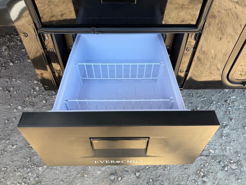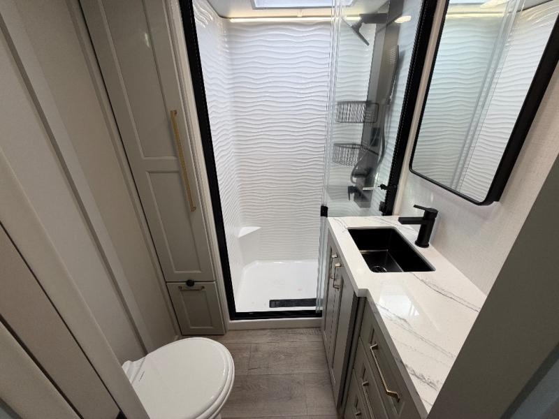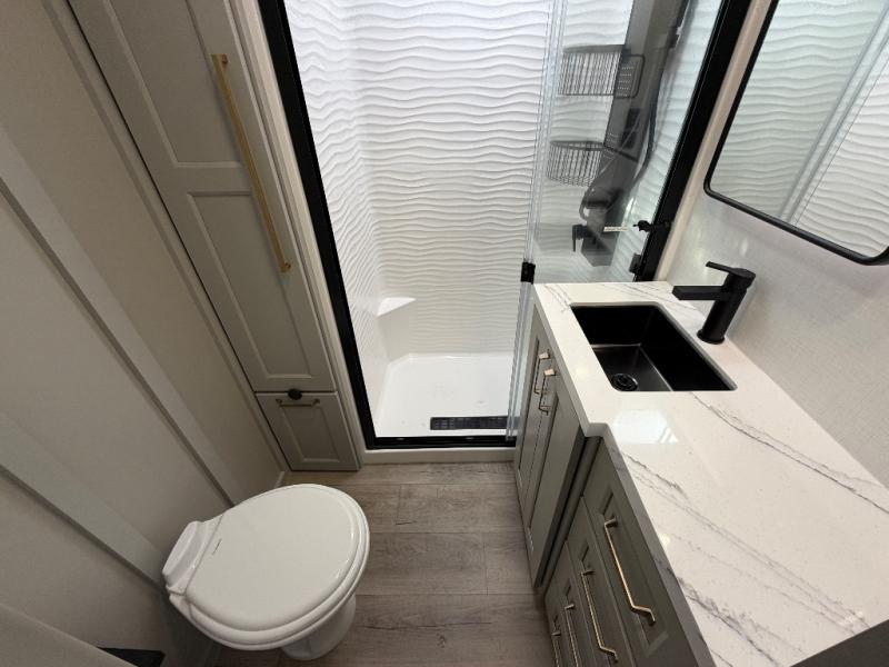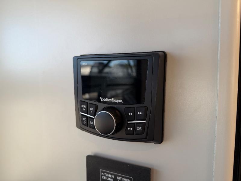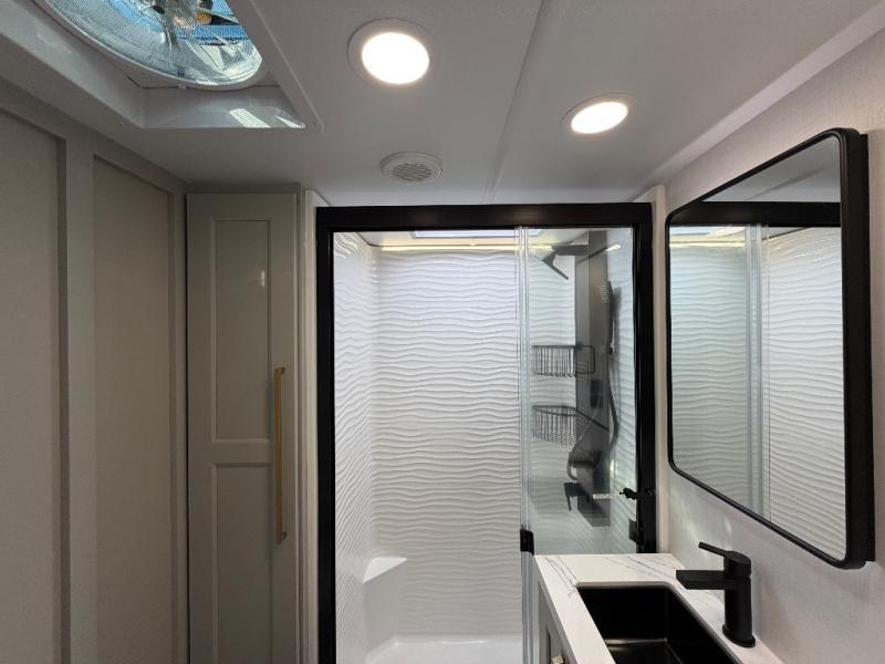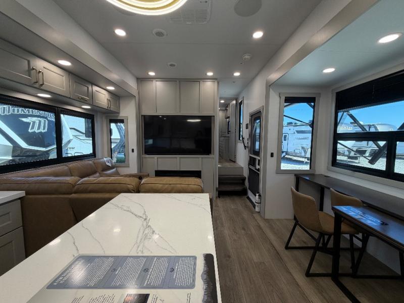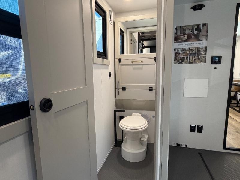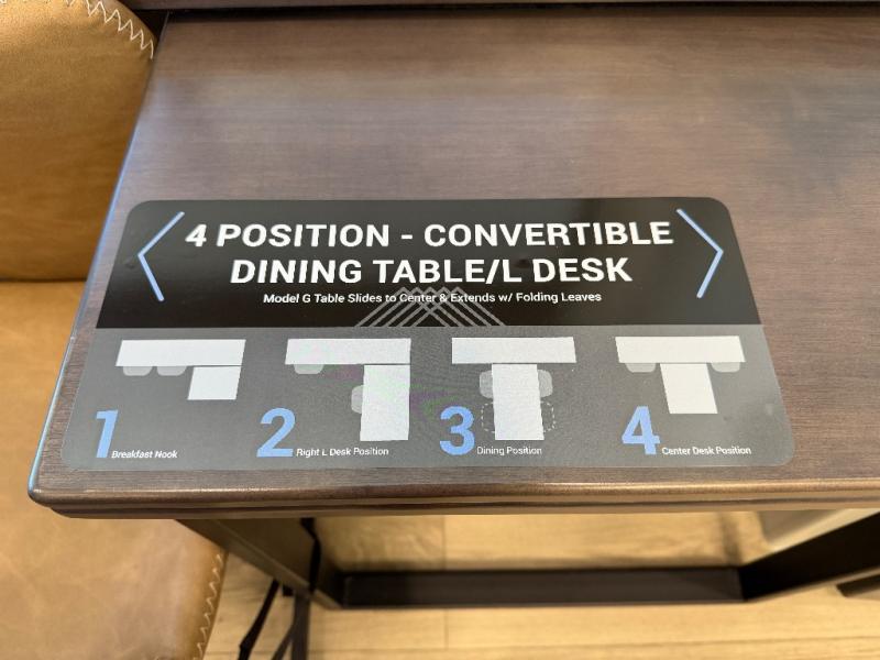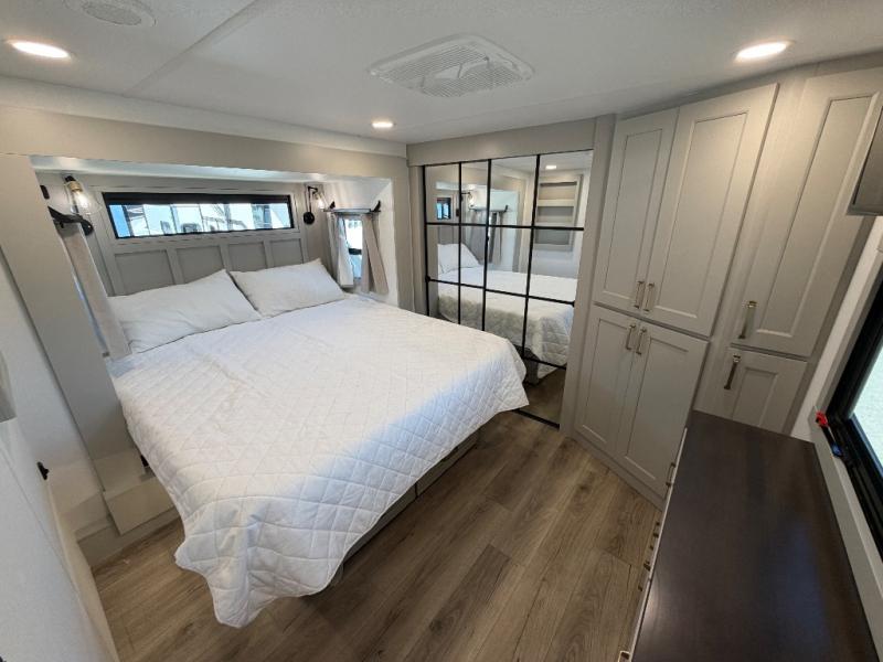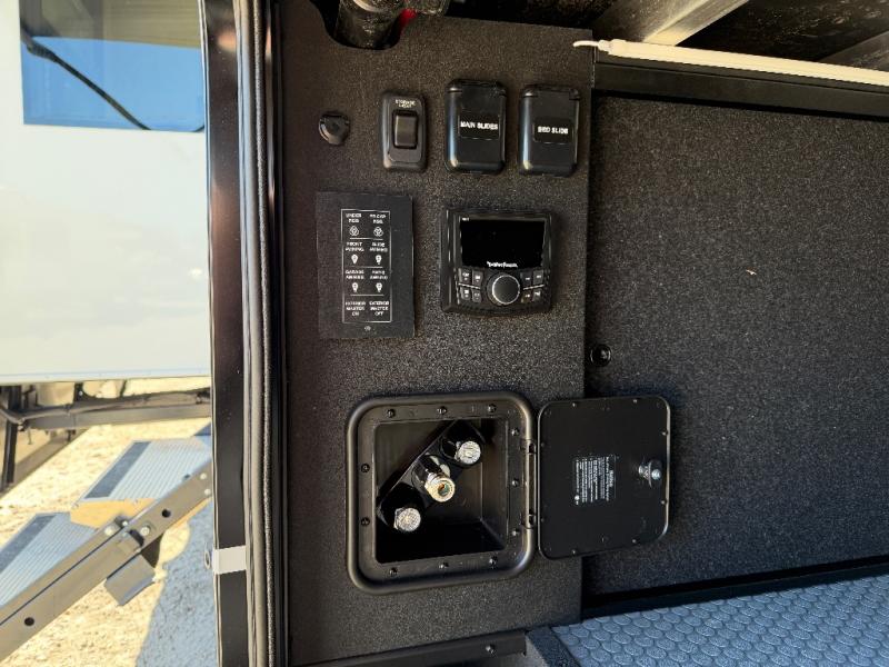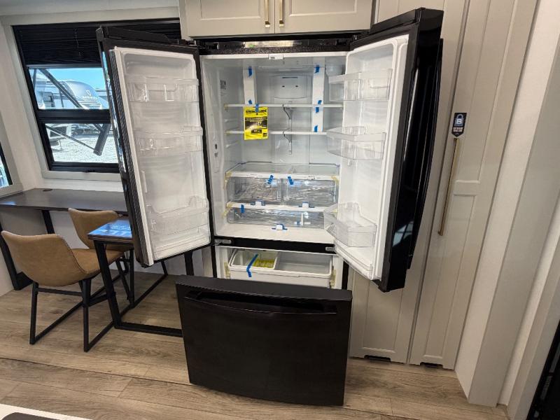 This toy hauler may just be the one you've been looking for! The garage/flex space with fold-away half bath walls will allow you to utilize the garage how you need it, plus there is an adjustable tie-down system, independent dual sofas, plus a loft for storage and a twin bed to sleep more campers! The garage patio with a 1,500 lb. capacity is another feature you are sure to love, especially with its own awning to keep you protected from the elements. Head to the kitchen to prepare meals with a 24" GE oven with a four burner range, a GE microwave with an air fryer, plus a spacious GE Energy Star 19 cu. ft. refrigerator. The island with two stools will let others visit with you while you cook, and there are even hidden dog bowls. You'll find the convertible dining table/L-desk will be accommodating since it can be use to dine at, and to get some work done. You may just find yourselves spending most of your time on the L-sofa in front of the TV and fireplace. A full bath is up front by the bedroom, and here you'll find neon shower lighting, a residential shower system, and pull-out linen storage to keep towels ready to use. After a day outdoors you'll love nothing more than coming back to your own bedroom with a king bed slide out, TV, a walk-in closet, and many more storage spaces. And we haven't even touched on the exterior features, like the 3-way pass-through storage, three power awnings, an air compressor to fill up tires, and the list goes on and on!