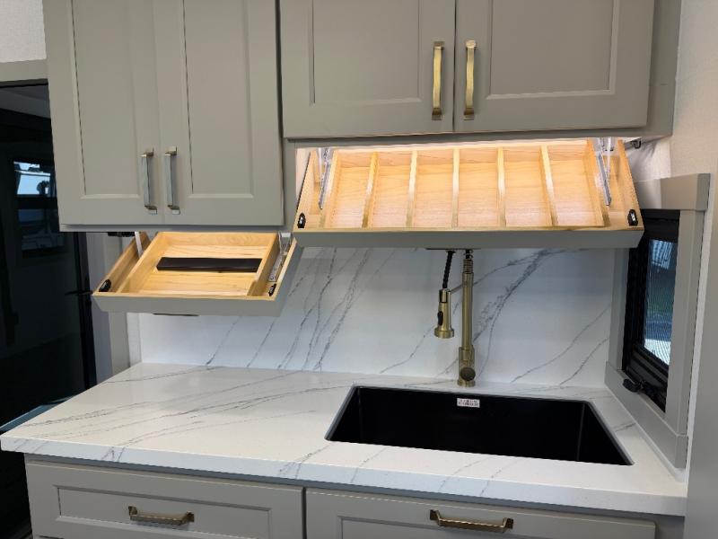 With any Model G toy hauler fifth wheel by Brinkley you will enjoy luxurious amenities, tons of storage space, and innovative features that have been developed and tested in the real world. Durable construction includes an industry leading PDI process, an industry best insulation package, and reinforced and walkable slide roofs. Some of the exterior features you'll find are a 3-way pass-through with a multi-functional flip-up bulkhead wall, under I-beam storage, a MAX-Vision reverse lighting system, and a low-maintenance roof to name a few. A Rockford Fosgate audio system comes standard, along with a OneControl app system that lets you control your fifth wheel's functions right from your mobile device. You will find the solar system with a designated storage area to be ultra convenient, plus there is a FlexPower 5500 with a dual fuel inverter generator for all your power needs. Head inside to find a residential interior with Brinkley's CraftSense wood trim construction, floating entrance steps, integrated window screens and insulated blackout blinds, and residential solid surface countertops plus backsplash. You will also enjoy the neon shower lighting and recessed medicine cabinets in the bath, plus motion activated LED bed lights and dual bedside outlets in the bedroom. Choose a Model G toy hauler fifth wheel to experience all the luxury it has to offer!