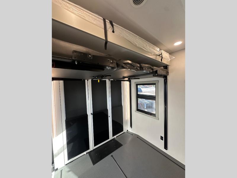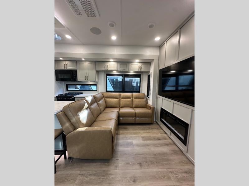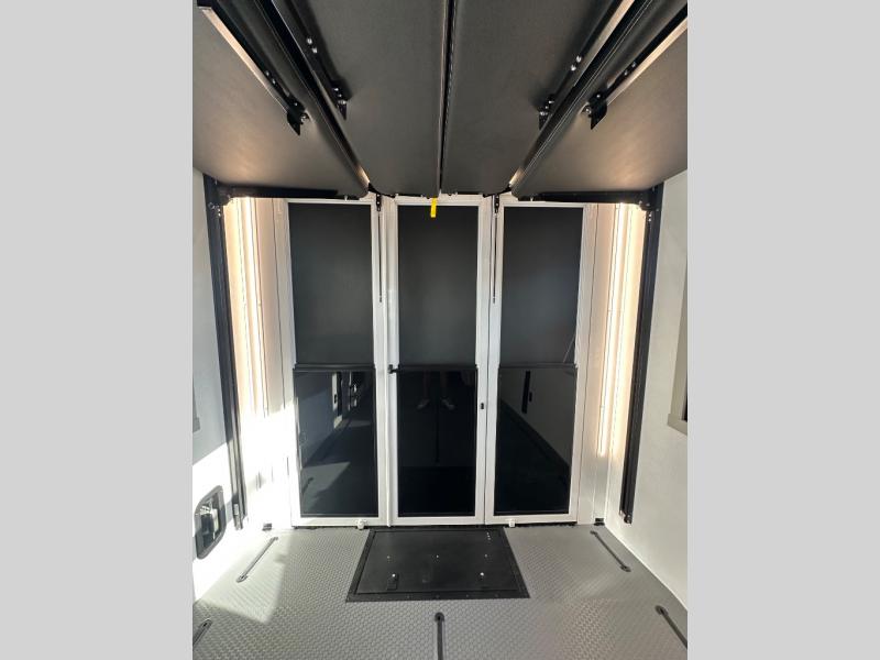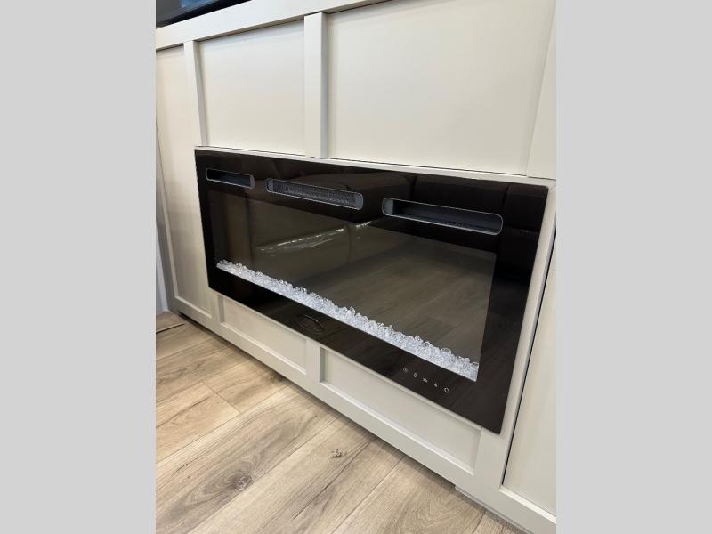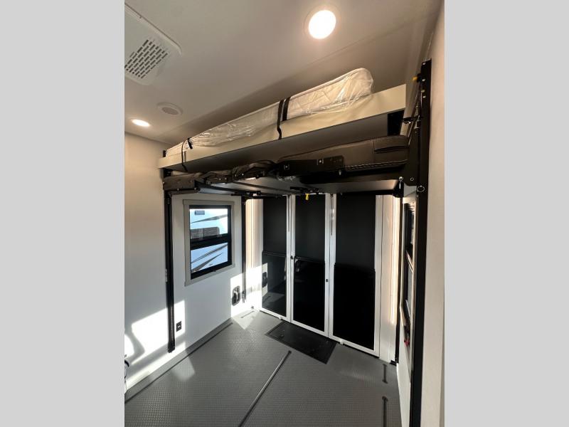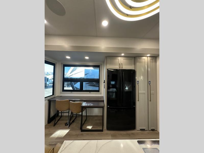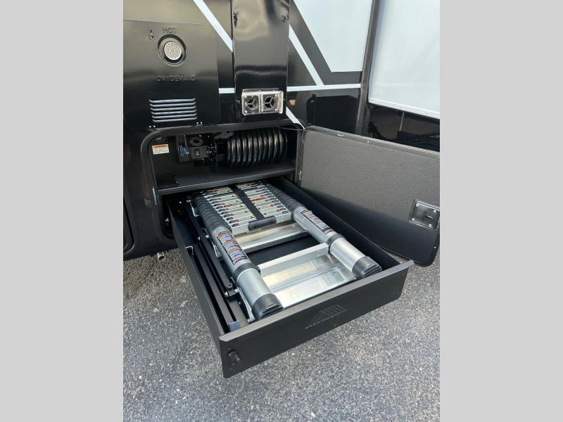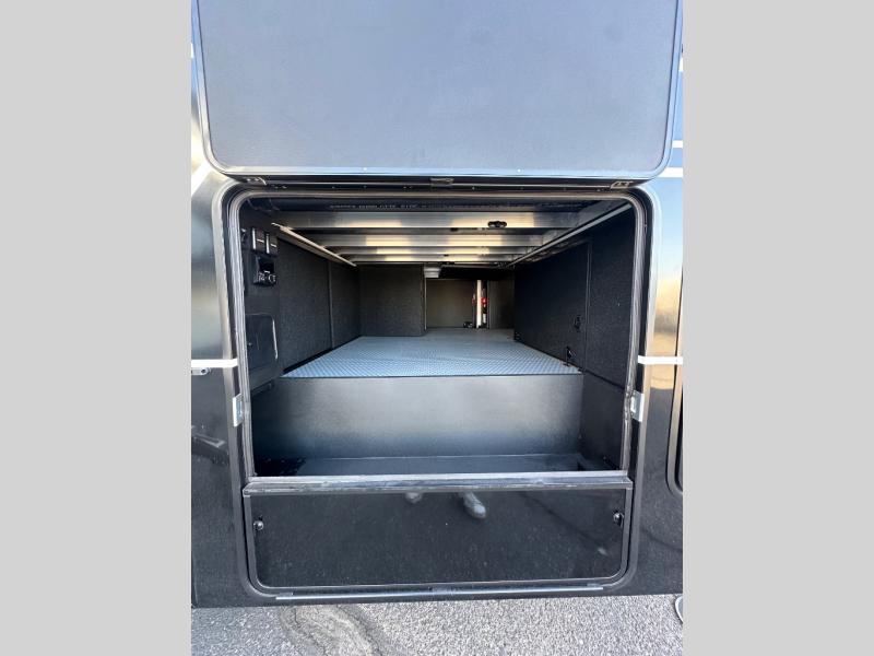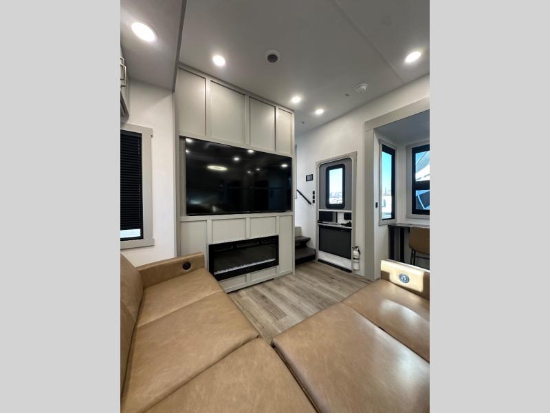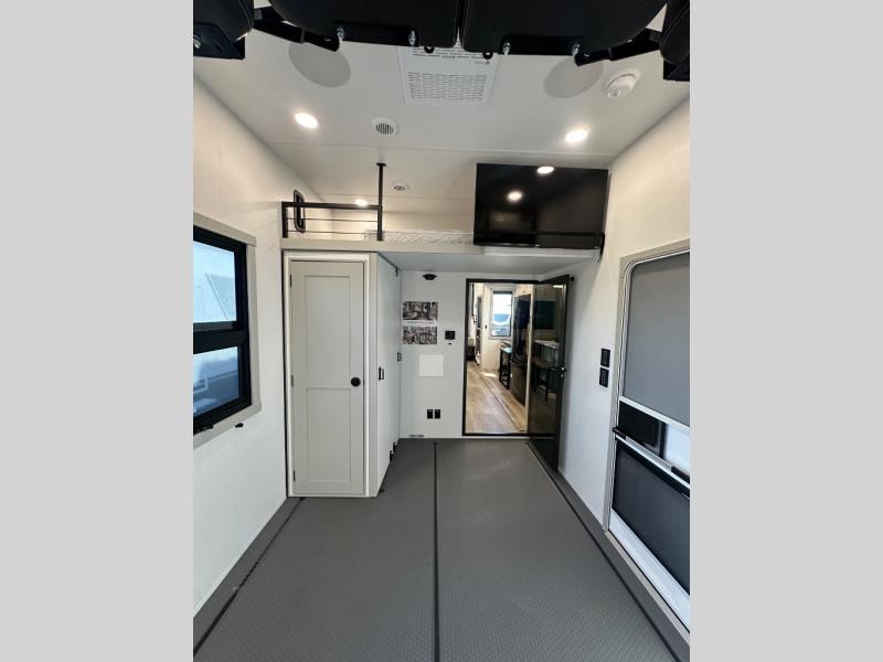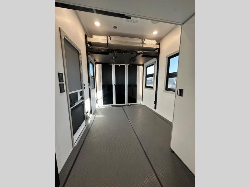 This toy hauler may just be the one you've been looking for! The garage/flex space with fold-away half bath walls will allow you to utilize the garage how you need it, plus there is an adjustable tie-down system, independent dual sofas, plus a loft for storage and a twin bed to sleep more campers! The garage patio with a 1,500 lb. capacity is another feature you are sure to love, especially with its own awning to keep you protected from the elements. Head to the kitchen to prepare meals with a 24" GE oven with a four burner range, a GE microwave with an air fryer, plus a spacious GE Energy Star 19 cu. ft. refrigerator. The island with two stools will let others visit with you while you cook, and there are even hidden dog bowls. You'll find the convertible dining table/L-desk will be accommodating since it can be use to dine at, and to get some work done. You may just find yourselves spending most of your time on the L-sofa in front of the TV and fireplace. A full bath is up front by the bedroom, and here you'll find neon shower lighting, a residential shower system, and pull-out linen storage to keep towels ready to use. After a day outdoors you'll love nothing more than coming back to your own bedroom with a king bed slide out, TV, a walk-in closet, and many more storage spaces. And we haven't even touched on the exterior features, like the 3-way pass-through storage, three power awnings, an air compressor to fill up tires, and the list goes on and on!