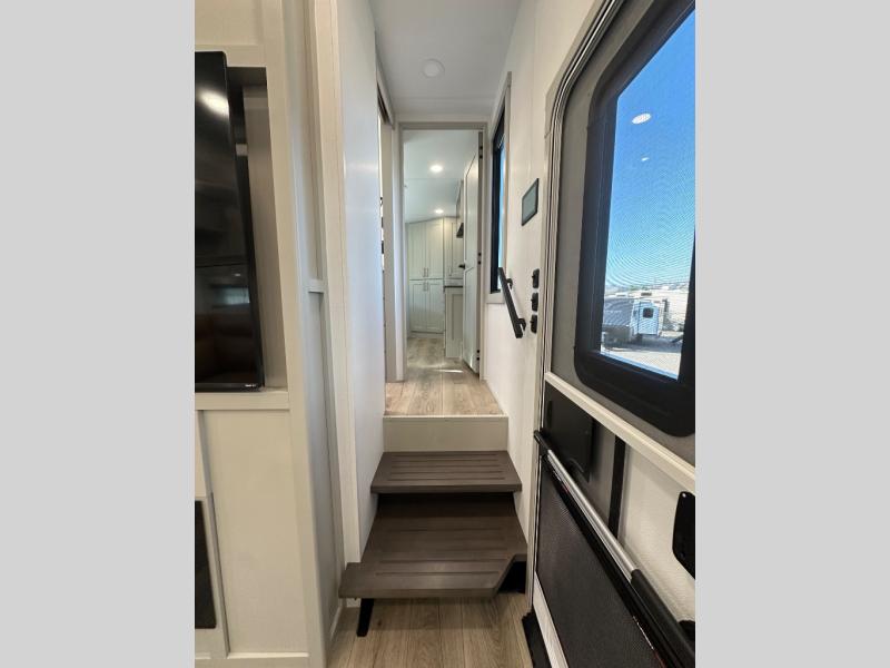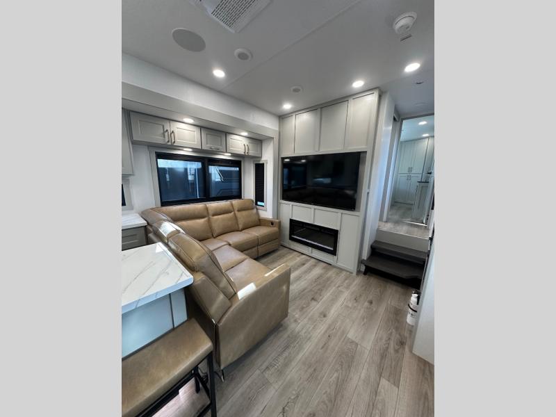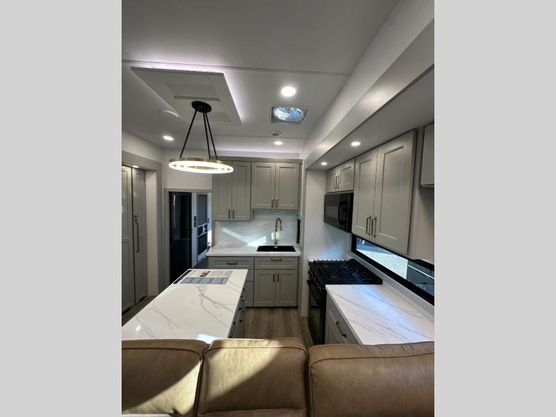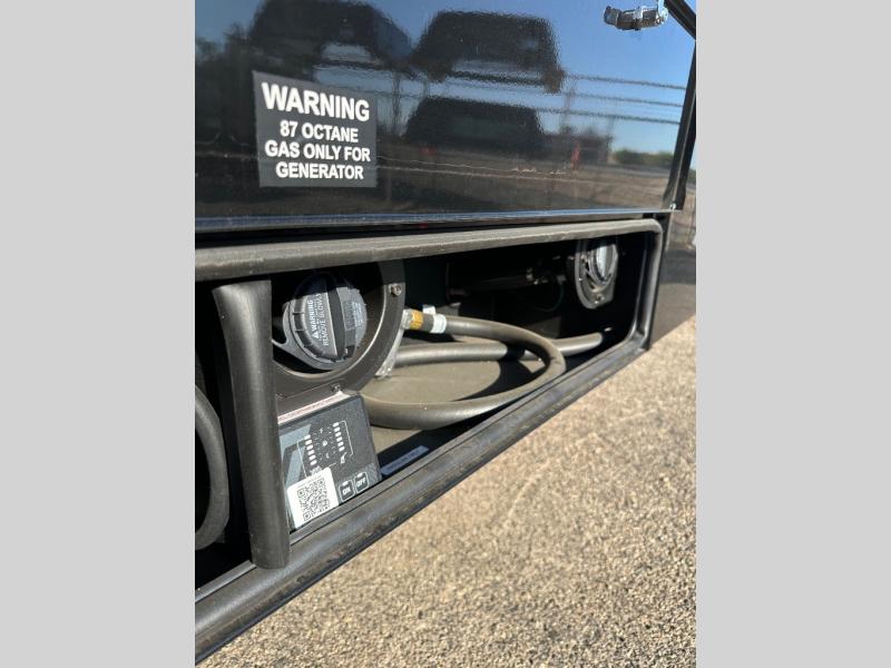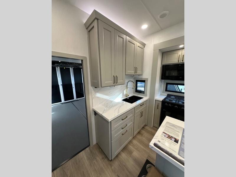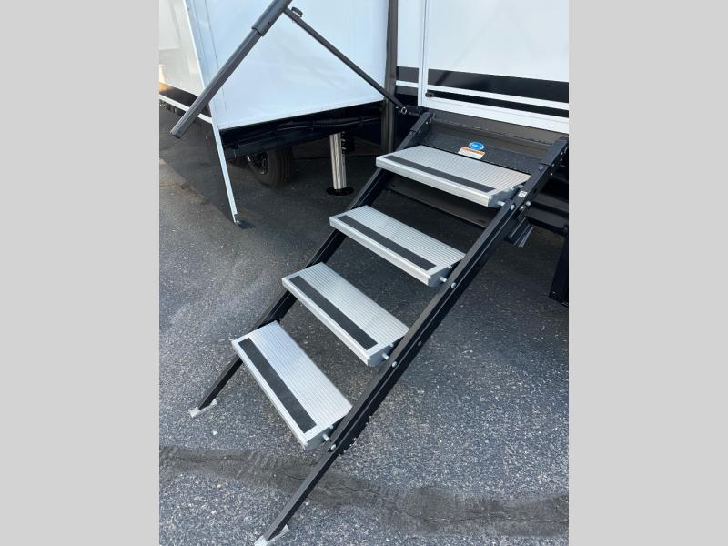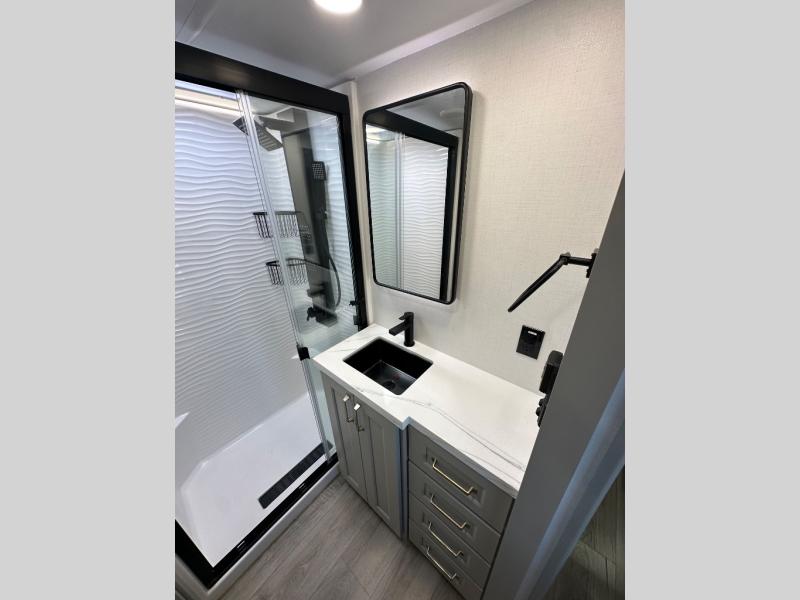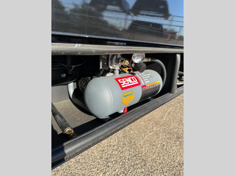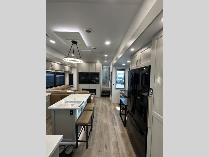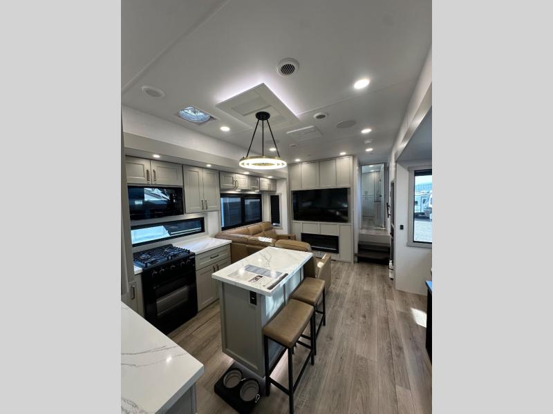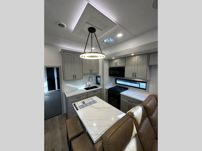 This toy hauler may just be the one you've been looking for! The garage/flex space with fold-away half bath walls will allow you to utilize the garage how you need it, plus there is an adjustable tie-down system, independent dual sofas, plus a loft for storage and a twin bed to sleep more campers! The garage patio with a 1,500 lb. capacity is another feature you are sure to love, especially with its own awning to keep you protected from the elements. Head to the kitchen to prepare meals with a 24" GE oven with a four burner range, a GE microwave with an air fryer, plus a spacious GE Energy Star 19 cu. ft. refrigerator. The island with two stools will let others visit with you while you cook, and there are even hidden dog bowls. You'll find the convertible dining table/L-desk will be accommodating since it can be use to dine at, and to get some work done. You may just find yourselves spending most of your time on the L-sofa in front of the TV and fireplace. A full bath is up front by the bedroom, and here you'll find neon shower lighting, a residential shower system, and pull-out linen storage to keep towels ready to use. After a day outdoors you'll love nothing more than coming back to your own bedroom with a king bed slide out, TV, a walk-in closet, and many more storage spaces. And we haven't even touched on the exterior features, like the 3-way pass-through storage, three power awnings, an air compressor to fill up tires, and the list goes on and on!