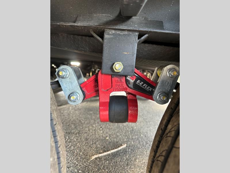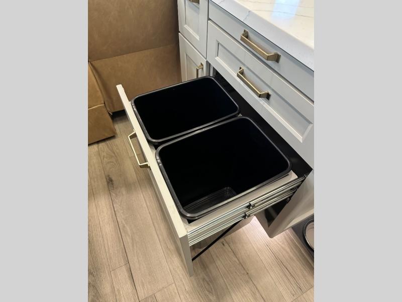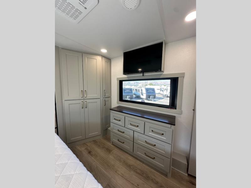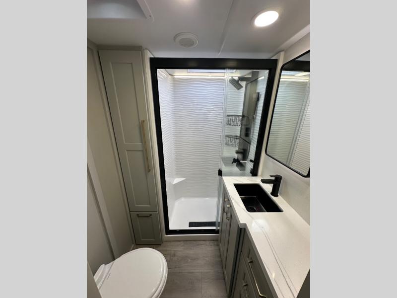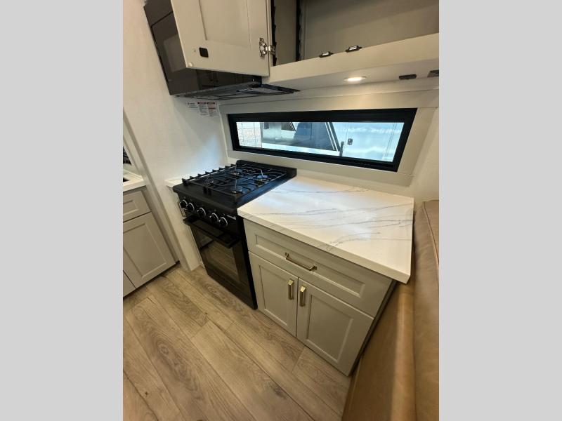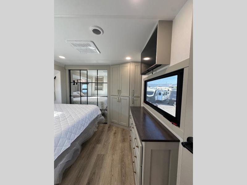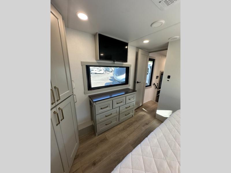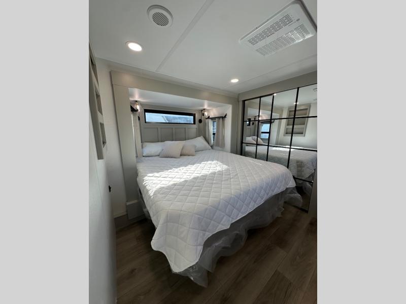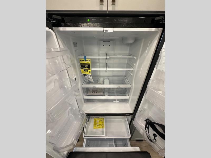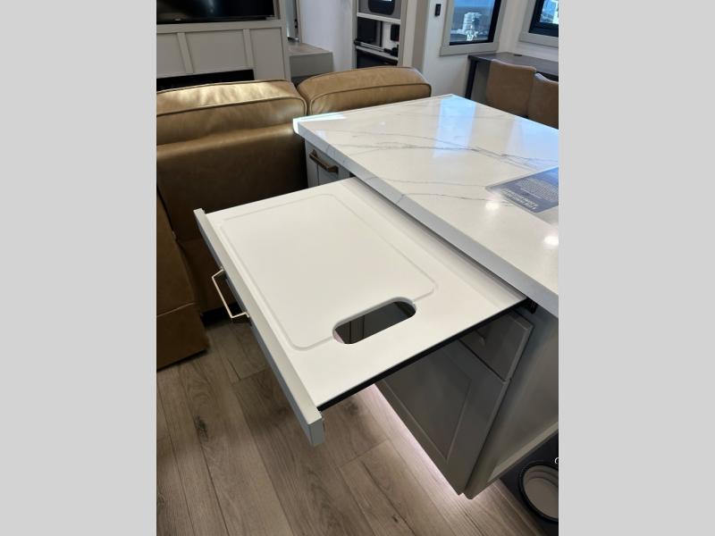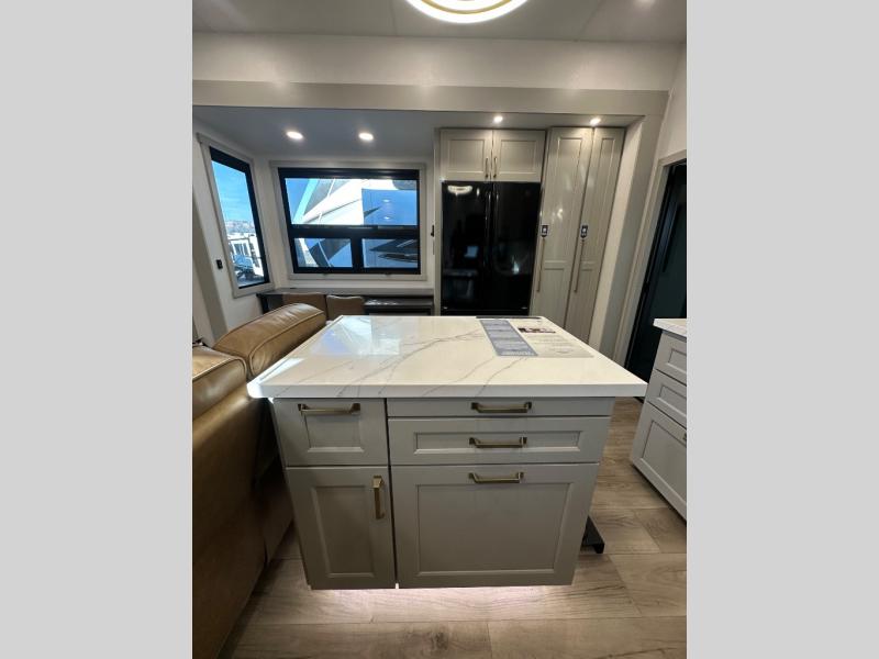 This toy hauler may just be the one you've been looking for! The garage/flex space with fold-away half bath walls will allow you to utilize the garage how you need it, plus there is an adjustable tie-down system, independent dual sofas, plus a loft for storage and a twin bed to sleep more campers! The garage patio with a 1,500 lb. capacity is another feature you are sure to love, especially with its own awning to keep you protected from the elements. Head to the kitchen to prepare meals with a 24" GE oven with a four burner range, a GE microwave with an air fryer, plus a spacious GE Energy Star 19 cu. ft. refrigerator. The island with two stools will let others visit with you while you cook, and there are even hidden dog bowls. You'll find the convertible dining table/L-desk will be accommodating since it can be use to dine at, and to get some work done. You may just find yourselves spending most of your time on the L-sofa in front of the TV and fireplace. A full bath is up front by the bedroom, and here you'll find neon shower lighting, a residential shower system, and pull-out linen storage to keep towels ready to use. After a day outdoors you'll love nothing more than coming back to your own bedroom with a king bed slide out, TV, a walk-in closet, and many more storage spaces. And we haven't even touched on the exterior features, like the 3-way pass-through storage, three power awnings, an air compressor to fill up tires, and the list goes on and on!