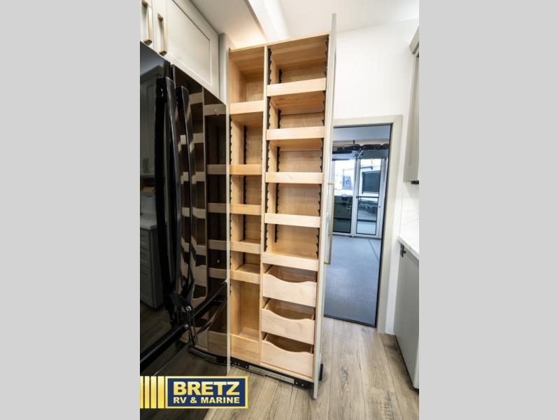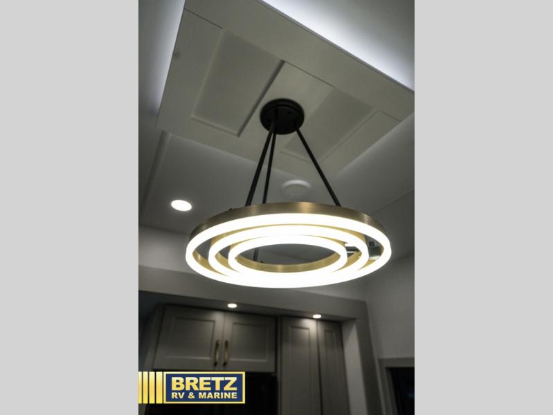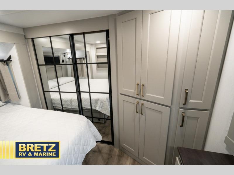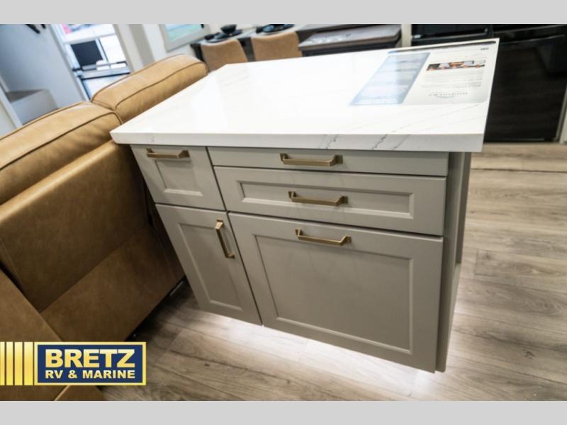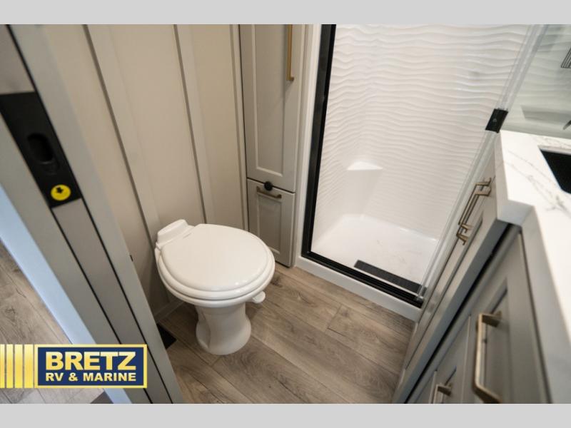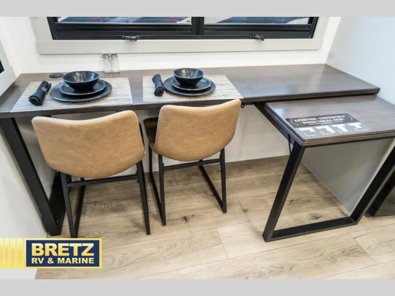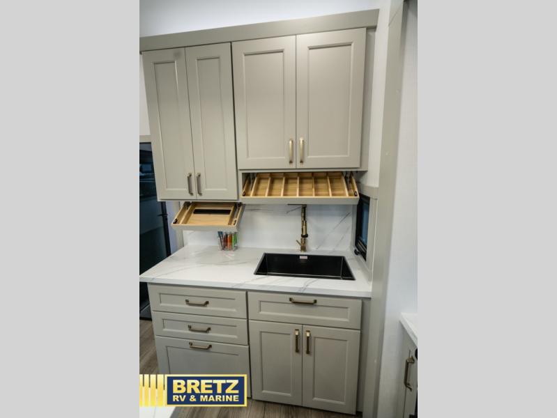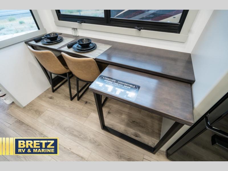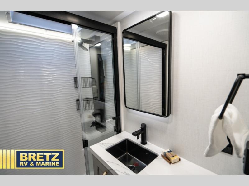 This toy hauler may just be the one you've been looking for! The garage/flex space with fold-away half bath walls will allow you to utilize the garage how you need it, plus there is an adjustable tie-down system, independent dual sofas, plus a loft for storage and a twin bed to sleep more campers! The garage patio with a 1,500 lb. capacity is another feature you are sure to love, especially with its own awning to keep you protected from the elements. Head to the kitchen to prepare meals with a 24" GE oven with a four burner range, a GE microwave with an air fryer, plus a spacious GE Energy Star 19 cu. ft. refrigerator. The island with two stools will let others visit with you while you cook, and there are even hidden dog bowls. You'll find the convertible dining table/L-desk will be accommodating since it can be use to dine at, and to get some work done. You may just find yourselves spending most of your time on the L-sofa in front of the TV and fireplace. A full bath is up front by the bedroom, and here you'll find neon shower lighting, a residential shower system, and pull-out linen storage to keep towels ready to use. After a day outdoors you'll love nothing more than coming back to your own bedroom with a king bed slide out, TV, a walk-in closet, and many more storage spaces. And we haven't even touched on the exterior features, like the 3-way pass-through storage, three power awnings, an air compressor to fill up tires, and the list goes on and on!