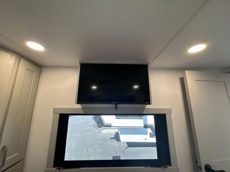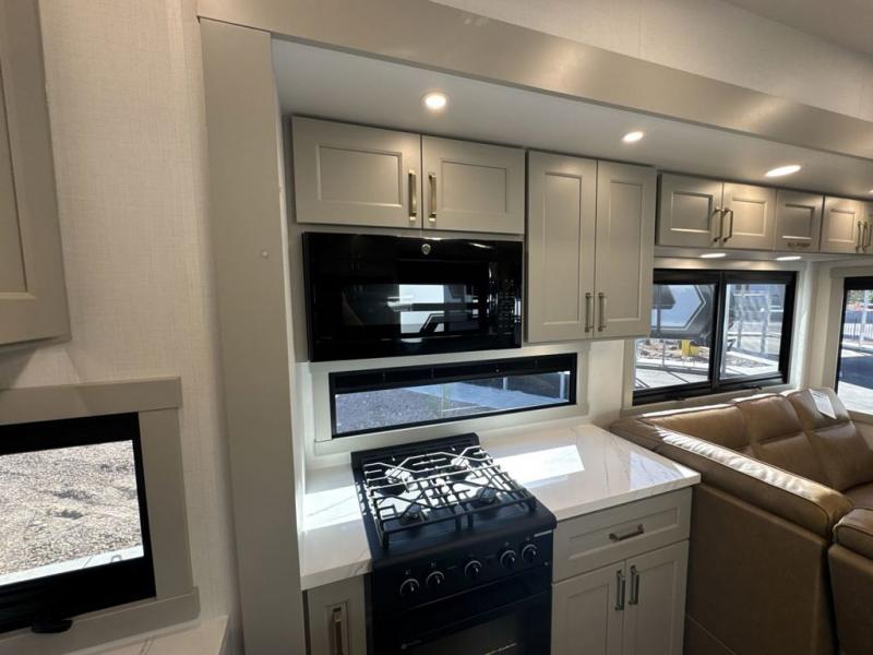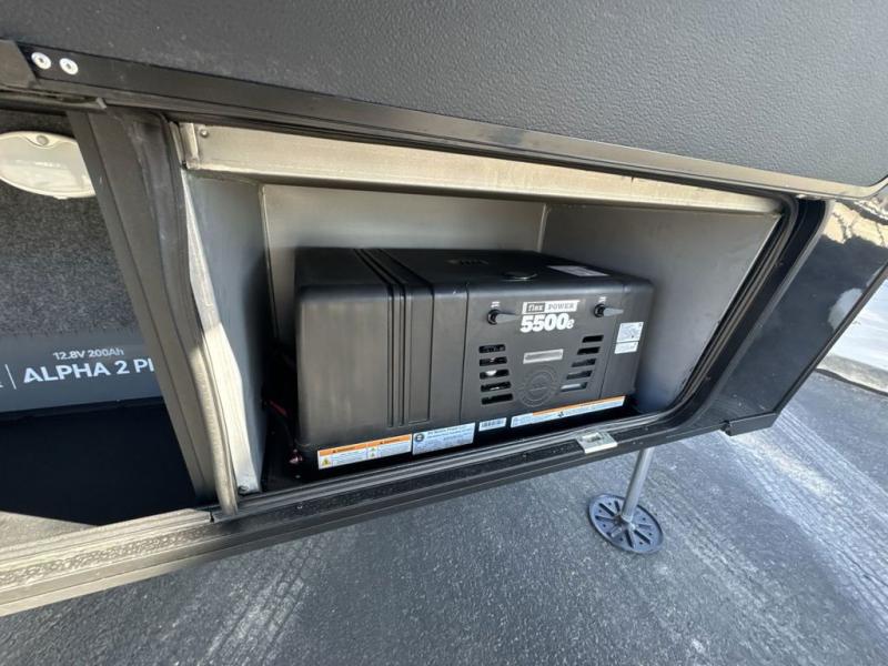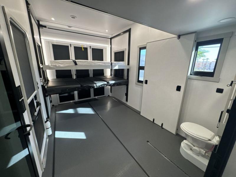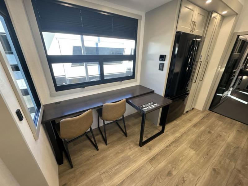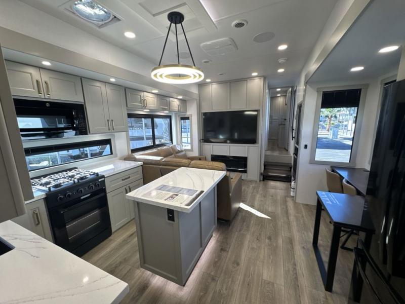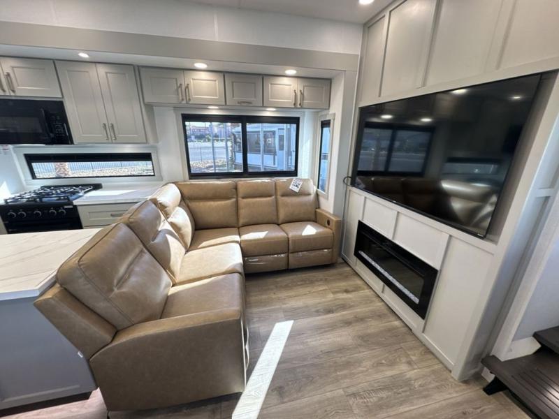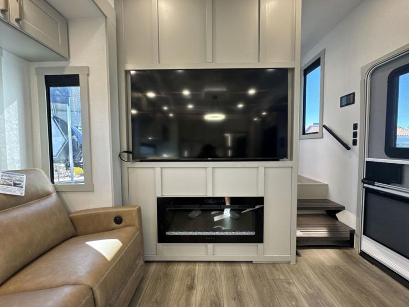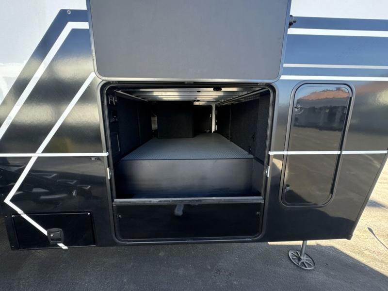 This toy hauler may just be the one you've been looking for! The garage/flex space with fold-away half bath walls will allow you to utilize the garage how you need it, plus there is an adjustable tie-down system, independent dual sofas, plus a loft for storage and a twin bed to sleep more campers! The garage patio with a 1,500 lb. capacity is another feature you are sure to love, especially with its own awning to keep you protected from the elements. Head to the kitchen to prepare meals with a 24" GE oven with a four burner range, a GE microwave with an air fryer, plus a spacious GE Energy Star 19 cu. ft. refrigerator. The island with two stools will let others visit with you while you cook, and there are even hidden dog bowls. You'll find the convertible dining table/L-desk will be accommodating since it can be use to dine at, and to get some work done. You may just find yourselves spending most of your time on the L-sofa in front of the TV and fireplace. A full bath is up front by the bedroom, and here you'll find neon shower lighting, a residential shower system, and pull-out linen storage to keep towels ready to use. After a day outdoors you'll love nothing more than coming back to your own bedroom with a king bed slide out, TV, a walk-in closet, and many more storage spaces. And we haven't even touched on the exterior features, like the 3-way pass-through storage, three power awnings, an air compressor to fill up tires, and the list goes on and on!