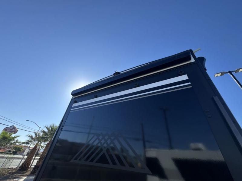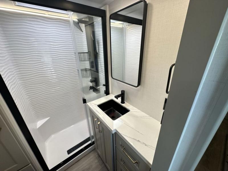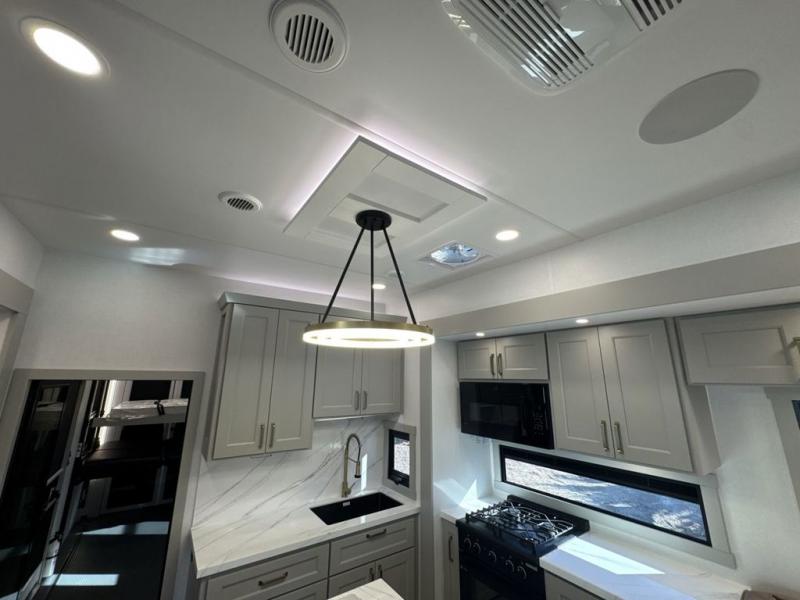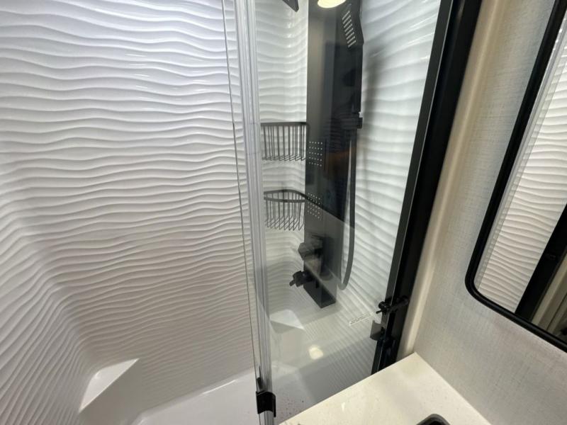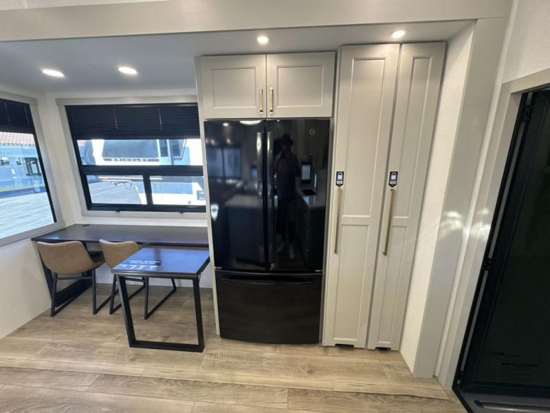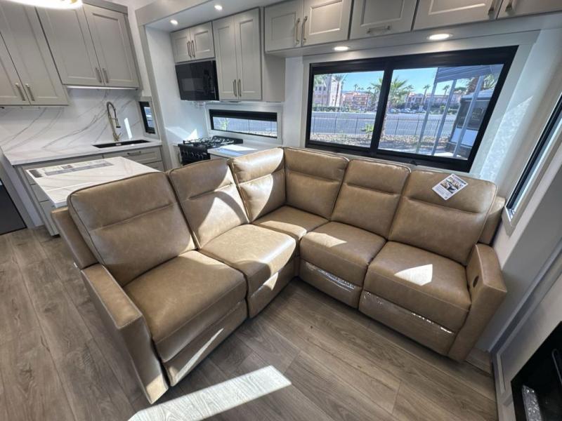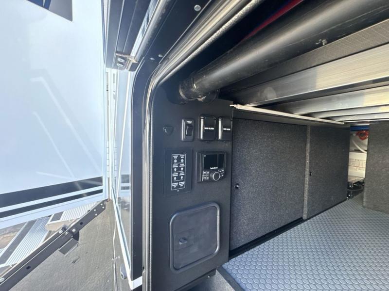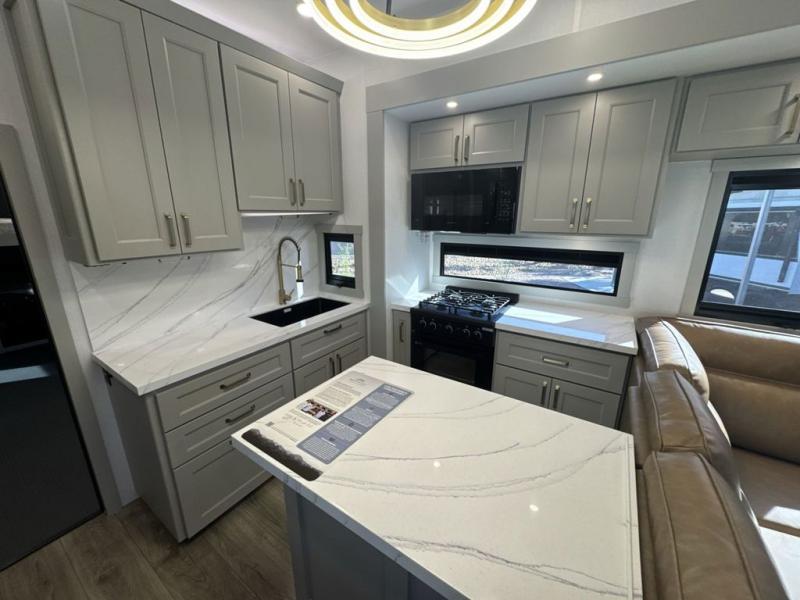 This toy hauler may just be the one you've been looking for! The garage/flex space with fold-away half bath walls will allow you to utilize the garage how you need it, plus there is an adjustable tie-down system, independent dual sofas, plus a loft for storage and a twin bed to sleep more campers! The garage patio with a 1,500 lb. capacity is another feature you are sure to love, especially with its own awning to keep you protected from the elements. Head to the kitchen to prepare meals with a 24" GE oven with a four burner range, a GE microwave with an air fryer, plus a spacious GE Energy Star 19 cu. ft. refrigerator. The island with two stools will let others visit with you while you cook, and there are even hidden dog bowls. You'll find the convertible dining table/L-desk will be accommodating since it can be use to dine at, and to get some work done. You may just find yourselves spending most of your time on the L-sofa in front of the TV and fireplace. A full bath is up front by the bedroom, and here you'll find neon shower lighting, a residential shower system, and pull-out linen storage to keep towels ready to use. After a day outdoors you'll love nothing more than coming back to your own bedroom with a king bed slide out, TV, a walk-in closet, and many more storage spaces. And we haven't even touched on the exterior features, like the 3-way pass-through storage, three power awnings, an air compressor to fill up tires, and the list goes on and on!