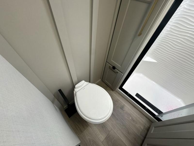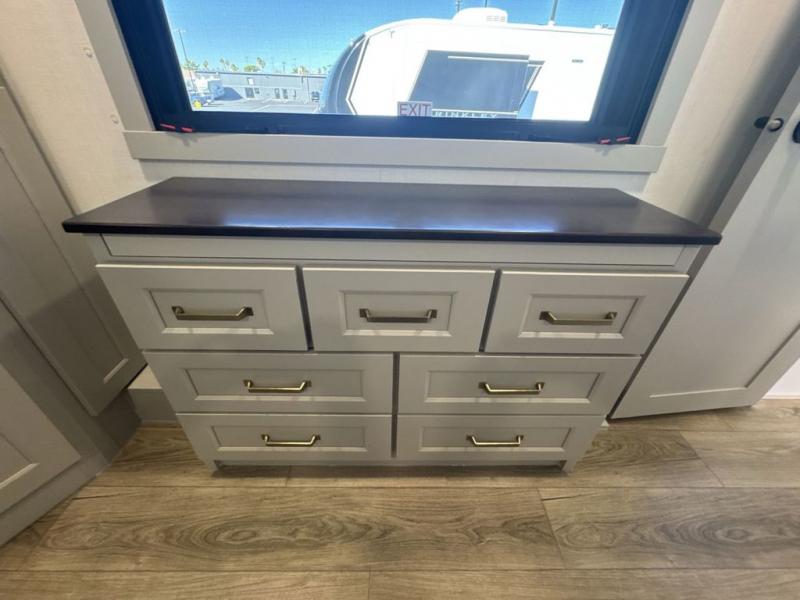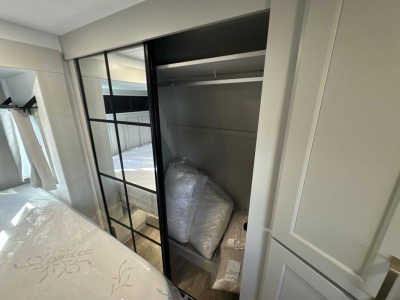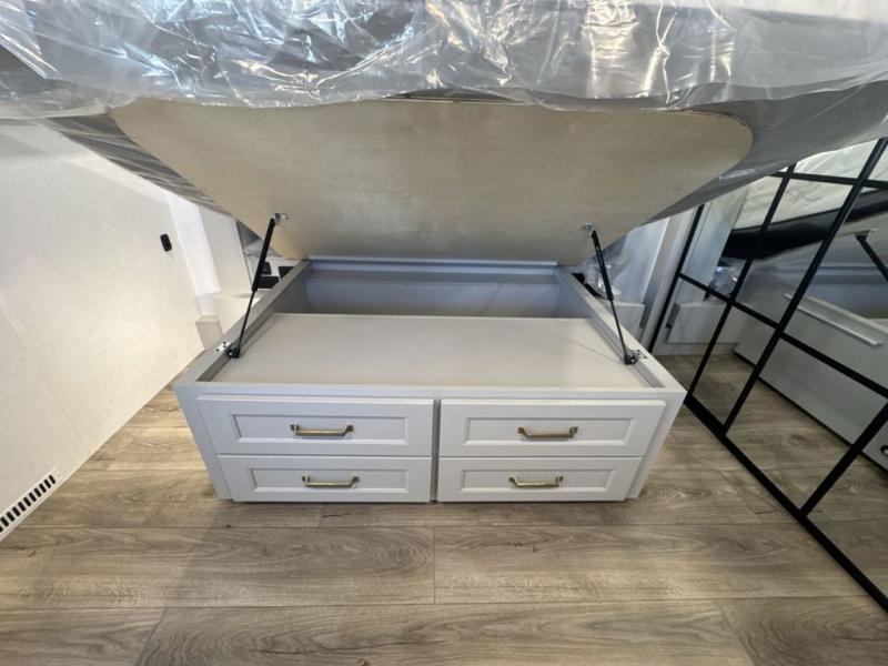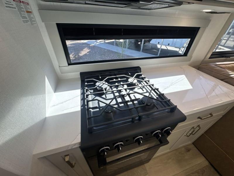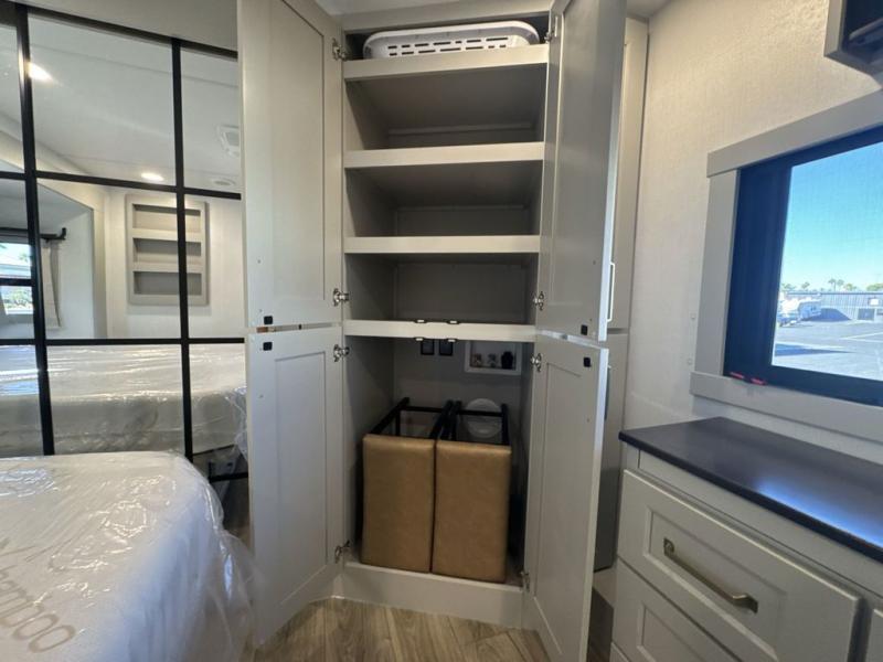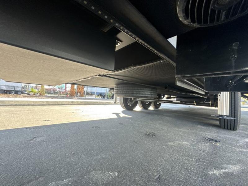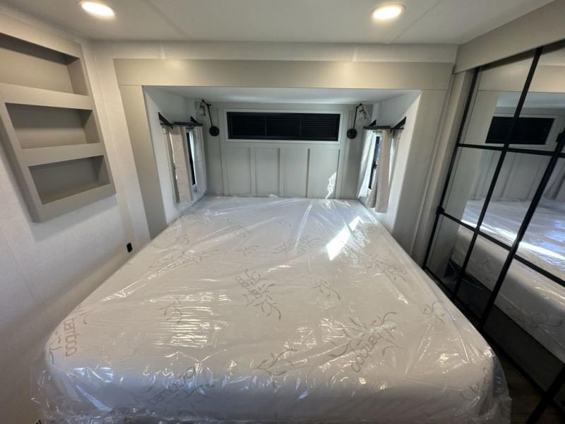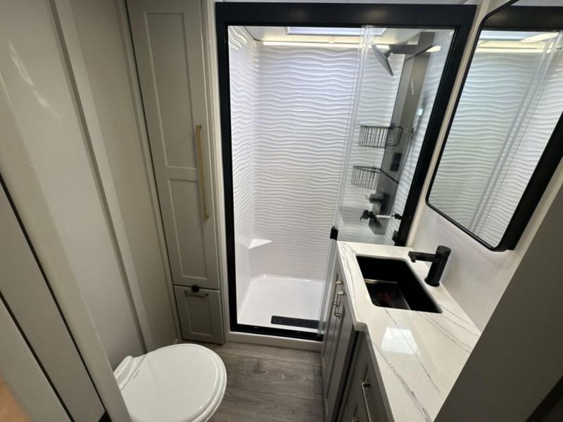 This toy hauler may just be the one you've been looking for! The garage/flex space with fold-away half bath walls will allow you to utilize the garage how you need it, plus there is an adjustable tie-down system, independent dual sofas, plus a loft for storage and a twin bed to sleep more campers! The garage patio with a 1,500 lb. capacity is another feature you are sure to love, especially with its own awning to keep you protected from the elements. Head to the kitchen to prepare meals with a 24" GE oven with a four burner range, a GE microwave with an air fryer, plus a spacious GE Energy Star 19 cu. ft. refrigerator. The island with two stools will let others visit with you while you cook, and there are even hidden dog bowls. You'll find the convertible dining table/L-desk will be accommodating since it can be use to dine at, and to get some work done. You may just find yourselves spending most of your time on the L-sofa in front of the TV and fireplace. A full bath is up front by the bedroom, and here you'll find neon shower lighting, a residential shower system, and pull-out linen storage to keep towels ready to use. After a day outdoors you'll love nothing more than coming back to your own bedroom with a king bed slide out, TV, a walk-in closet, and many more storage spaces. And we haven't even touched on the exterior features, like the 3-way pass-through storage, three power awnings, an air compressor to fill up tires, and the list goes on and on!