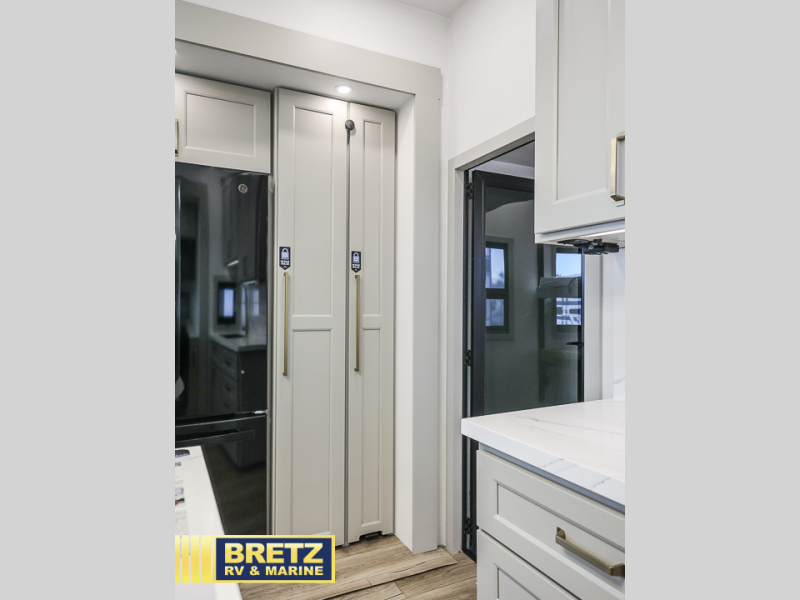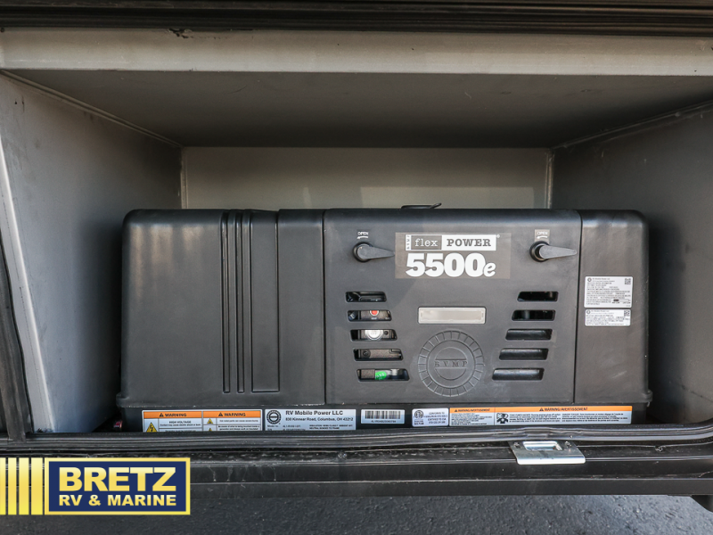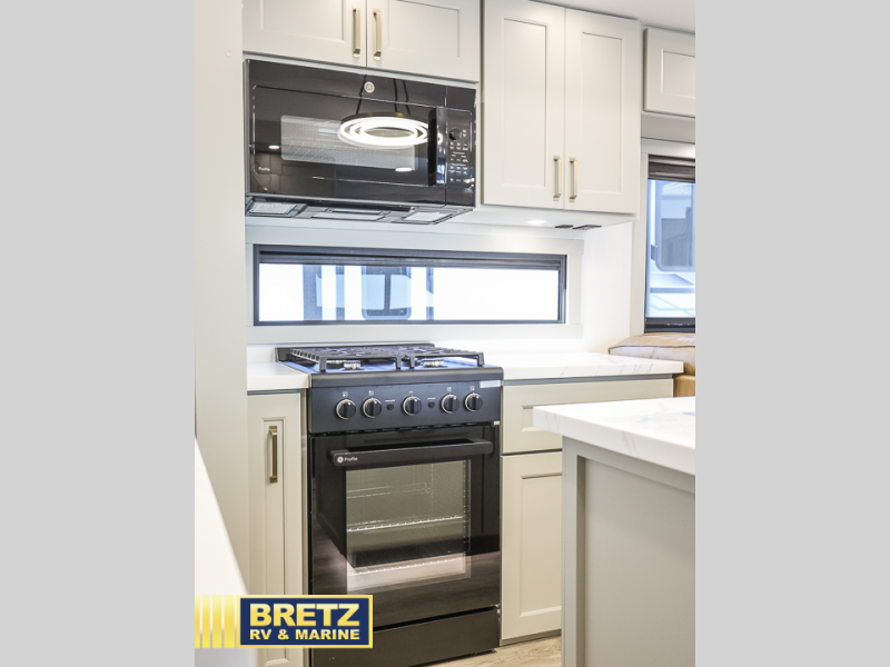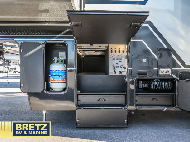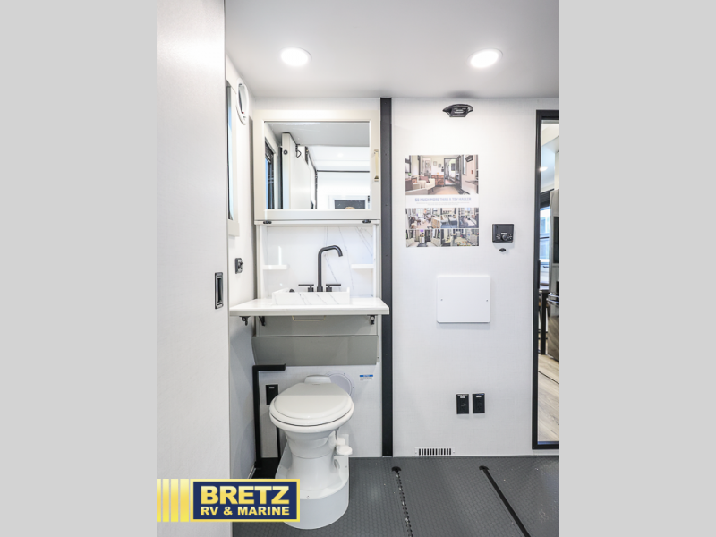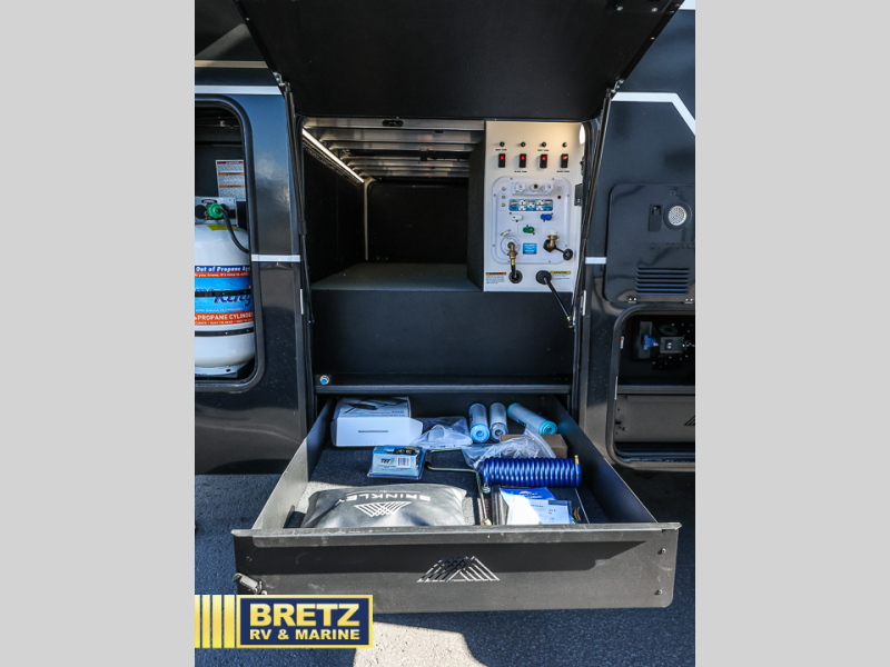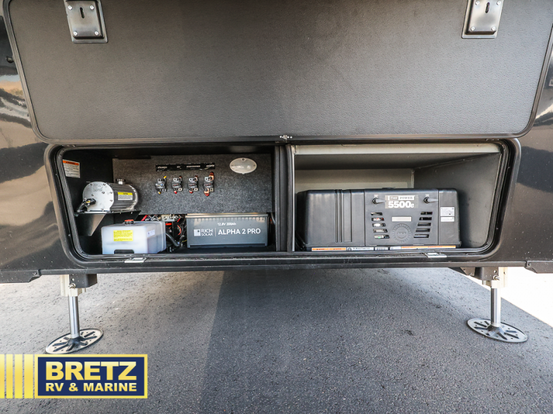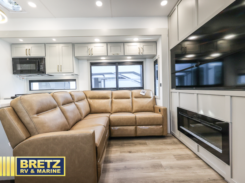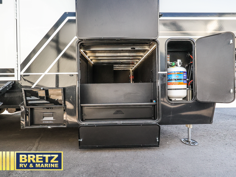 This toy hauler may just be the one you've been looking for! The garage/flex space with fold-away half bath walls will allow you to utilize the garage how you need it, plus there is an adjustable tie-down system, independent dual sofas, plus a loft for storage and a twin bed to sleep more campers! The garage patio with a 1,500 lb. capacity is another feature you are sure to love, especially with its own awning to keep you protected from the elements. Head to the kitchen to prepare meals with a 24" GE oven with a four burner range, a GE microwave with an air fryer, plus a spacious GE Energy Star 19 cu. ft. refrigerator. The island with two stools will let others visit with you while you cook, and there are even hidden dog bowls. You'll find the convertible dining table/L-desk will be accommodating since it can be use to dine at, and to get some work done. You may just find yourselves spending most of your time on the L-sofa in front of the TV and fireplace. A full bath is up front by the bedroom, and here you'll find neon shower lighting, a residential shower system, and pull-out linen storage to keep towels ready to use. After a day outdoors you'll love nothing more than coming back to your own bedroom with a king bed slide out, TV, a walk-in closet, and many more storage spaces. And we haven't even touched on the exterior features, like the 3-way pass-through storage, three power awnings, an air compressor to fill up tires, and the list goes on and on!
