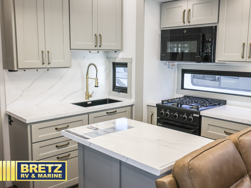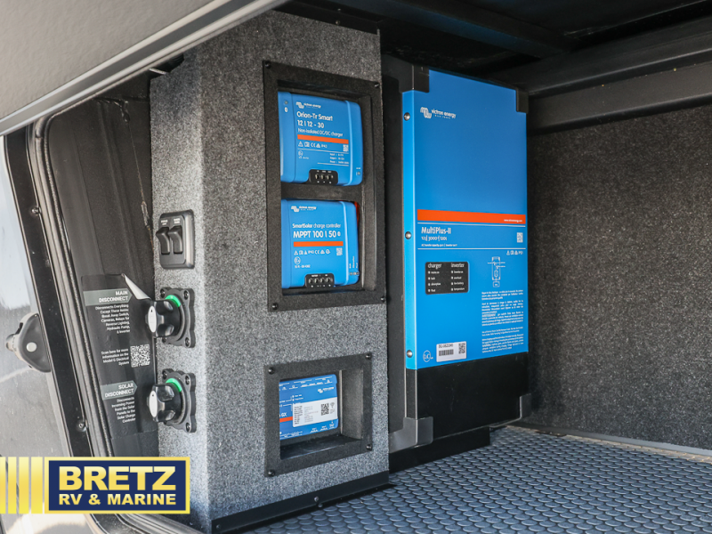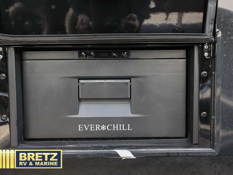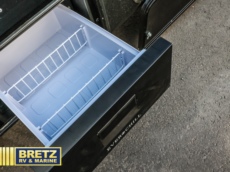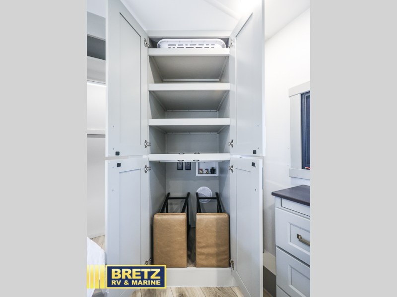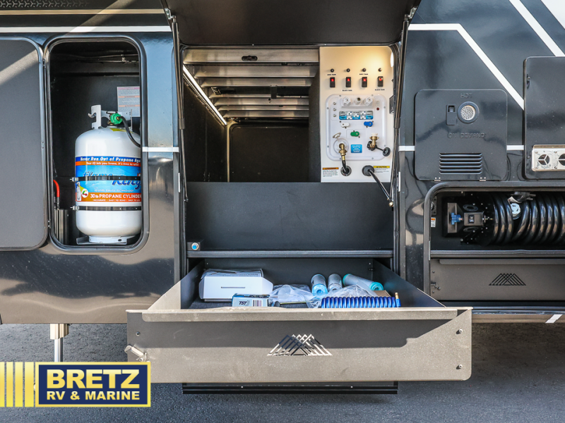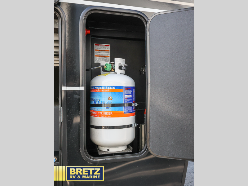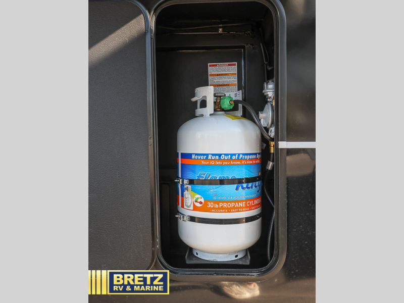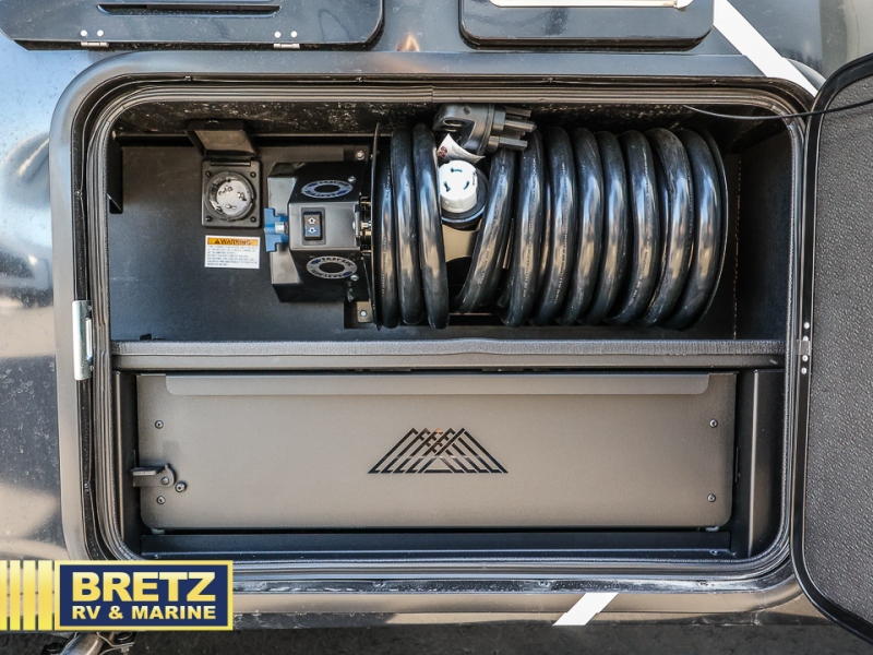 This toy hauler may just be the one you've been looking for! The garage/flex space with fold-away half bath walls will allow you to utilize the garage how you need it, plus there is an adjustable tie-down system, independent dual sofas, plus a loft for storage and a twin bed to sleep more campers! The garage patio with a 1,500 lb. capacity is another feature you are sure to love, especially with its own awning to keep you protected from the elements. Head to the kitchen to prepare meals with a 24" GE oven with a four burner range, a GE microwave with an air fryer, plus a spacious GE Energy Star 19 cu. ft. refrigerator. The island with two stools will let others visit with you while you cook, and there are even hidden dog bowls. You'll find the convertible dining table/L-desk will be accommodating since it can be use to dine at, and to get some work done. You may just find yourselves spending most of your time on the L-sofa in front of the TV and fireplace. A full bath is up front by the bedroom, and here you'll find neon shower lighting, a residential shower system, and pull-out linen storage to keep towels ready to use. After a day outdoors you'll love nothing more than coming back to your own bedroom with a king bed slide out, TV, a walk-in closet, and many more storage spaces. And we haven't even touched on the exterior features, like the 3-way pass-through storage, three power awnings, an air compressor to fill up tires, and the list goes on and on!