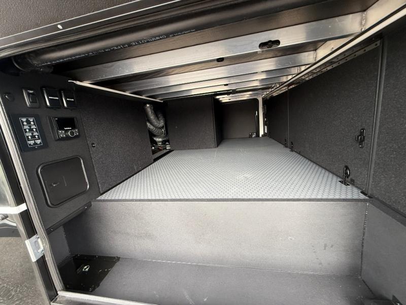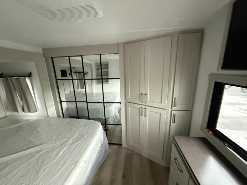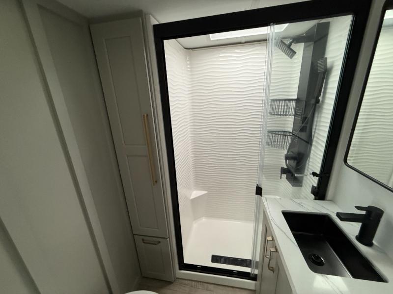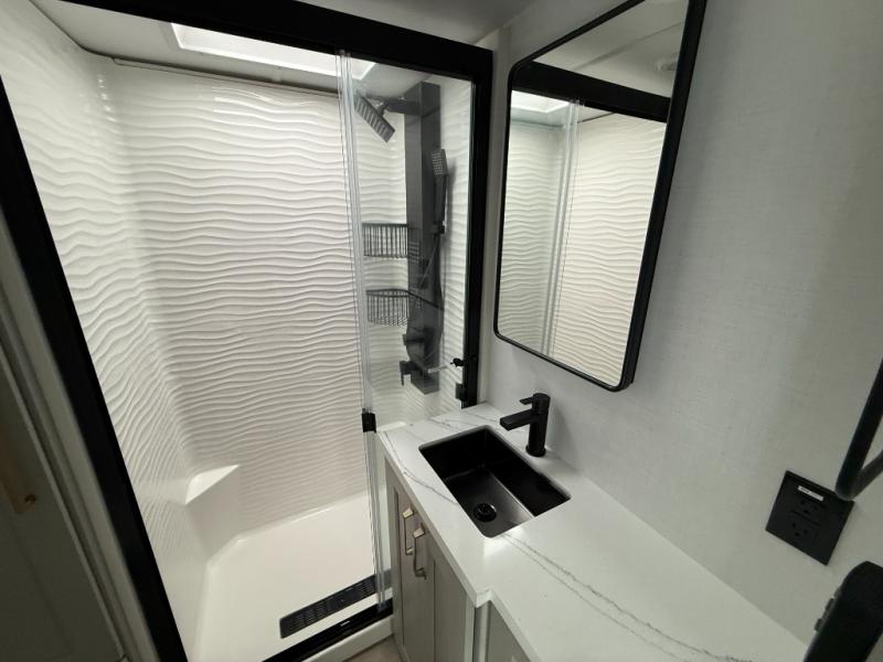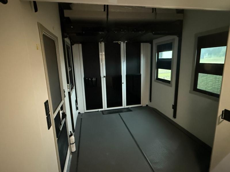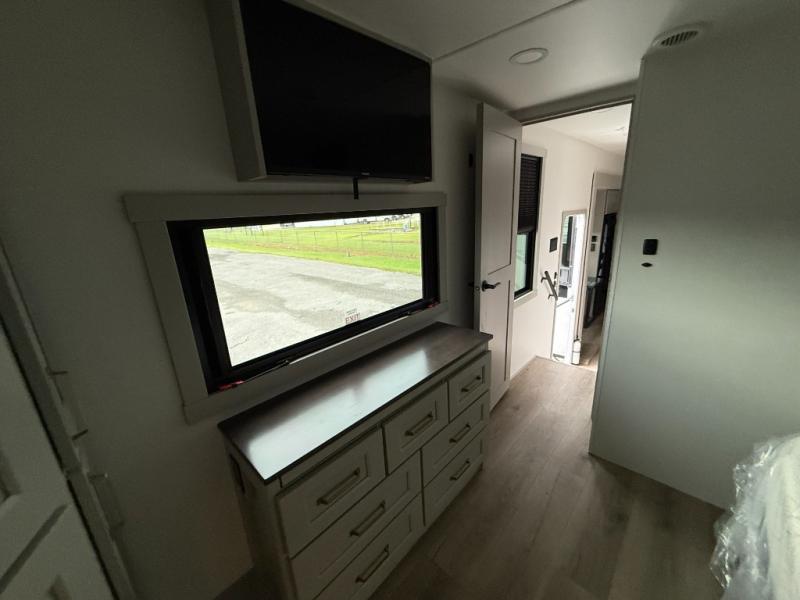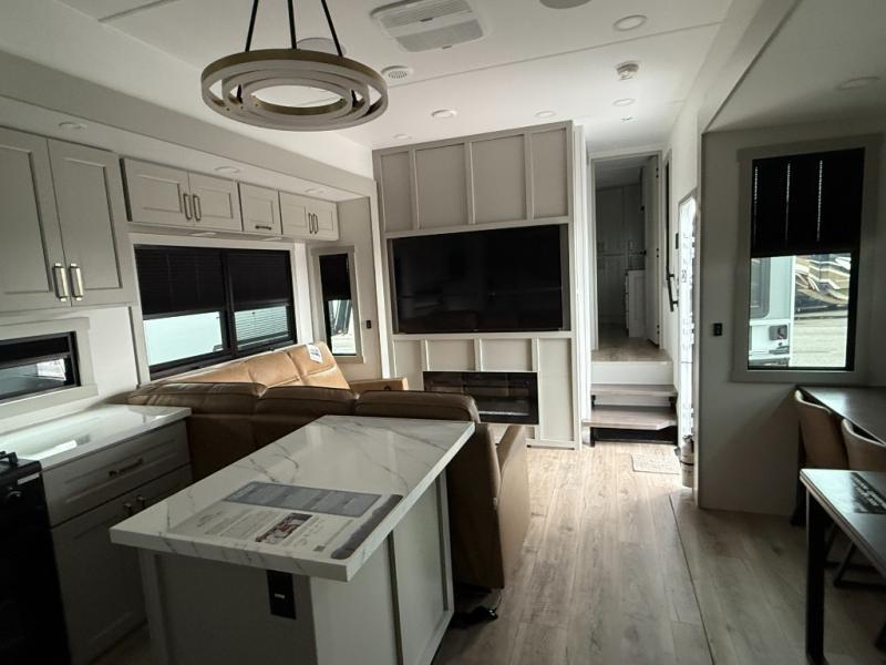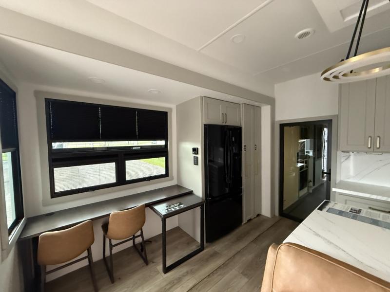 This toy hauler may just be the one you've been looking for! The garage/flex space with fold-away half bath walls will allow you to utilize the garage how you need it, plus there is an adjustable tie-down system, independent dual sofas, plus a loft for storage and a twin bed to sleep more campers! The garage patio with a 1,500 lb. capacity is another feature you are sure to love, especially with its own awning to keep you protected from the elements. Head to the kitchen to prepare meals with a 24" GE oven with a four burner range, a GE microwave with an air fryer, plus a spacious GE Energy Star 19 cu. ft. refrigerator. The island with two stools will let others visit with you while you cook, and there are even hidden dog bowls. You'll find the convertible dining table/L-desk will be accommodating since it can be use to dine at, and to get some work done. You may just find yourselves spending most of your time on the L-sofa in front of the TV and fireplace. A full bath is up front by the bedroom, and here you'll find neon shower lighting, a residential shower system, and pull-out linen storage to keep towels ready to use. After a day outdoors you'll love nothing more than coming back to your own bedroom with a king bed slide out, TV, a walk-in closet, and many more storage spaces. And we haven't even touched on the exterior features, like the 3-way pass-through storage, three power awnings, an air compressor to fill up tires, and the list goes on and on!