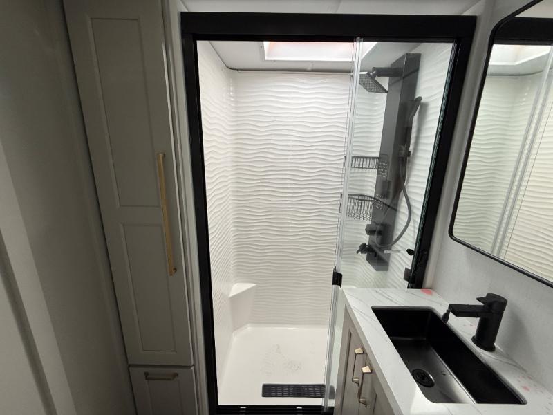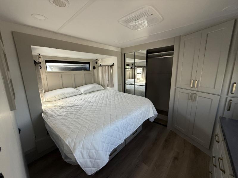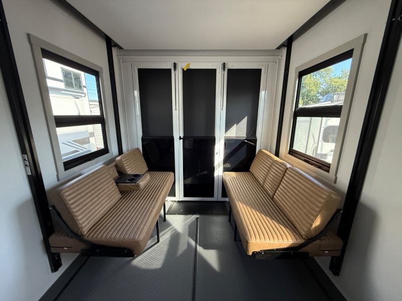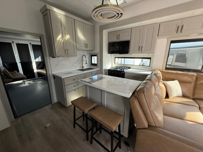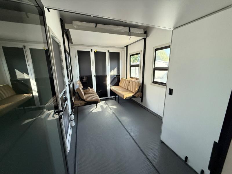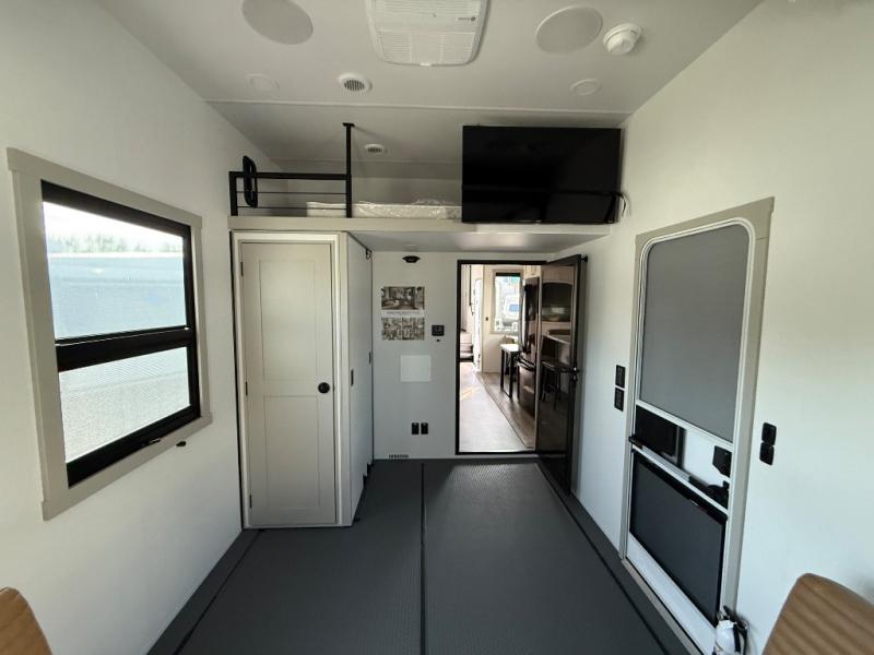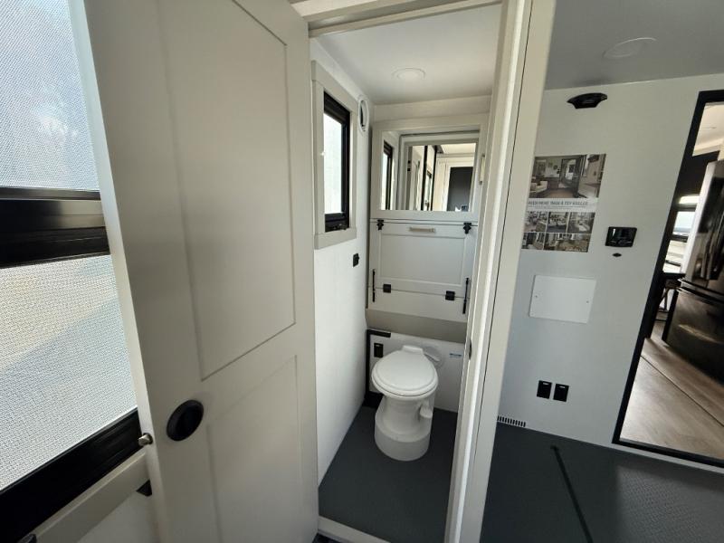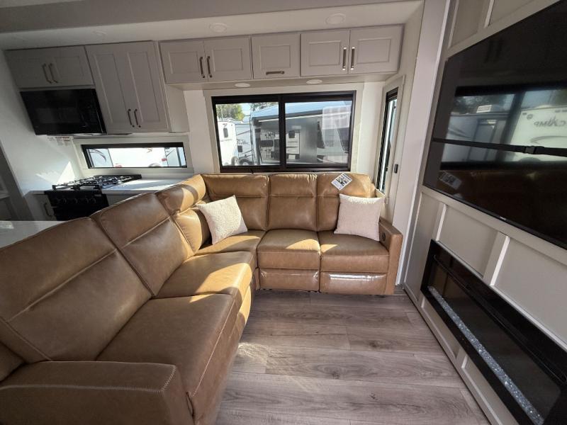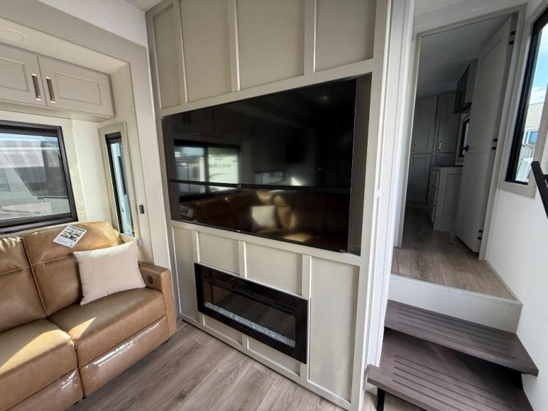 This toy hauler may just be the one you've been looking for! The garage/flex space with fold-away half bath walls will allow you to utilize the garage how you need it, plus there is an adjustable tie-down system, independent dual sofas, plus a loft for storage and a twin bed to sleep more campers! The garage patio with a 1,500 lb. capacity is another feature you are sure to love, especially with its own awning to keep you protected from the elements. Head to the kitchen to prepare meals with a 24" GE oven with a four burner range, a GE microwave with an air fryer, plus a spacious GE Energy Star 19 cu. ft. refrigerator. The island with two stools will let others visit with you while you cook, and there are even hidden dog bowls. You'll find the convertible dining table/L-desk will be accommodating since it can be use to dine at, and to get some work done. You may just find yourselves spending most of your time on the L-sofa in front of the TV and fireplace. A full bath is up front by the bedroom, and here you'll find neon shower lighting, a residential shower system, and pull-out linen storage to keep towels ready to use. After a day outdoors you'll love nothing more than coming back to your own bedroom with a king bed slide out, TV, a walk-in closet, and many more storage spaces. And we haven't even touched on the exterior features, like the 3-way pass-through storage, three power awnings, an air compressor to fill up tires, and the list goes on and on!