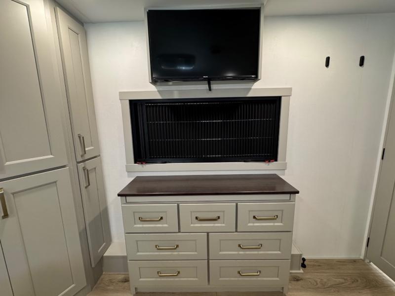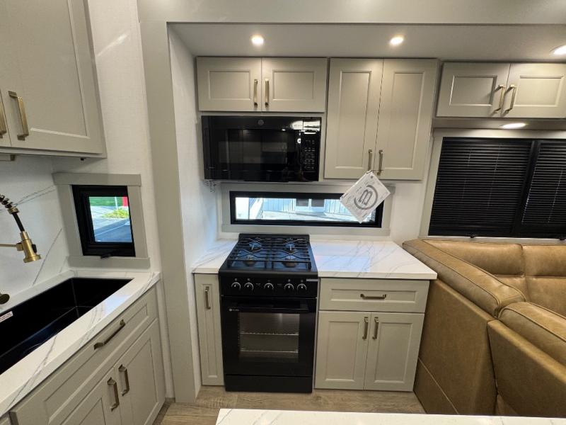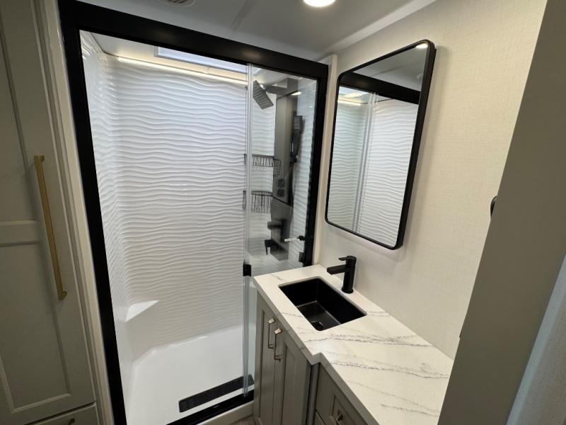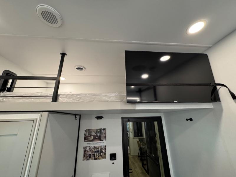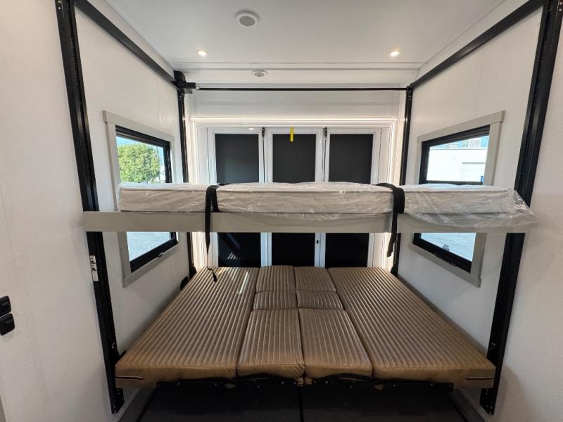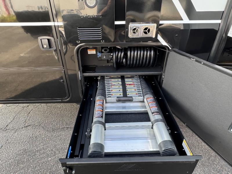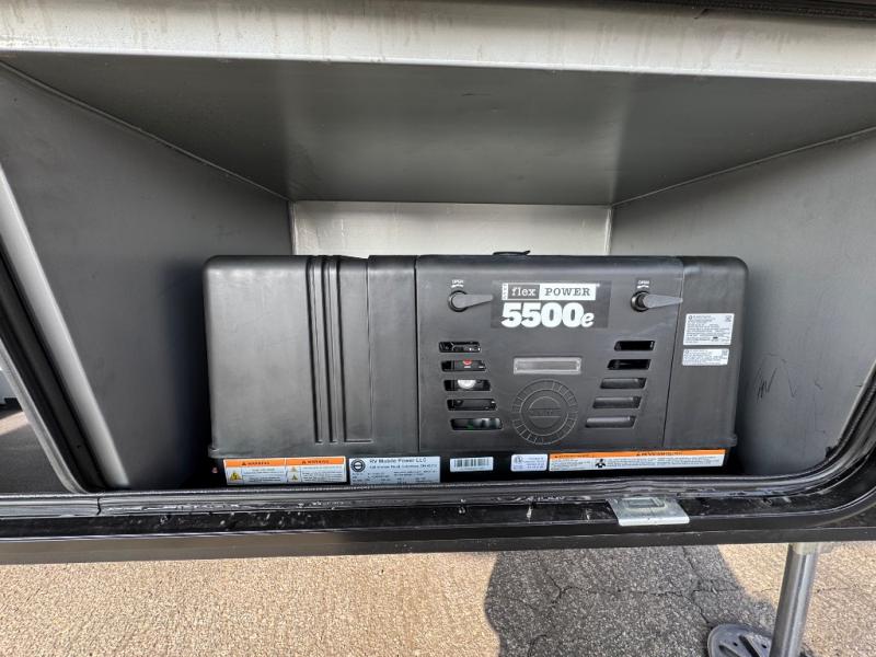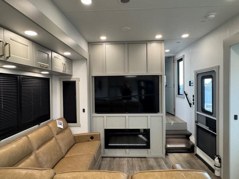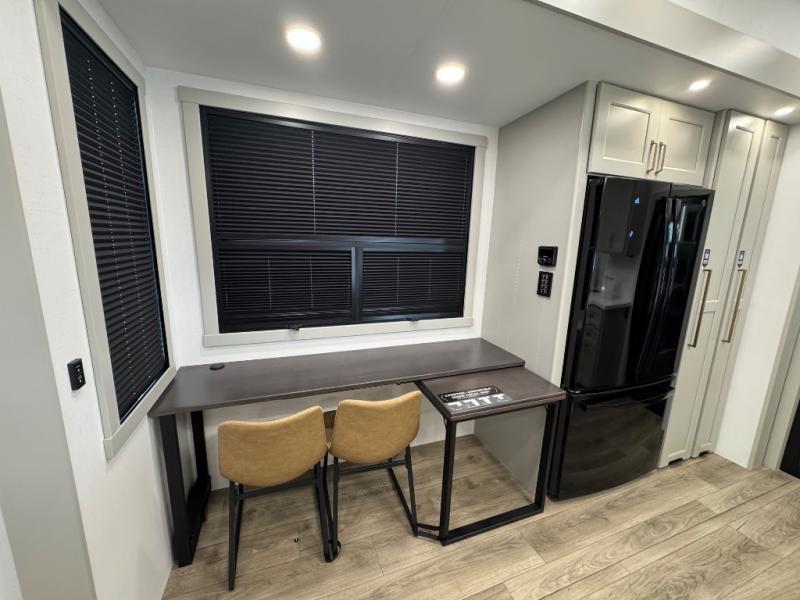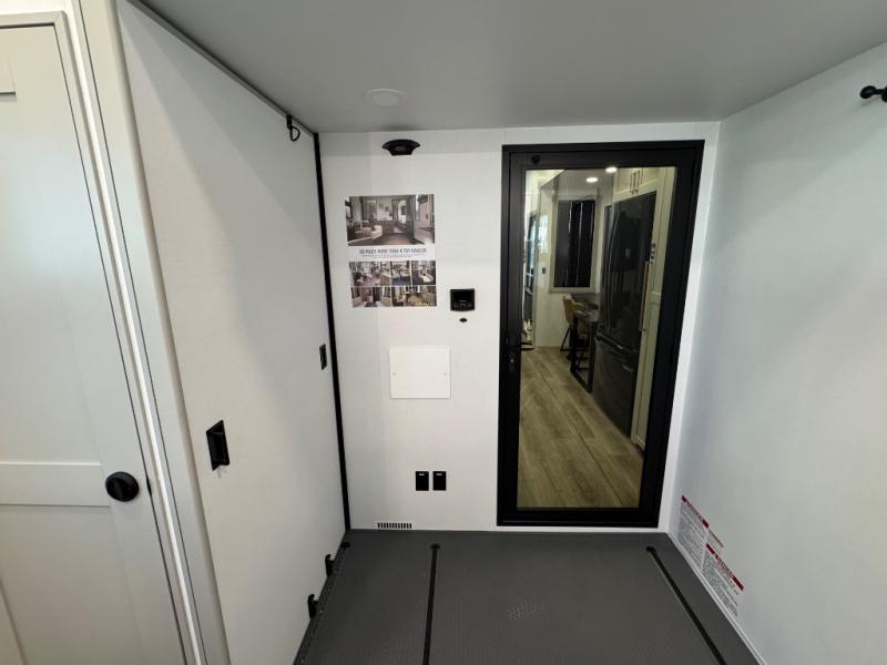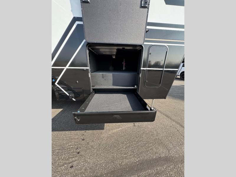 This toy hauler may just be the one you've been looking for! The garage/flex space with fold-away half bath walls will allow you to utilize the garage how you need it, plus there is an adjustable tie-down system, independent dual sofas, plus a loft for storage and a twin bed to sleep more campers! The garage patio with a 1,500 lb. capacity is another feature you are sure to love, especially with its own awning to keep you protected from the elements. Head to the kitchen to prepare meals with a 24" GE oven with a four burner range, a GE microwave with an air fryer, plus a spacious GE Energy Star 19 cu. ft. refrigerator. The island with two stools will let others visit with you while you cook, and there are even hidden dog bowls. You'll find the convertible dining table/L-desk will be accommodating since it can be use to dine at, and to get some work done. You may just find yourselves spending most of your time on the L-sofa in front of the TV and fireplace. A full bath is up front by the bedroom, and here you'll find neon shower lighting, a residential shower system, and pull-out linen storage to keep towels ready to use. After a day outdoors you'll love nothing more than coming back to your own bedroom with a king bed slide out, TV, a walk-in closet, and many more storage spaces. And we haven't even touched on the exterior features, like the 3-way pass-through storage, three power awnings, an air compressor to fill up tires, and the list goes on and on!