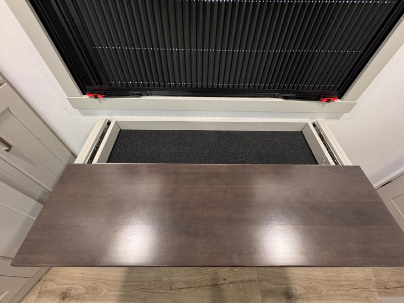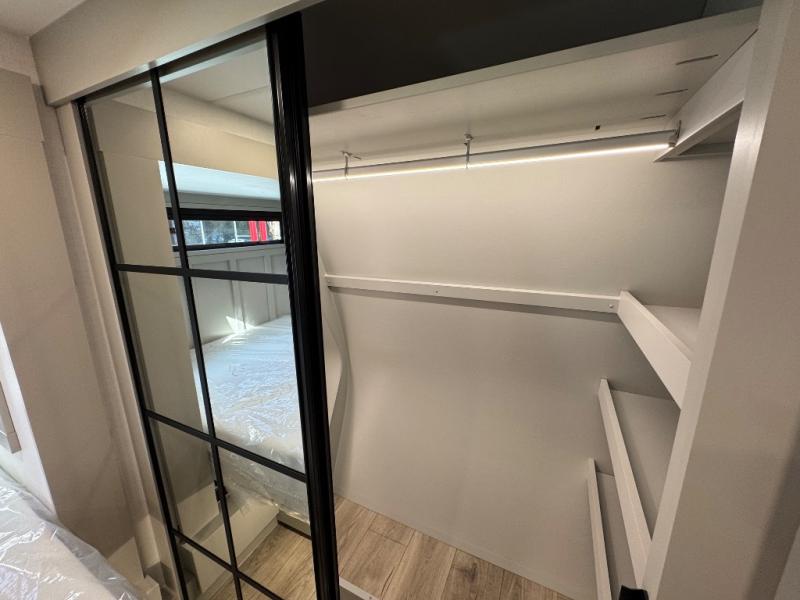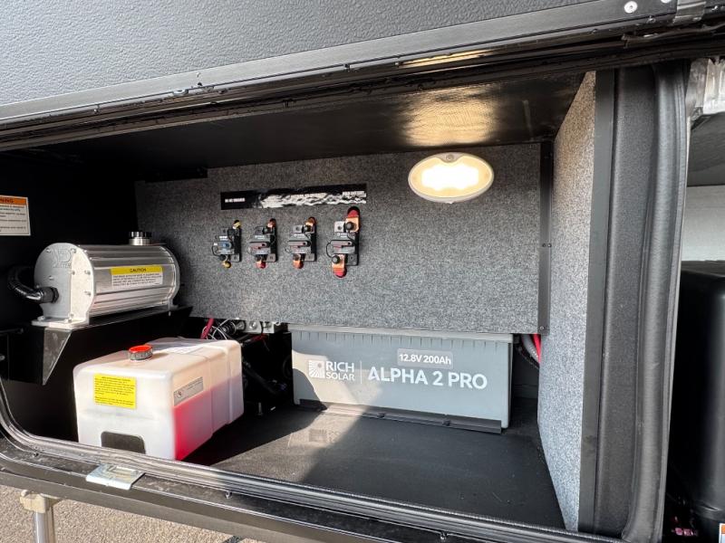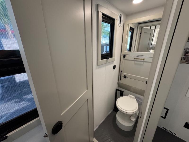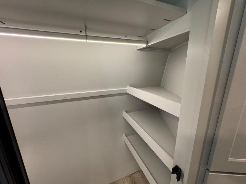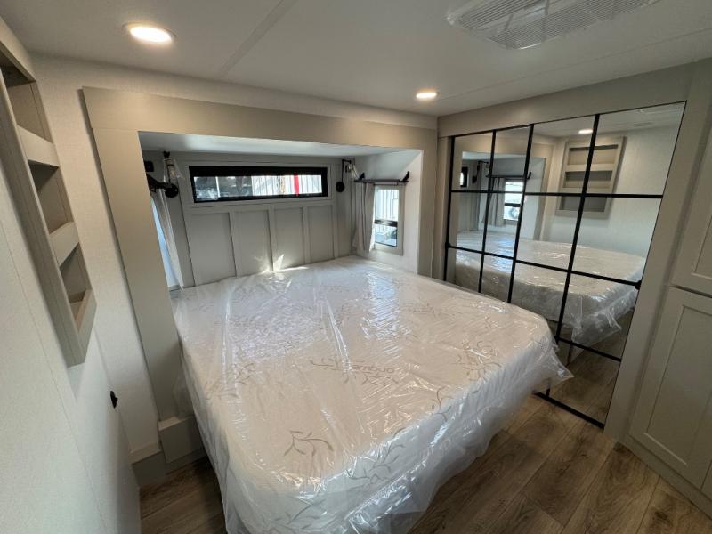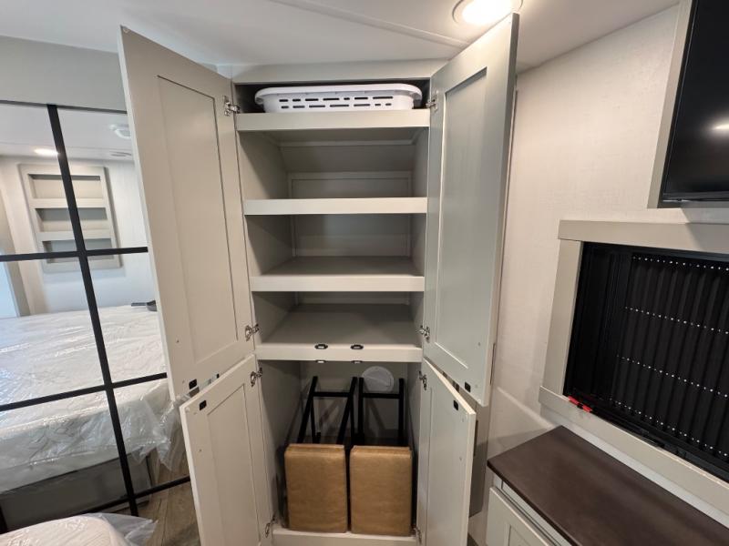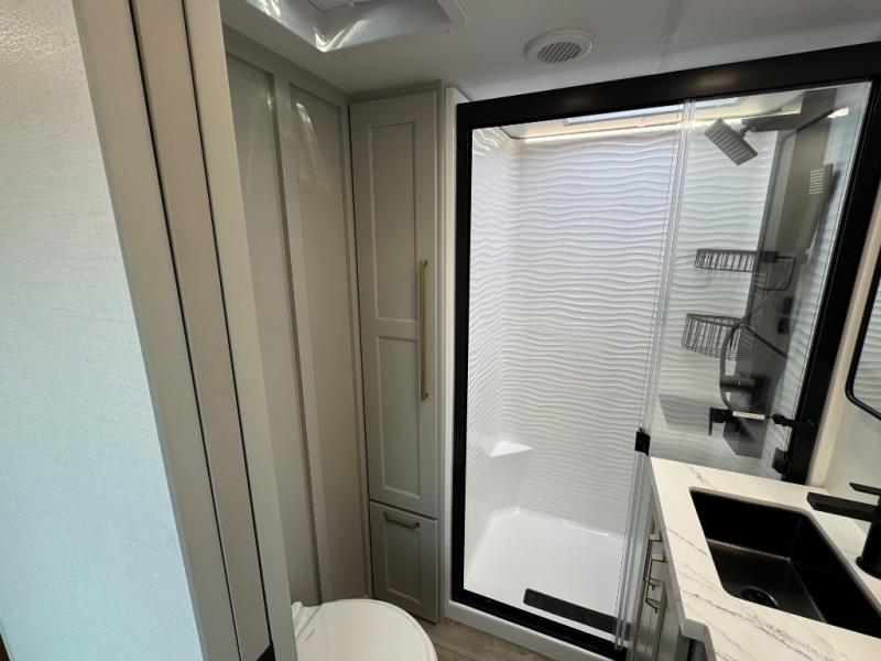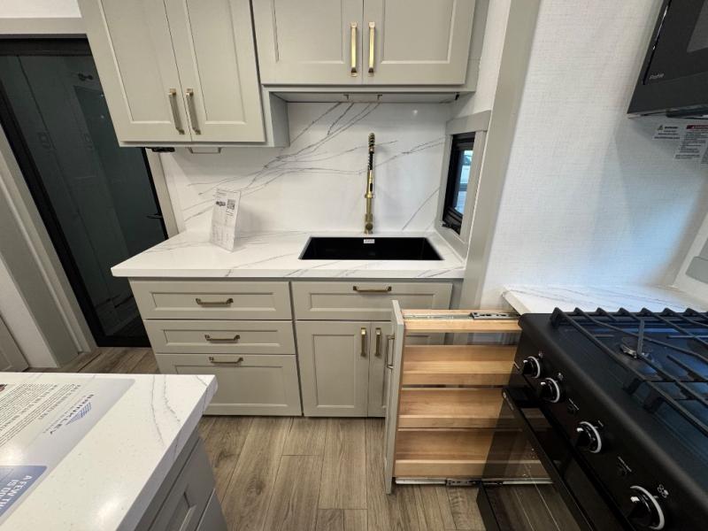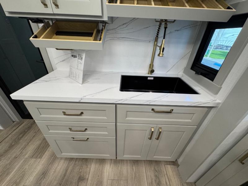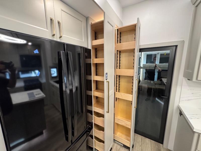 This toy hauler may just be the one you've been looking for! The garage/flex space with fold-away half bath walls will allow you to utilize the garage how you need it, plus there is an adjustable tie-down system, independent dual sofas, plus a loft for storage and a twin bed to sleep more campers! The garage patio with a 1,500 lb. capacity is another feature you are sure to love, especially with its own awning to keep you protected from the elements. Head to the kitchen to prepare meals with a 24" GE oven with a four burner range, a GE microwave with an air fryer, plus a spacious GE Energy Star 19 cu. ft. refrigerator. The island with two stools will let others visit with you while you cook, and there are even hidden dog bowls. You'll find the convertible dining table/L-desk will be accommodating since it can be use to dine at, and to get some work done. You may just find yourselves spending most of your time on the L-sofa in front of the TV and fireplace. A full bath is up front by the bedroom, and here you'll find neon shower lighting, a residential shower system, and pull-out linen storage to keep towels ready to use. After a day outdoors you'll love nothing more than coming back to your own bedroom with a king bed slide out, TV, a walk-in closet, and many more storage spaces. And we haven't even touched on the exterior features, like the 3-way pass-through storage, three power awnings, an air compressor to fill up tires, and the list goes on and on!