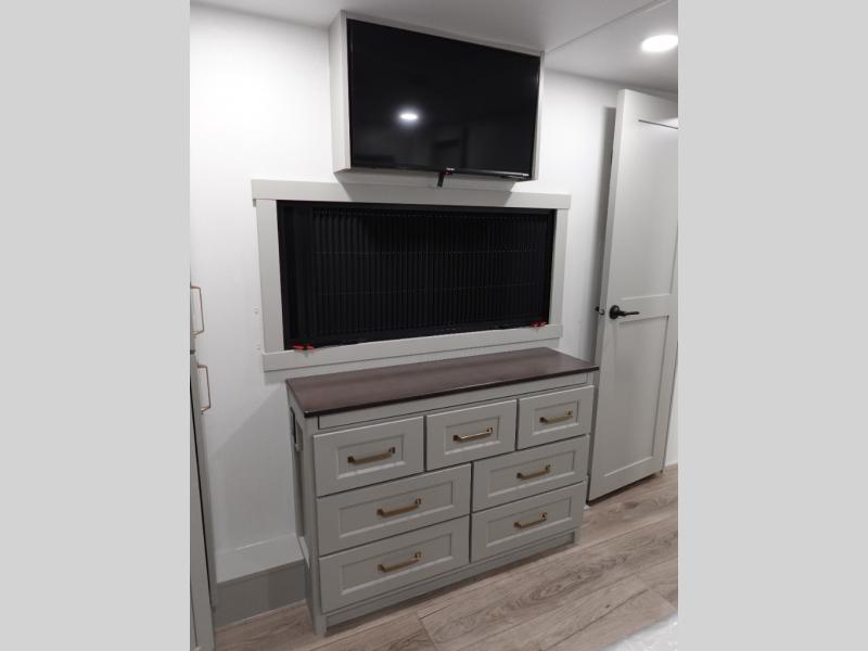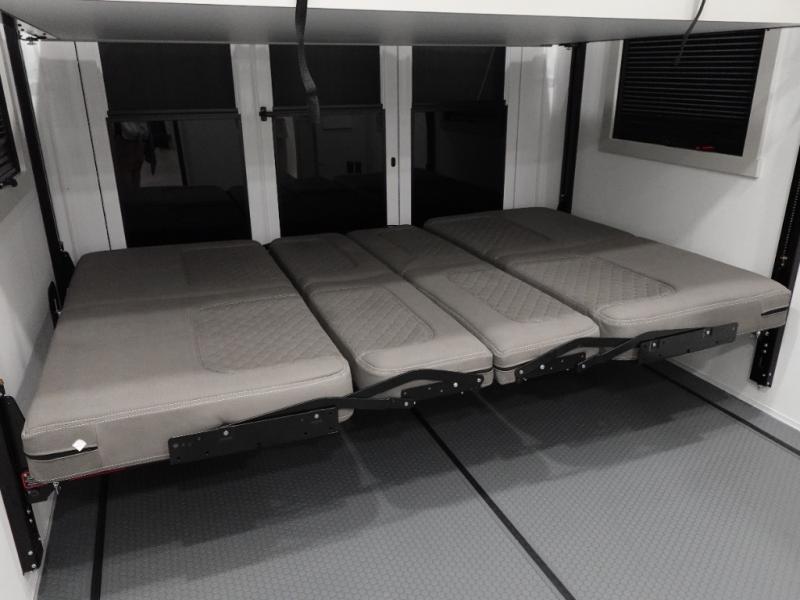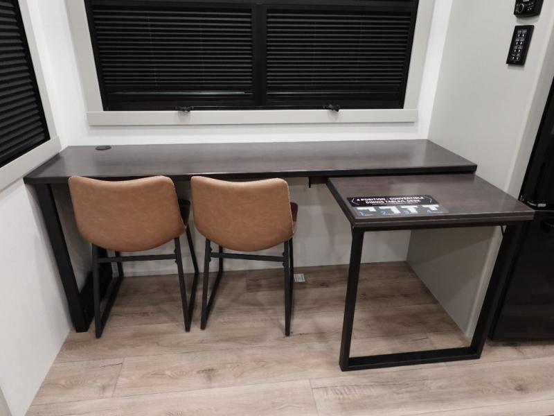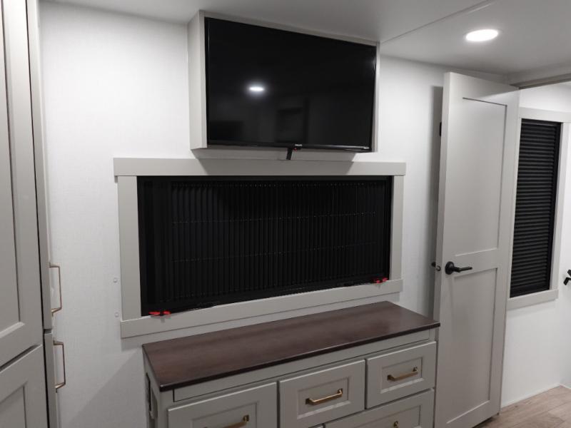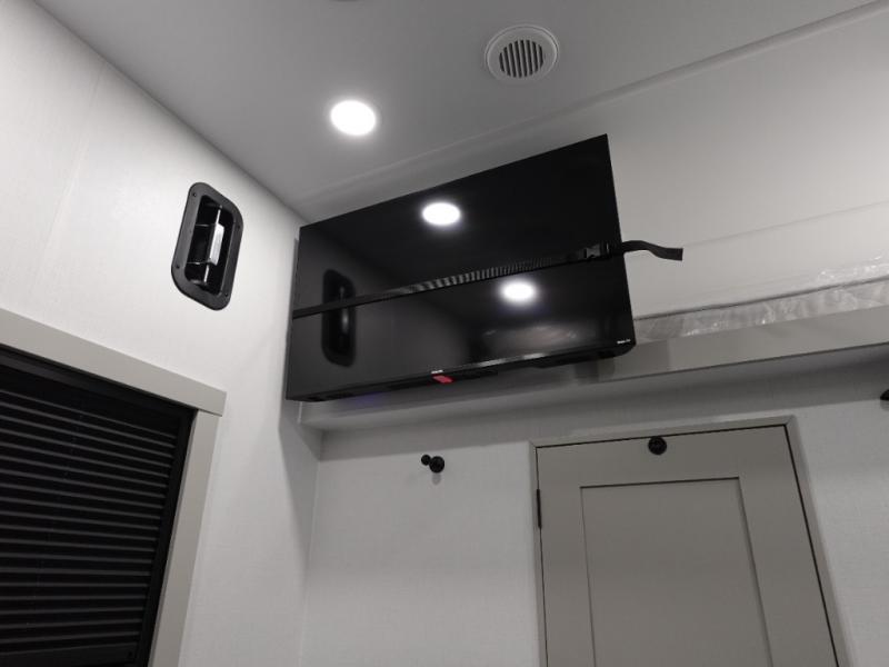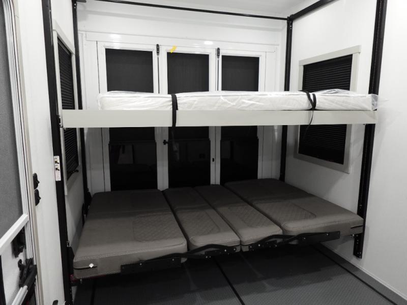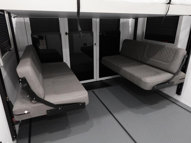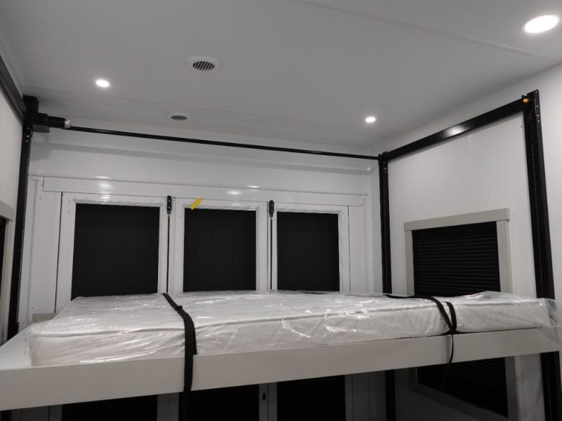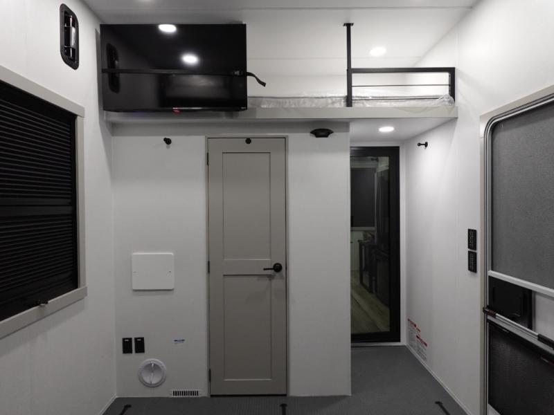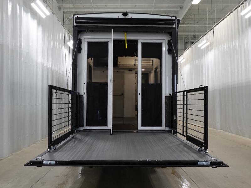 Whether you use this toy hauler to haul your favorite ride-on toys or as a mobile office, you're sure to love every inch of it! The 14' separate garage includes a Fold-N-Stow table and independent dual sofas, along with a full bath and a loft/storage with a twin bed for more sleeping space. The middle kitchen is every chef's dream with its GE appliances, kitchen island, and convenient features, such as pull-out trash bins and a cutting board, a pull-down knife rack and utensil tray, and a pull-out pantry/utility closet! Right next to the kitchen is the living room with a L-sofa with four modes, a 65" Phillips Smart TV and a fireplace, plus a convertible dining table/L-desk where you can dine or get some work done. You'll love the second full bath up front close to the private bedroom, and here, you'll find a king bed slide out, under-bed storage drawers and motion lights, a walk-in closet with cordless vacuum prep, and a sliding dresser top with hidden storage for valuables. There is also washer and dryer prep in the bedroom and garage, making this toy hauler full-time capable!