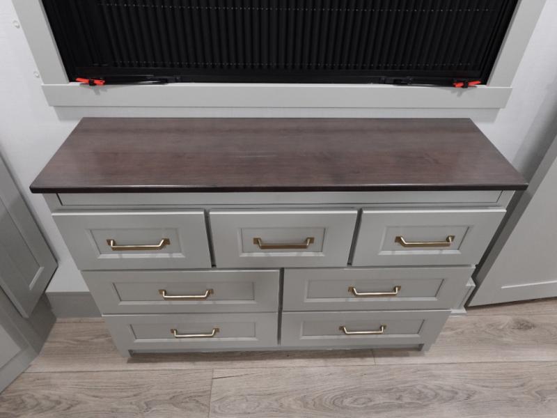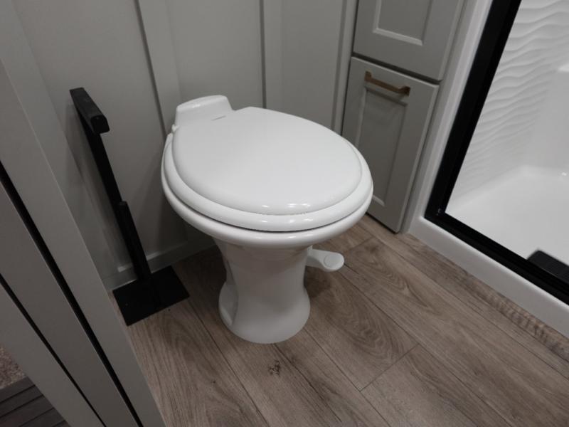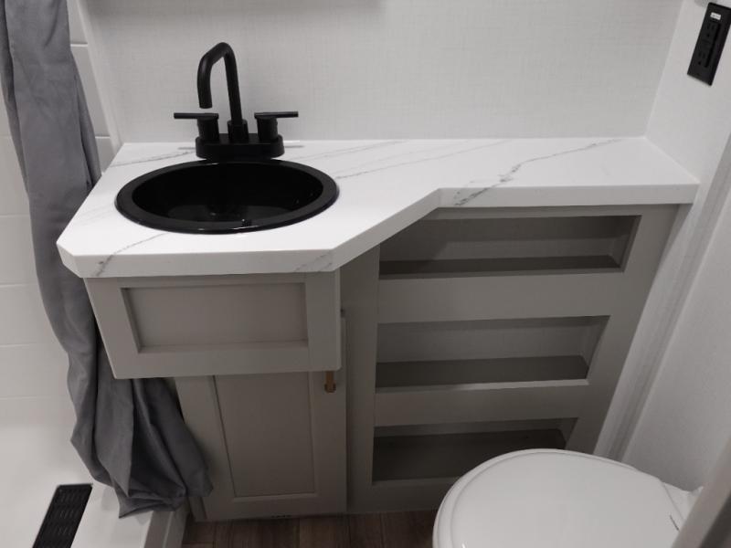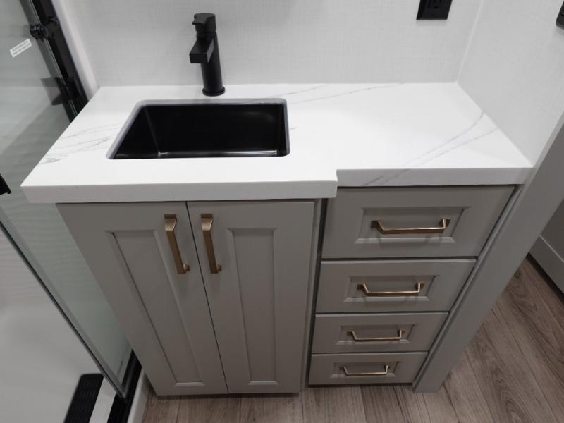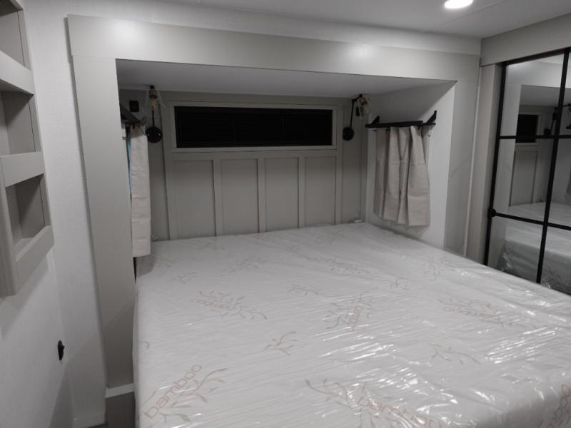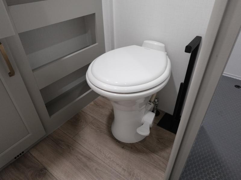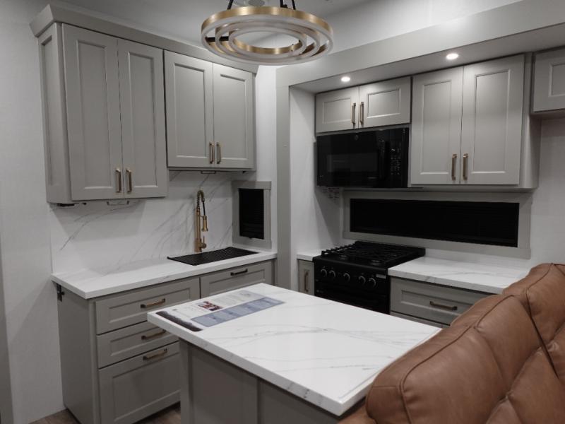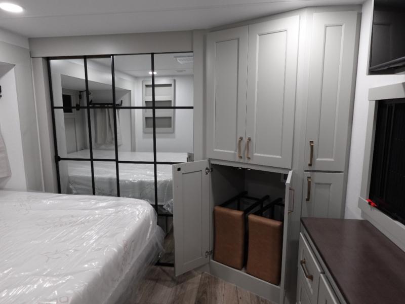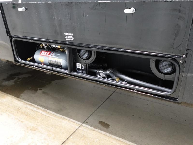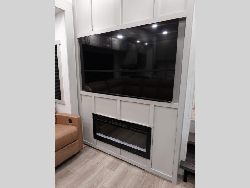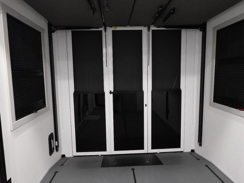 Whether you use this toy hauler to haul your favorite ride-on toys or as a mobile office, you're sure to love every inch of it! The 14' separate garage includes a Fold-N-Stow table and independent dual sofas, along with a full bath and a loft/storage with a twin bed for more sleeping space. The middle kitchen is every chef's dream with its GE appliances, kitchen island, and convenient features, such as pull-out trash bins and a cutting board, a pull-down knife rack and utensil tray, and a pull-out pantry/utility closet! Right next to the kitchen is the living room with a L-sofa with four modes, a 65" Phillips Smart TV and a fireplace, plus a convertible dining table/L-desk where you can dine or get some work done. You'll love the second full bath up front close to the private bedroom, and here, you'll find a king bed slide out, under-bed storage drawers and motion lights, a walk-in closet with cordless vacuum prep, and a sliding dresser top with hidden storage for valuables. There is also washer and dryer prep in the bedroom and garage, making this toy hauler full-time capable!