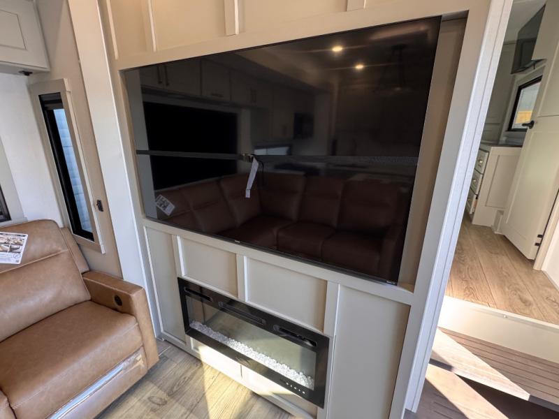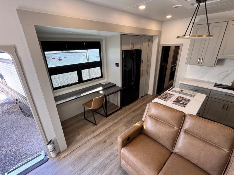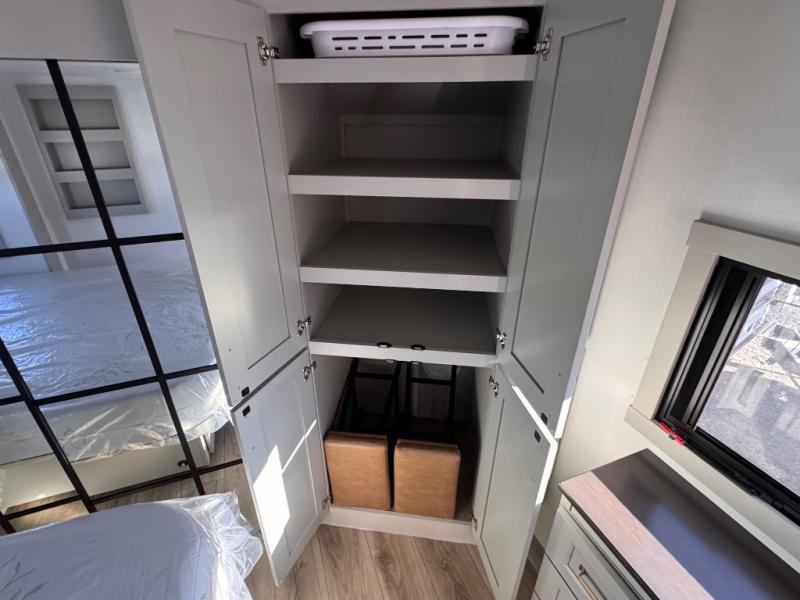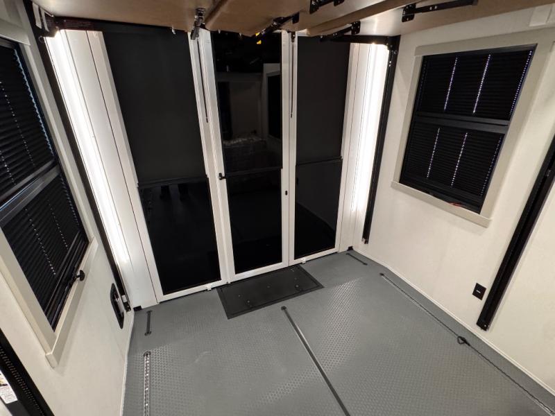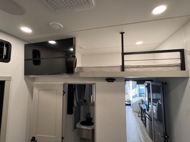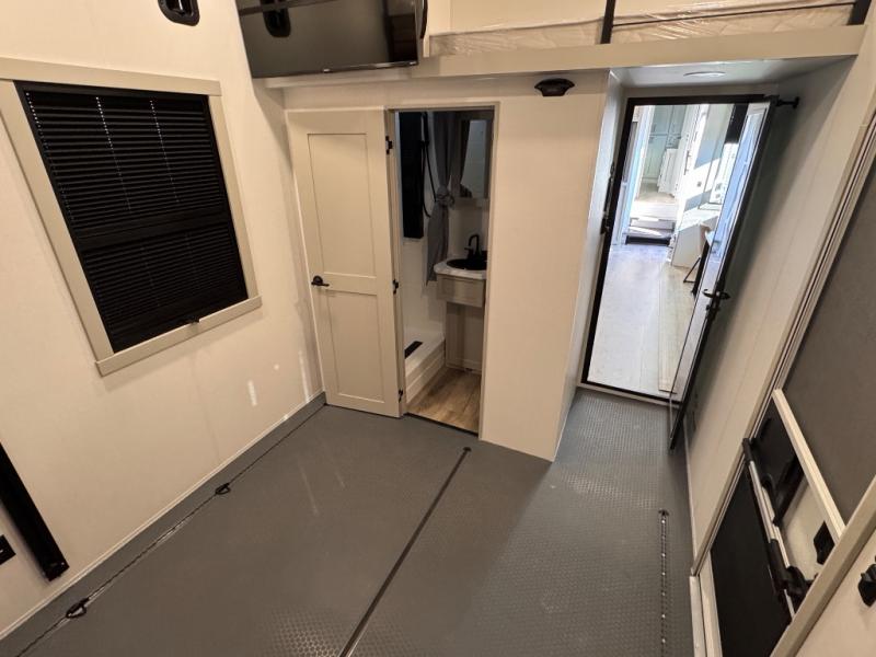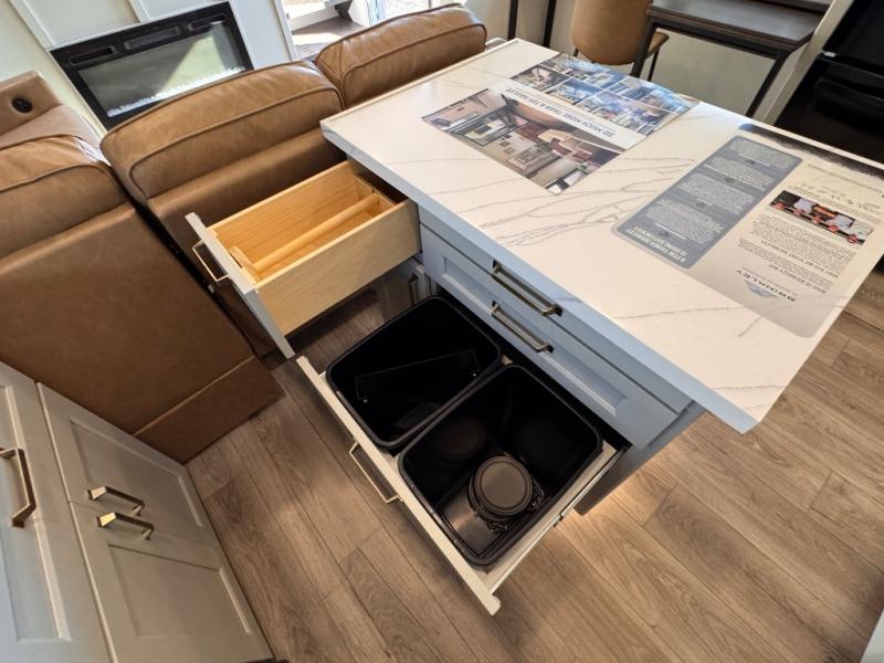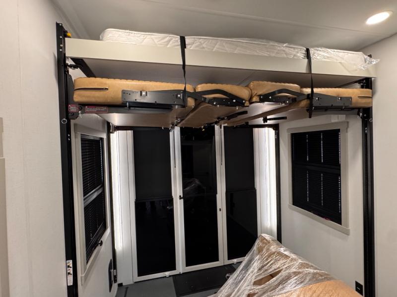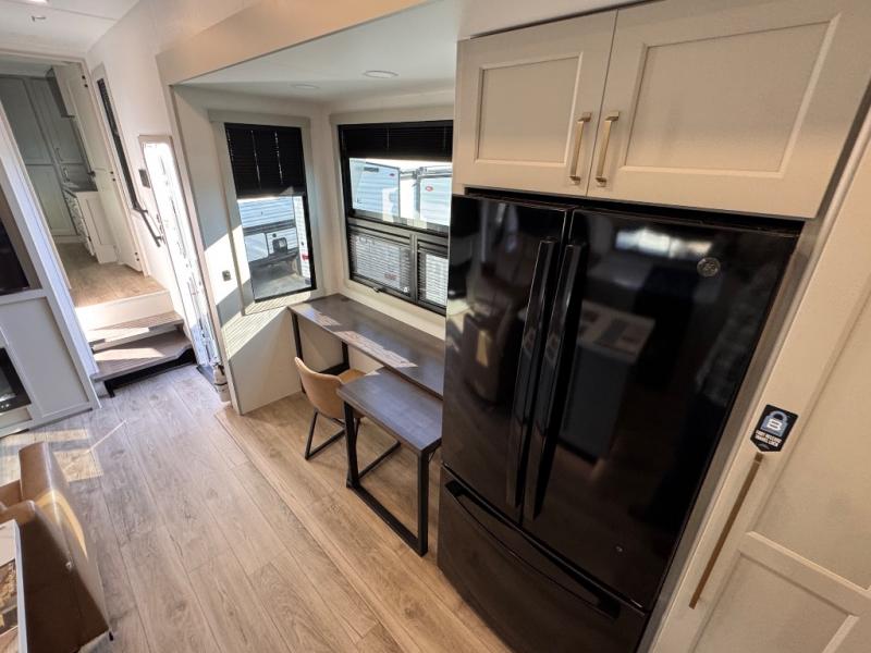 Whether you use this toy hauler to haul your favorite ride-on toys or as a mobile office, you're sure to love every inch of it! The 14' separate garage includes a Fold-N-Stow table and independent dual sofas, along with a full bath and a loft/storage with a twin bed for more sleeping space. The middle kitchen is every chef's dream with its GE appliances, kitchen island, and convenient features, such as pull-out trash bins and a cutting board, a pull-down knife rack and utensil tray, and a pull-out pantry/utility closet! Right next to the kitchen is the living room with a L-sofa with four modes, a 65" Phillips Smart TV and a fireplace, plus a convertible dining table/L-desk where you can dine or get some work done. You'll love the second full bath up front close to the private bedroom, and here, you'll find a king bed slide out, under-bed storage drawers and motion lights, a walk-in closet with cordless vacuum prep, and a sliding dresser top with hidden storage for valuables. There is also washer and dryer prep in the bedroom and garage, making this toy hauler full-time capable!