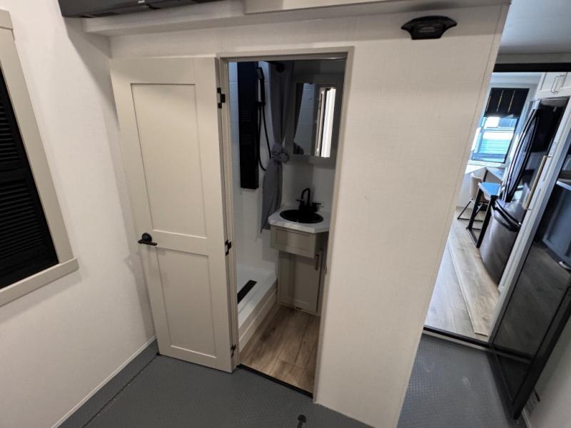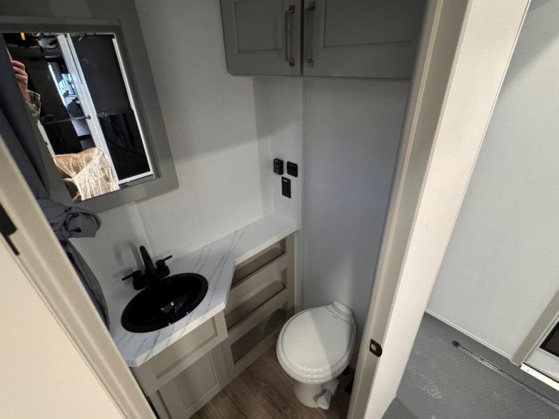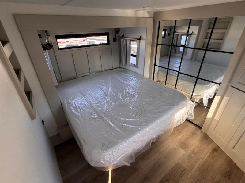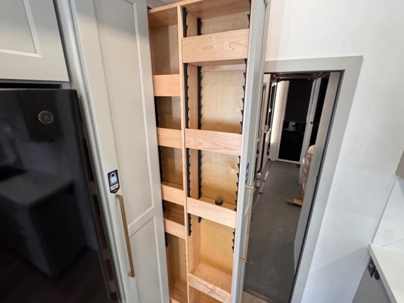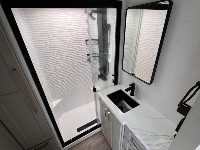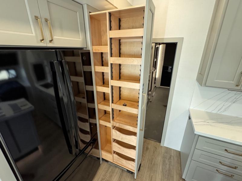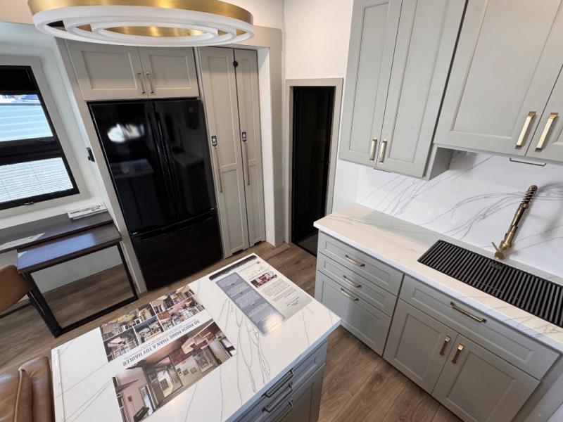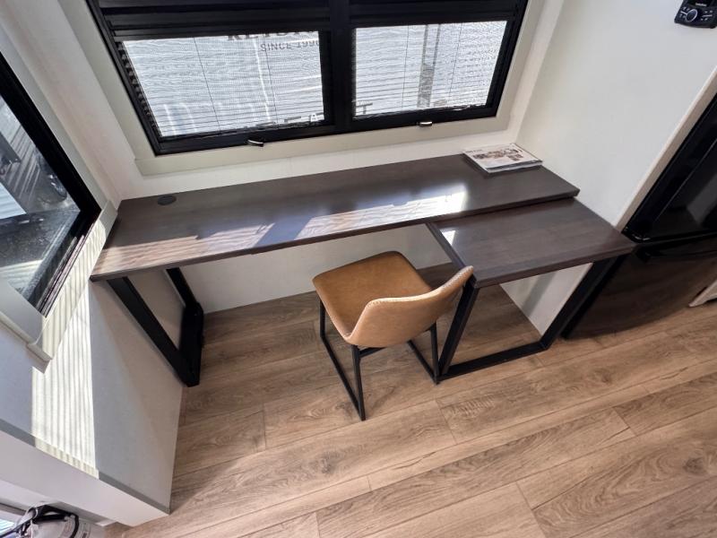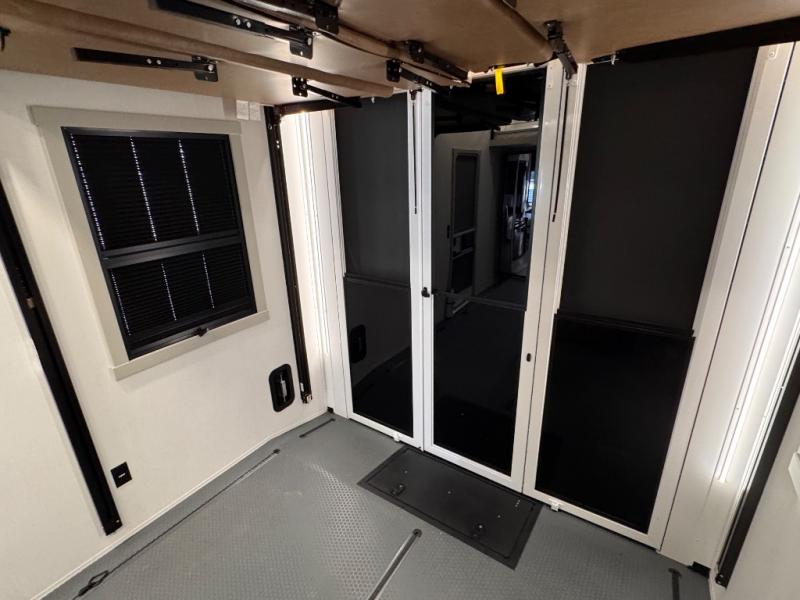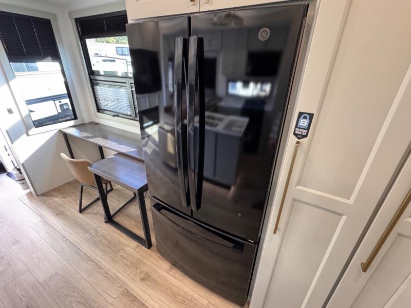 Whether you use this toy hauler to haul your favorite ride-on toys or as a mobile office, you're sure to love every inch of it! The 14' separate garage includes a Fold-N-Stow table and independent dual sofas, along with a full bath and a loft/storage with a twin bed for more sleeping space. The middle kitchen is every chef's dream with its GE appliances, kitchen island, and convenient features, such as pull-out trash bins and a cutting board, a pull-down knife rack and utensil tray, and a pull-out pantry/utility closet! Right next to the kitchen is the living room with a L-sofa with four modes, a 65" Phillips Smart TV and a fireplace, plus a convertible dining table/L-desk where you can dine or get some work done. You'll love the second full bath up front close to the private bedroom, and here, you'll find a king bed slide out, under-bed storage drawers and motion lights, a walk-in closet with cordless vacuum prep, and a sliding dresser top with hidden storage for valuables. There is also washer and dryer prep in the bedroom and garage, making this toy hauler full-time capable!