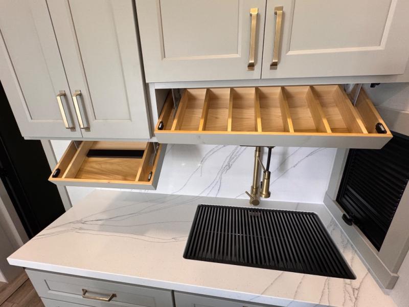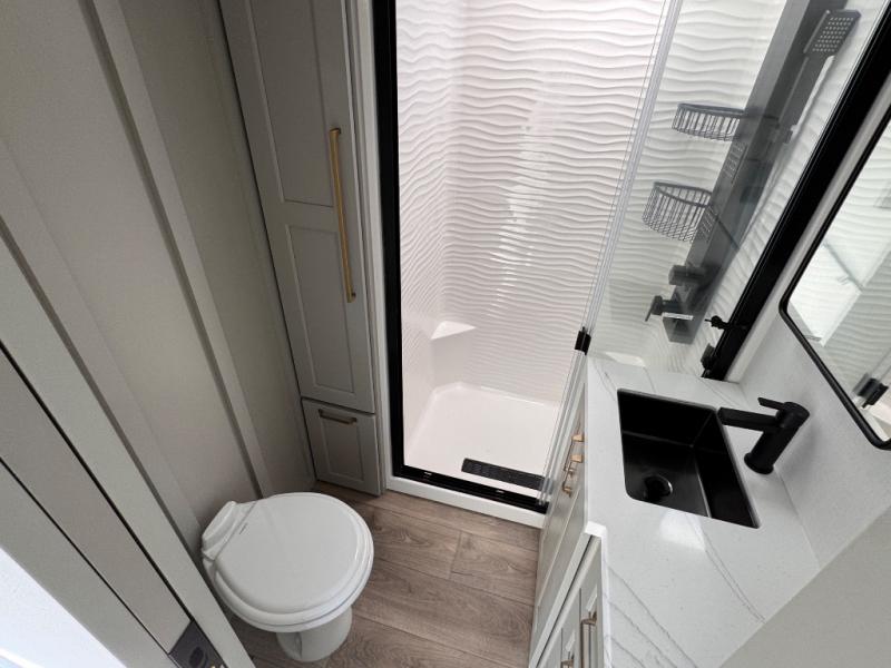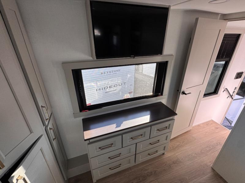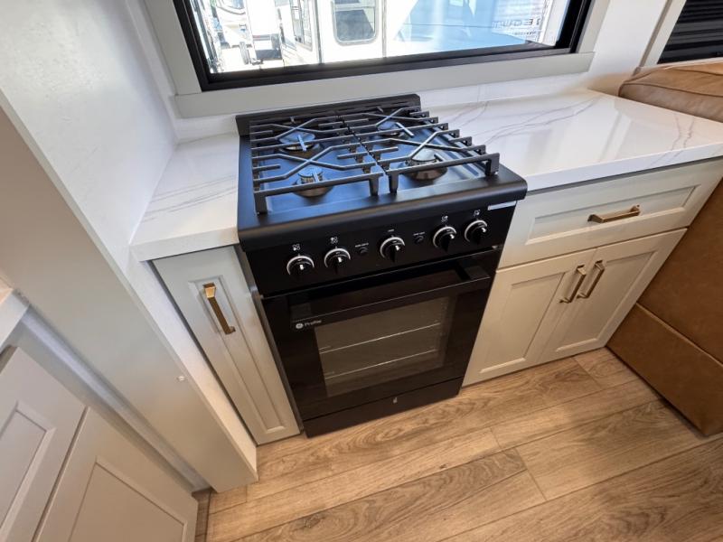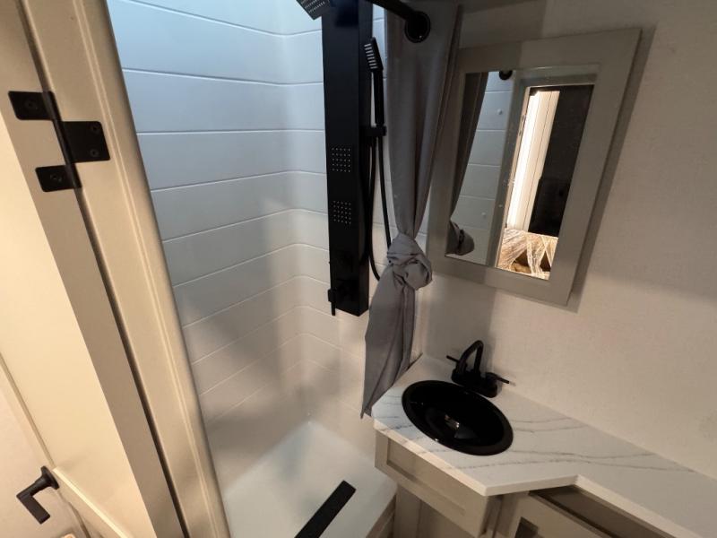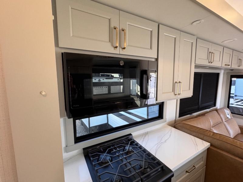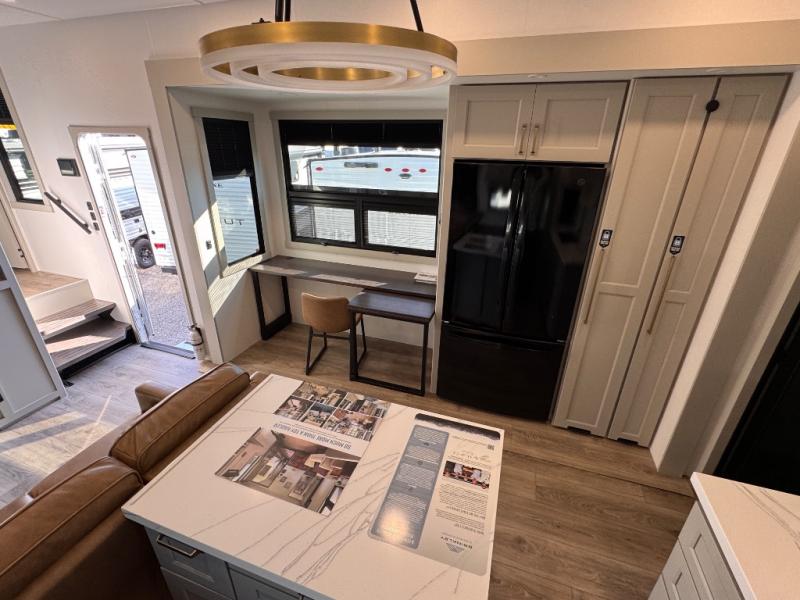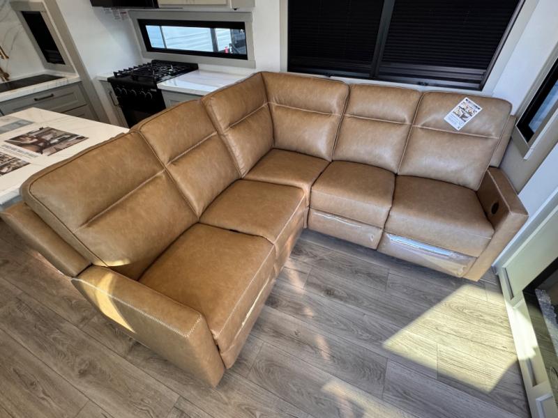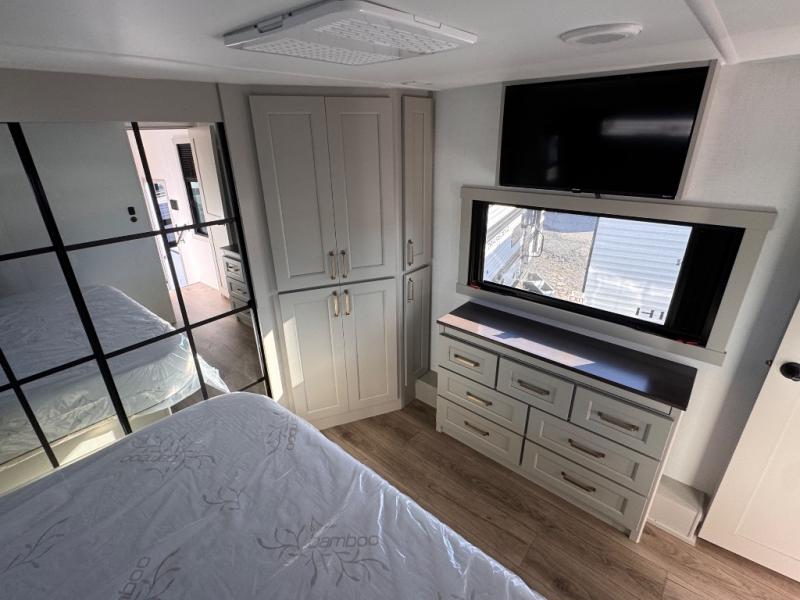 Whether you use this toy hauler to haul your favorite ride-on toys or as a mobile office, you're sure to love every inch of it! The 14' separate garage includes a Fold-N-Stow table and independent dual sofas, along with a full bath and a loft/storage with a twin bed for more sleeping space. The middle kitchen is every chef's dream with its GE appliances, kitchen island, and convenient features, such as pull-out trash bins and a cutting board, a pull-down knife rack and utensil tray, and a pull-out pantry/utility closet! Right next to the kitchen is the living room with a L-sofa with four modes, a 65" Phillips Smart TV and a fireplace, plus a convertible dining table/L-desk where you can dine or get some work done. You'll love the second full bath up front close to the private bedroom, and here, you'll find a king bed slide out, under-bed storage drawers and motion lights, a walk-in closet with cordless vacuum prep, and a sliding dresser top with hidden storage for valuables. There is also washer and dryer prep in the bedroom and garage, making this toy hauler full-time capable!