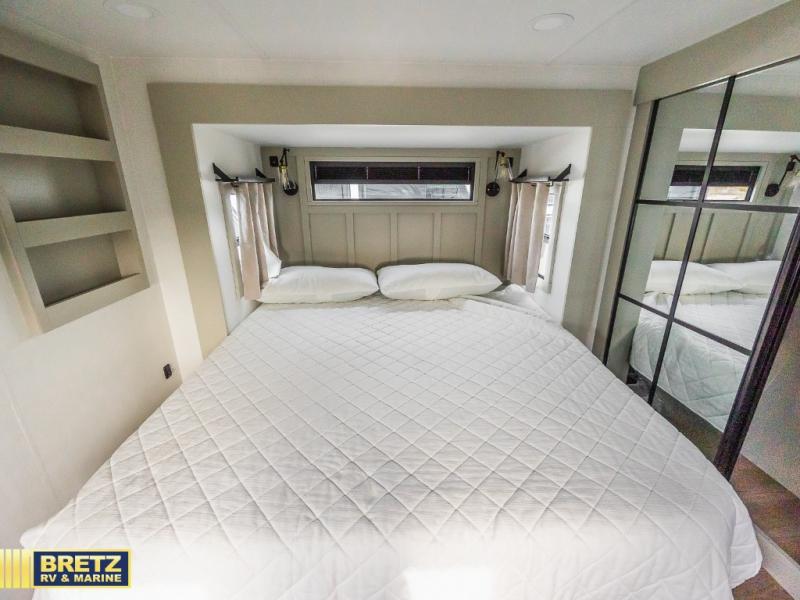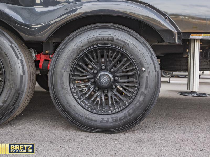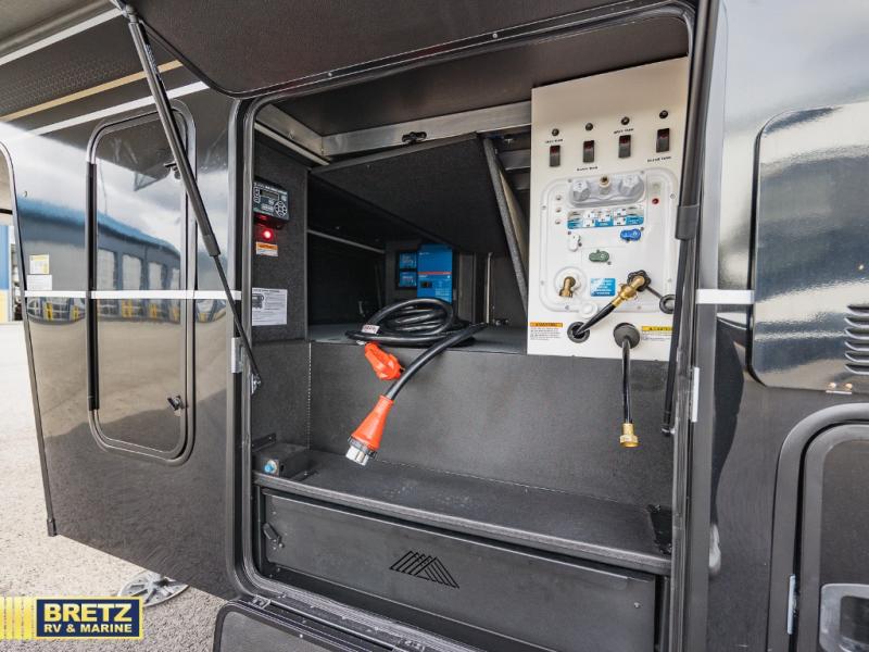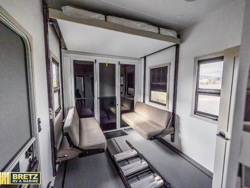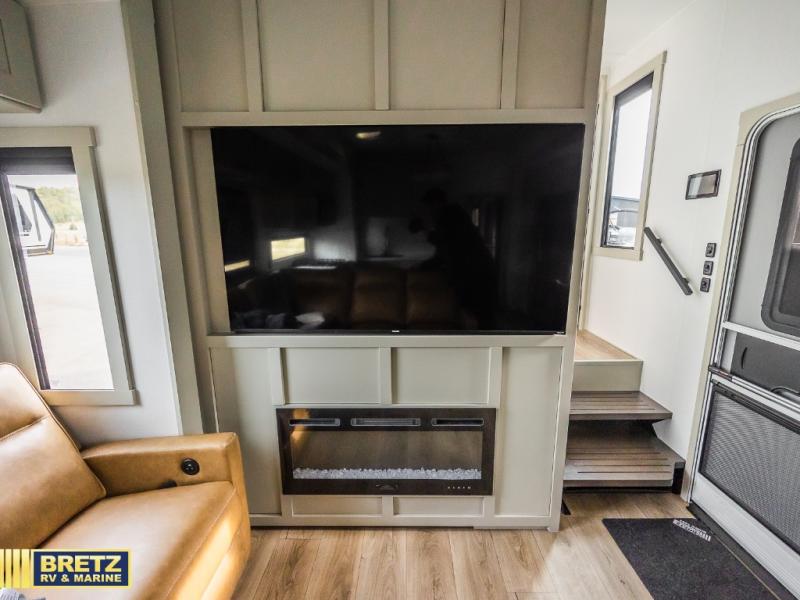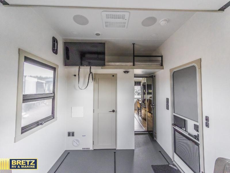 Whether you use this toy hauler to haul your favorite ride-on toys or as a mobile office, you're sure to love every inch of it! The 14' separate garage includes a Fold-N-Stow table and independent dual sofas, along with a full bath and a loft/storage with a twin bed for more sleeping space. The middle kitchen is every chef's dream with its GE appliances, kitchen island, and convenient features, such as pull-out trash bins and a cutting board, a pull-down knife rack and utensil tray, and a pull-out pantry/utility closet! Right next to the kitchen is the living room with a L-sofa with four modes, a 65" Phillips Smart TV and a fireplace, plus a convertible dining table/L-desk where you can dine or get some work done. You'll love the second full bath up front close to the private bedroom, and here, you'll find a king bed slide out, under-bed storage drawers and motion lights, a walk-in closet with cordless vacuum prep, and a sliding dresser top with hidden storage for valuables. There is also washer and dryer prep in the bedroom and garage, making this toy hauler full-time capable!