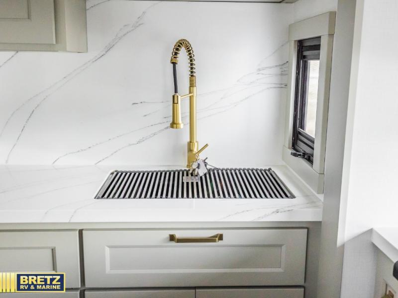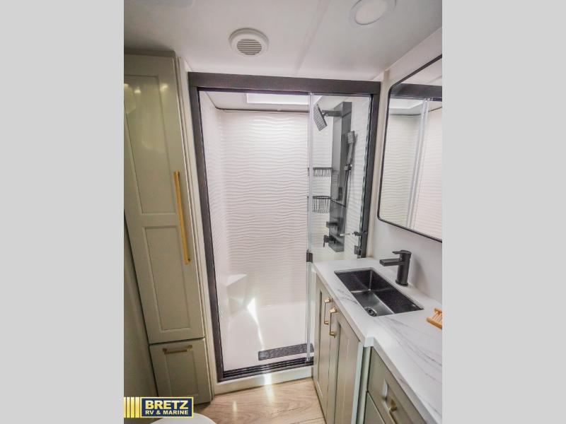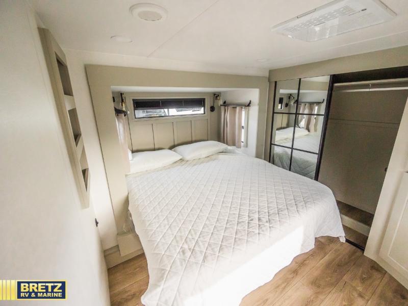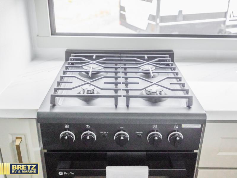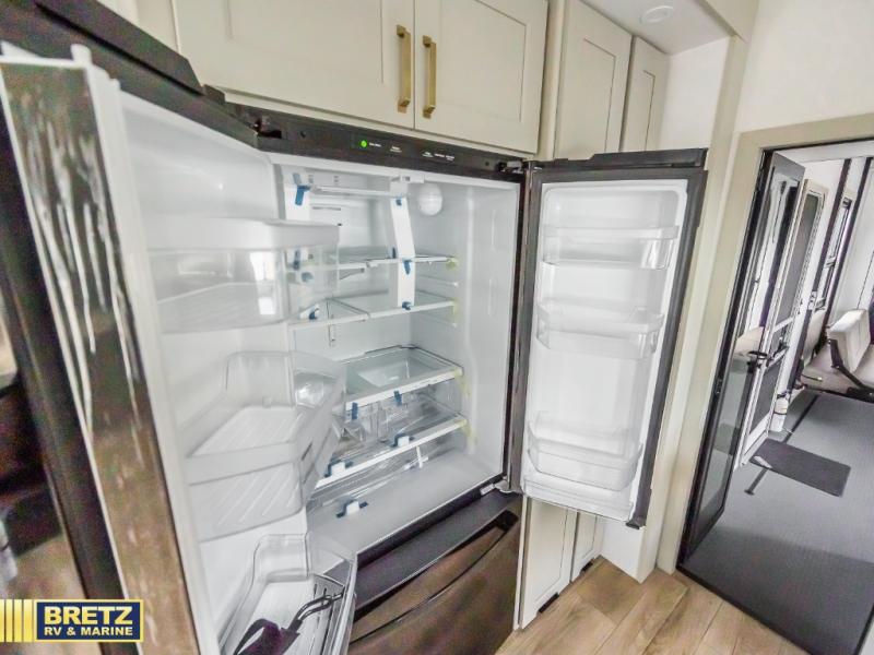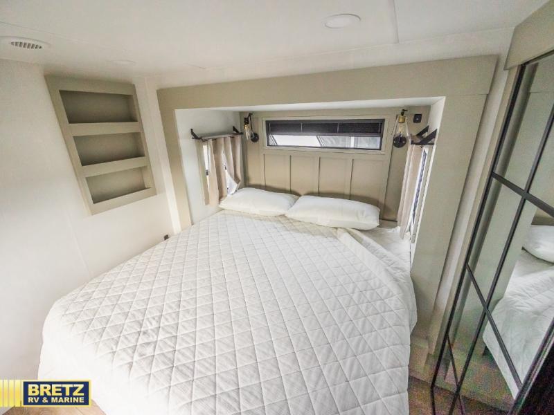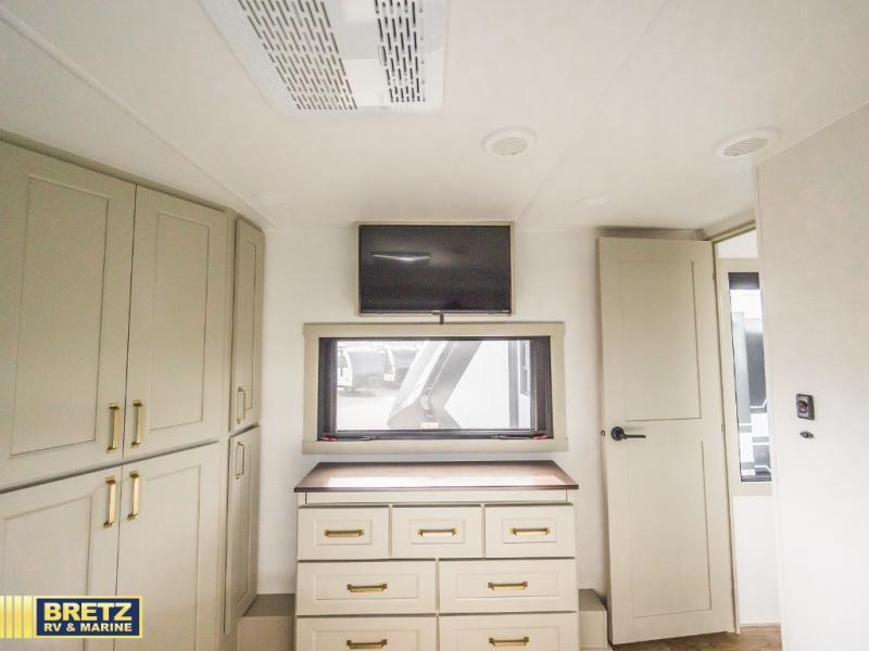 Whether you use this toy hauler to haul your favorite ride-on toys or as a mobile office, you're sure to love every inch of it! The 14' separate garage includes a Fold-N-Stow table and independent dual sofas, along with a full bath and a loft/storage with a twin bed for more sleeping space. The middle kitchen is every chef's dream with its GE appliances, kitchen island, and convenient features, such as pull-out trash bins and a cutting board, a pull-down knife rack and utensil tray, and a pull-out pantry/utility closet! Right next to the kitchen is the living room with a L-sofa with four modes, a 65" Phillips Smart TV and a fireplace, plus a convertible dining table/L-desk where you can dine or get some work done. You'll love the second full bath up front close to the private bedroom, and here, you'll find a king bed slide out, under-bed storage drawers and motion lights, a walk-in closet with cordless vacuum prep, and a sliding dresser top with hidden storage for valuables. There is also washer and dryer prep in the bedroom and garage, making this toy hauler full-time capable!