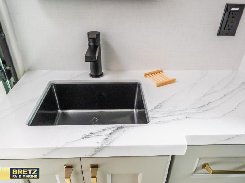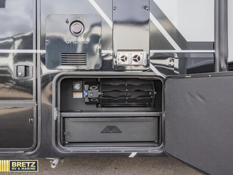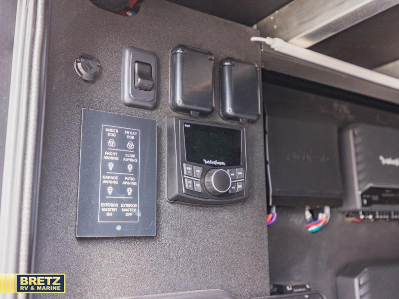With any Model G toy hauler fifth wheel by Brinkley you will enjoy luxurious amenities, tons of storage space, and innovative features that have been developed and tested in the real world. Durable construction includes an industry leading PDI process, an industry best insulation package, and reinforced and walkable slide roofs. Some of the exterior features you'll find are a 3-way pass-through with a multi-functional flip-up bulkhead wall, under I-beam storage, a MAX-Vision reverse lighting system, and a low-maintenance roof to name a few. A Rockford Fosgate audio system comes standard, along with a OneControl app system that lets you control your fifth wheel's functions right from your mobile device. You will find the solar system with a designated storage area to be ultra convenient, plus there is a FlexPower 5500 with a dual fuel inverter generator for all your power needs. Head inside to find a residential interior with Brinkley's CraftSense wood trim construction, floating entrance steps, integrated window screens and insulated blackout blinds, and residential solid surface countertops plus backsplash. You will also enjoy the neon shower lighting and recessed medicine cabinets in the bath, plus motion activated LED bed lights and dual bedside outlets in the bedroom. Choose a Model G toy hauler fifth wheel to experience all the luxury it has to offer!