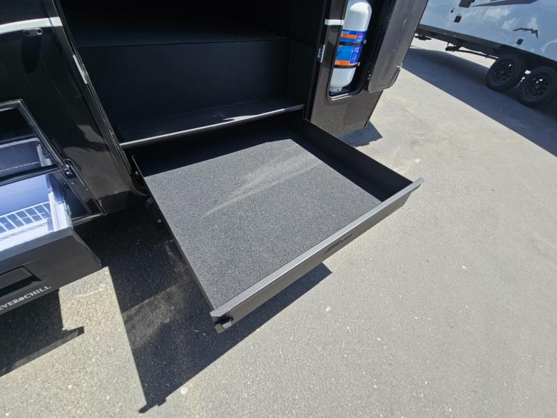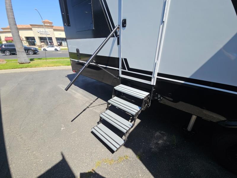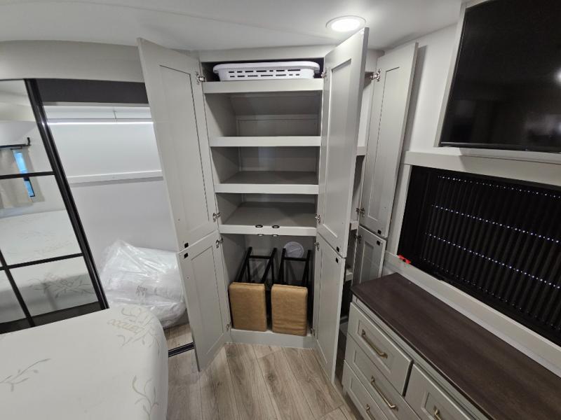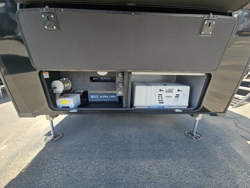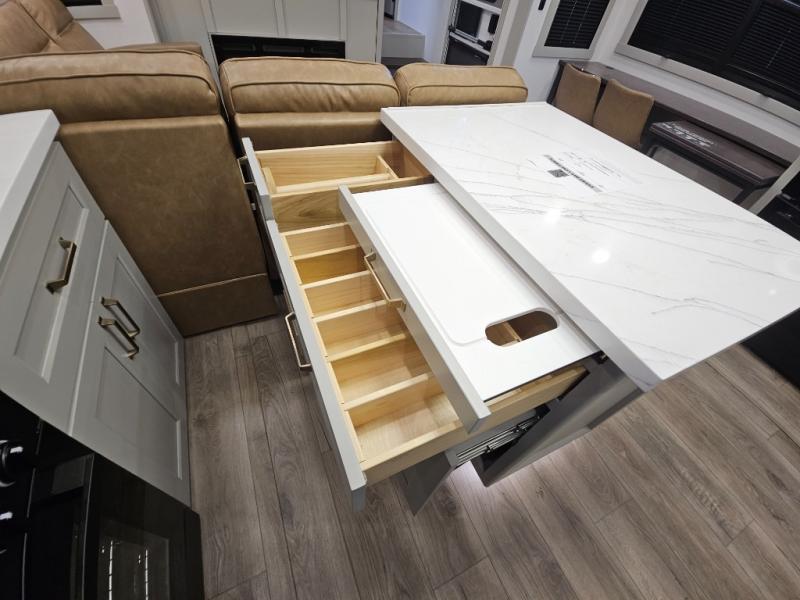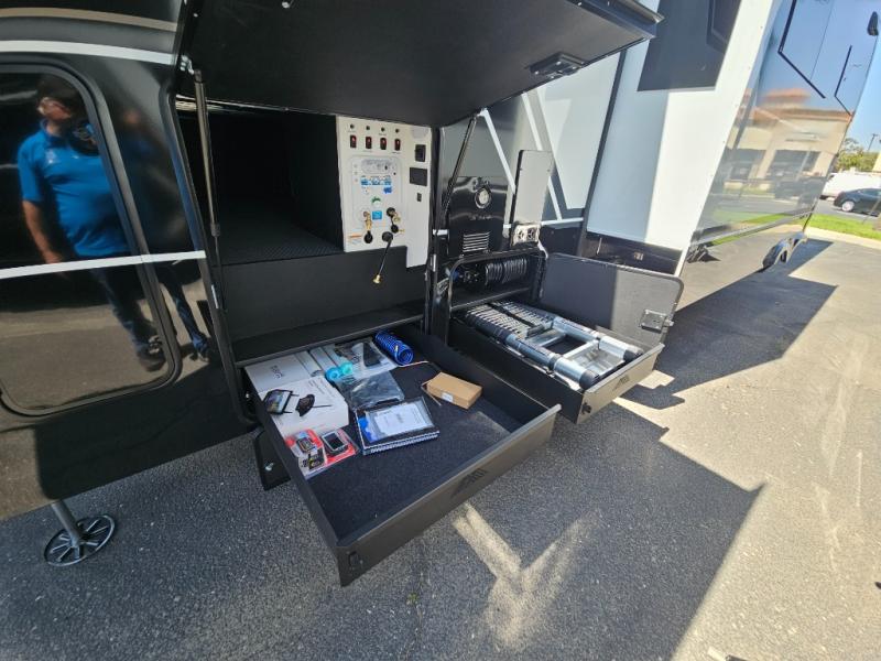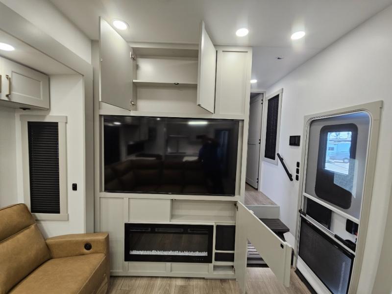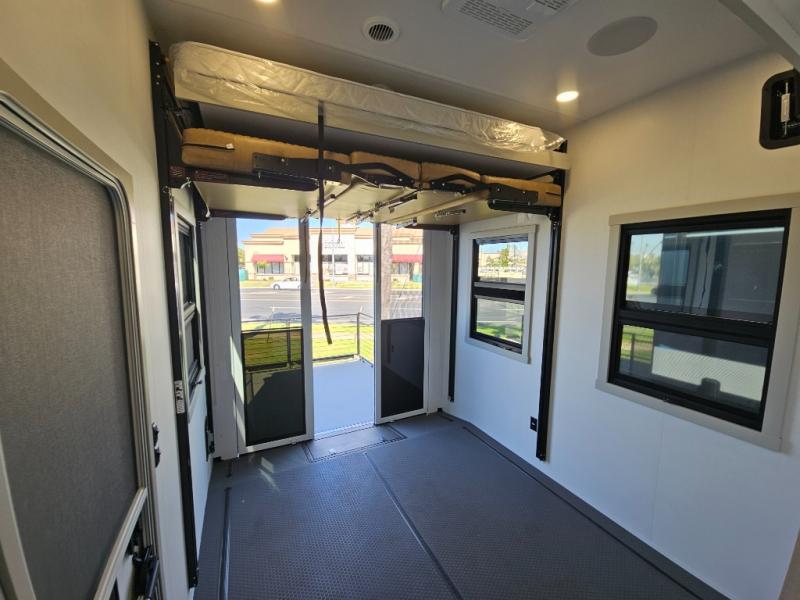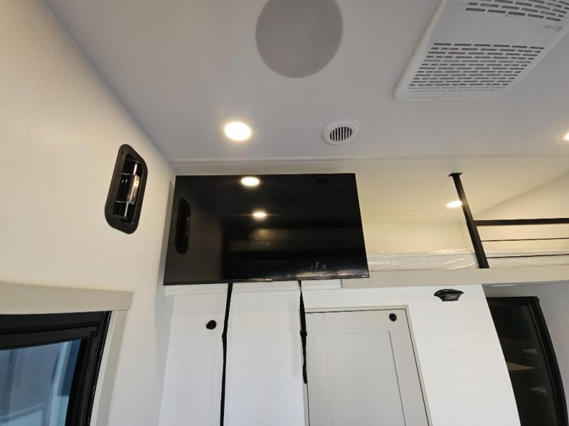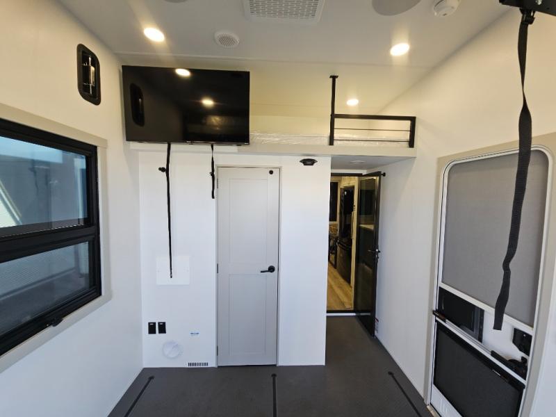 Whether you use this toy hauler to haul your favorite ride-on toys or as a mobile office, you're sure to love every inch of it! The 14' separate garage includes a Fold-N-Stow table and independent dual sofas, along with a full bath and a loft/storage with a twin bed for more sleeping space. The middle kitchen is every chef's dream with its GE appliances, kitchen island, and convenient features, such as pull-out trash bins and a cutting board, a pull-down knife rack and utensil tray, and a pull-out pantry/utility closet! Right next to the kitchen is the living room with a L-sofa with four modes, a 65" Phillips Smart TV and a fireplace, plus a convertible dining table/L-desk where you can dine or get some work done. You'll love the second full bath up front close to the private bedroom, and here, you'll find a king bed slide out, under-bed storage drawers and motion lights, a walk-in closet with cordless vacuum prep, and a sliding dresser top with hidden storage for valuables. There is also washer and dryer prep in the bedroom and garage, making this toy hauler full-time capable!