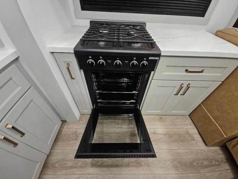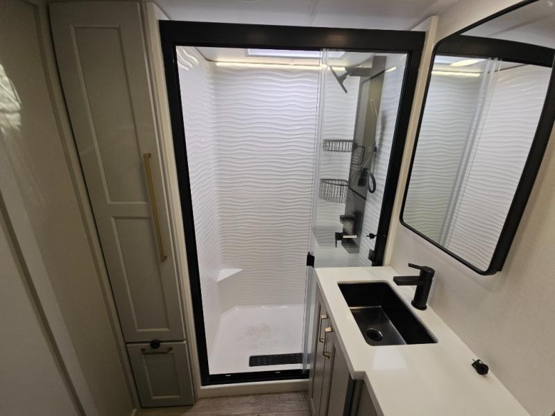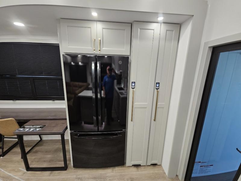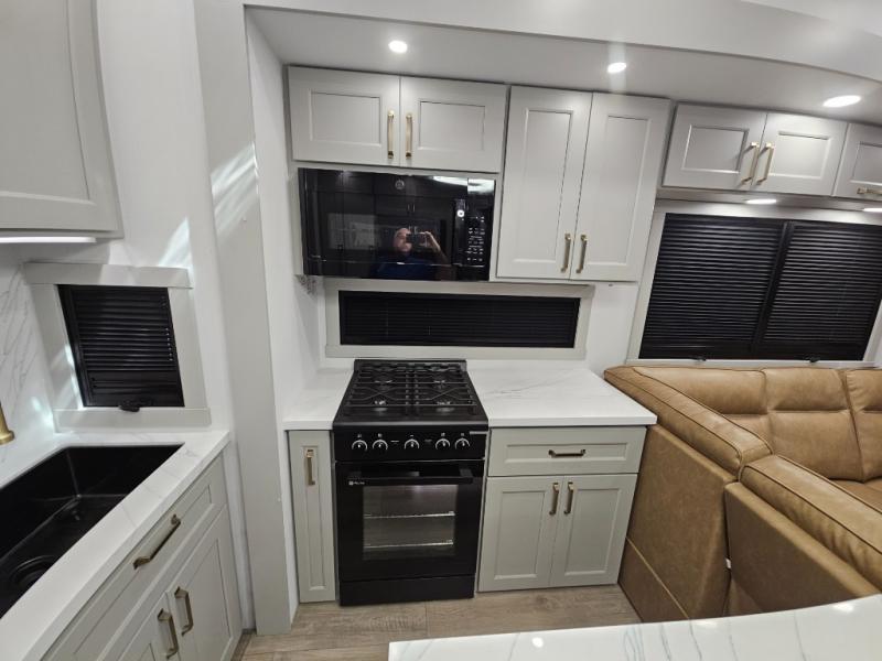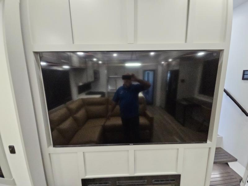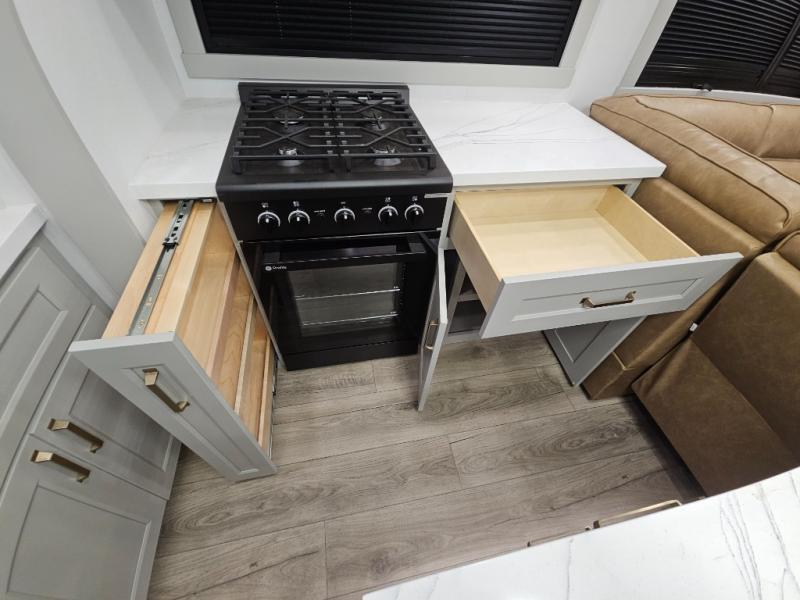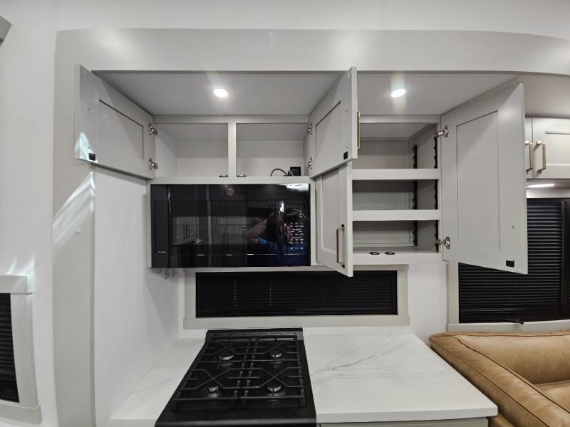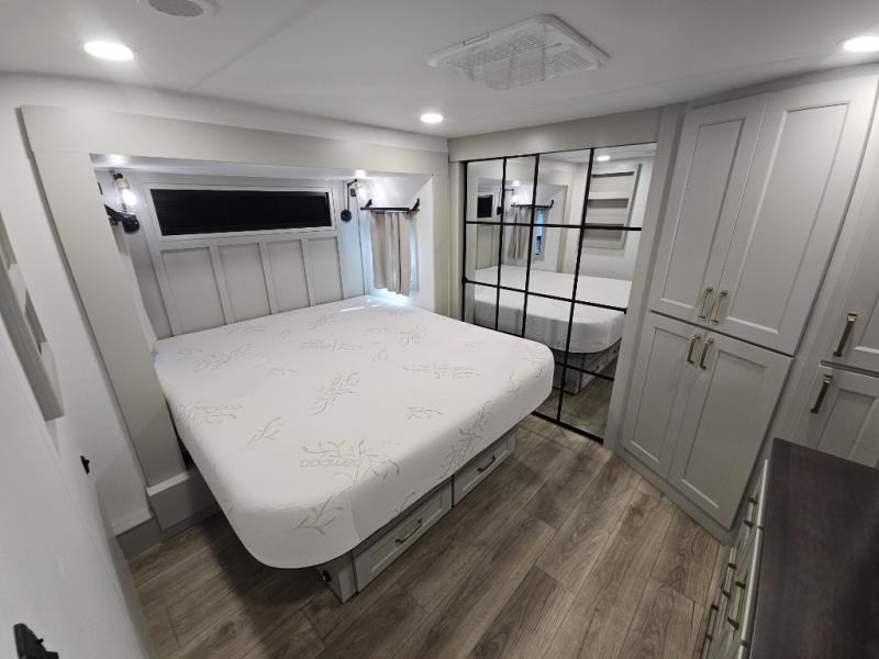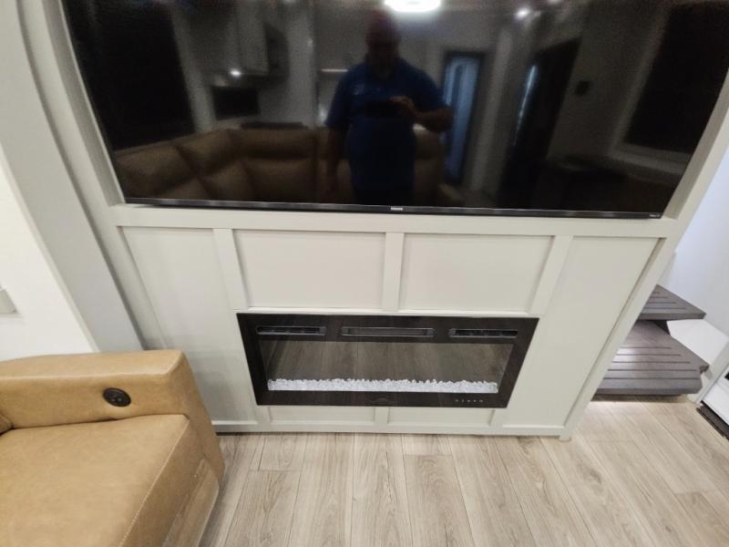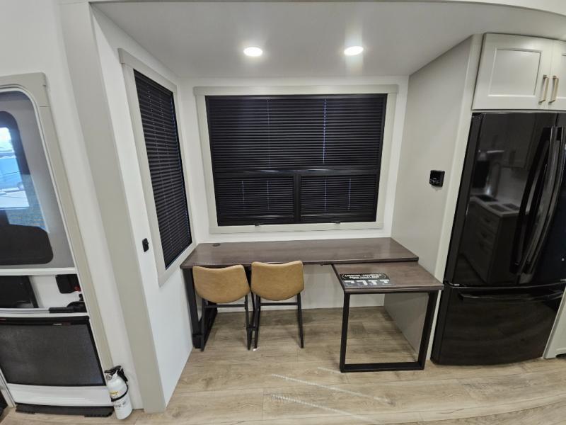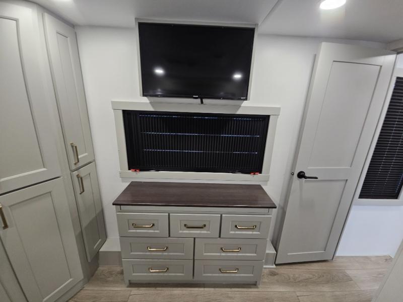 Whether you use this toy hauler to haul your favorite ride-on toys or as a mobile office, you're sure to love every inch of it! The 14' separate garage includes a Fold-N-Stow table and independent dual sofas, along with a full bath and a loft/storage with a twin bed for more sleeping space. The middle kitchen is every chef's dream with its GE appliances, kitchen island, and convenient features, such as pull-out trash bins and a cutting board, a pull-down knife rack and utensil tray, and a pull-out pantry/utility closet! Right next to the kitchen is the living room with a L-sofa with four modes, a 65" Phillips Smart TV and a fireplace, plus a convertible dining table/L-desk where you can dine or get some work done. You'll love the second full bath up front close to the private bedroom, and here, you'll find a king bed slide out, under-bed storage drawers and motion lights, a walk-in closet with cordless vacuum prep, and a sliding dresser top with hidden storage for valuables. There is also washer and dryer prep in the bedroom and garage, making this toy hauler full-time capable!