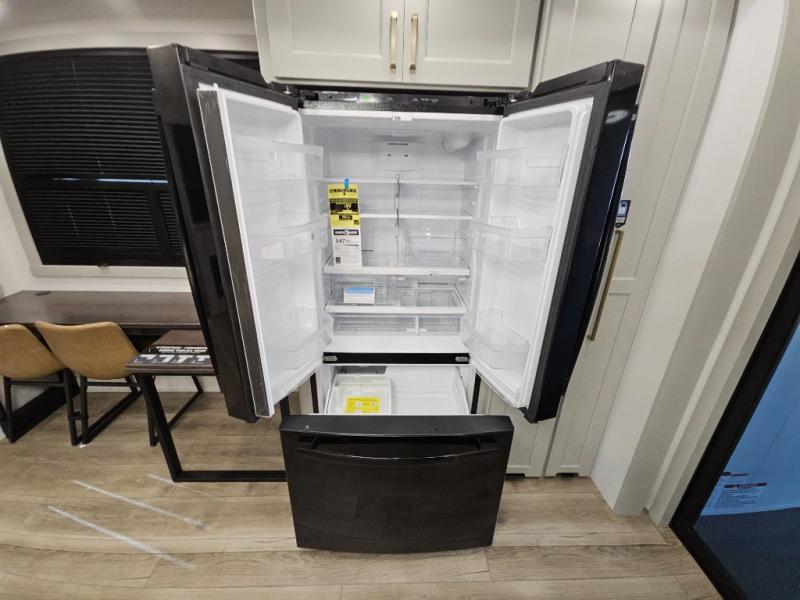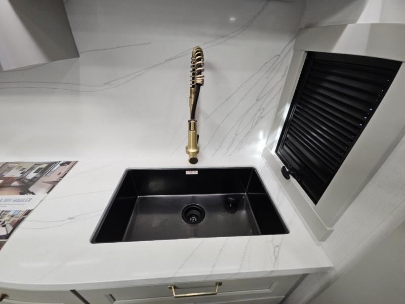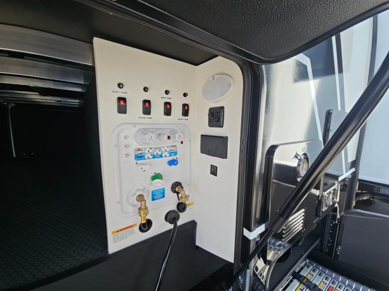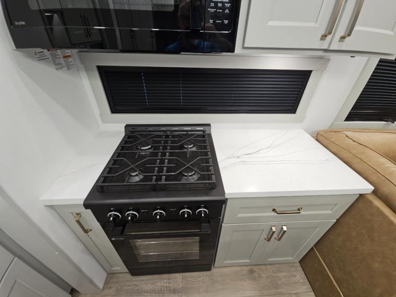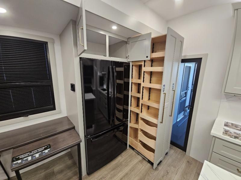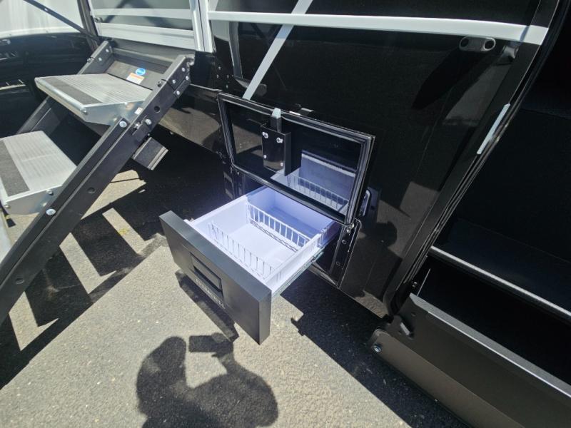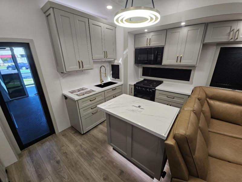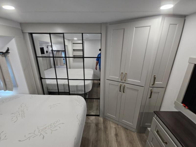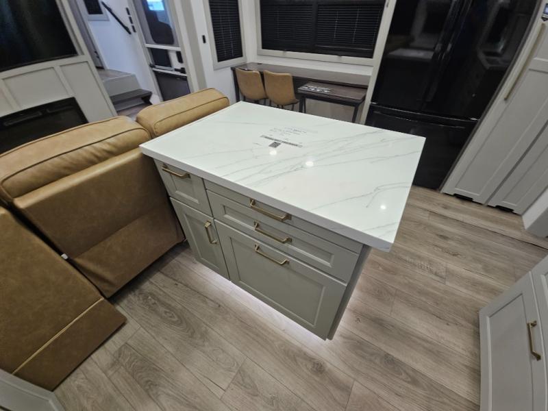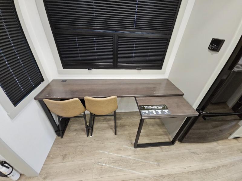 Whether you use this toy hauler to haul your favorite ride-on toys or as a mobile office, you're sure to love every inch of it! The 14' separate garage includes a Fold-N-Stow table and independent dual sofas, along with a full bath and a loft/storage with a twin bed for more sleeping space. The middle kitchen is every chef's dream with its GE appliances, kitchen island, and convenient features, such as pull-out trash bins and a cutting board, a pull-down knife rack and utensil tray, and a pull-out pantry/utility closet! Right next to the kitchen is the living room with a L-sofa with four modes, a 65" Phillips Smart TV and a fireplace, plus a convertible dining table/L-desk where you can dine or get some work done. You'll love the second full bath up front close to the private bedroom, and here, you'll find a king bed slide out, under-bed storage drawers and motion lights, a walk-in closet with cordless vacuum prep, and a sliding dresser top with hidden storage for valuables. There is also washer and dryer prep in the bedroom and garage, making this toy hauler full-time capable!