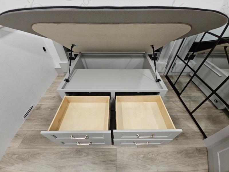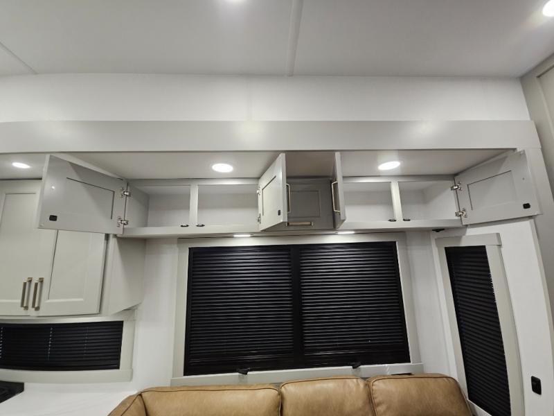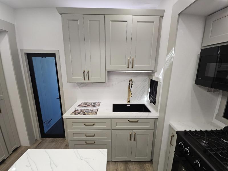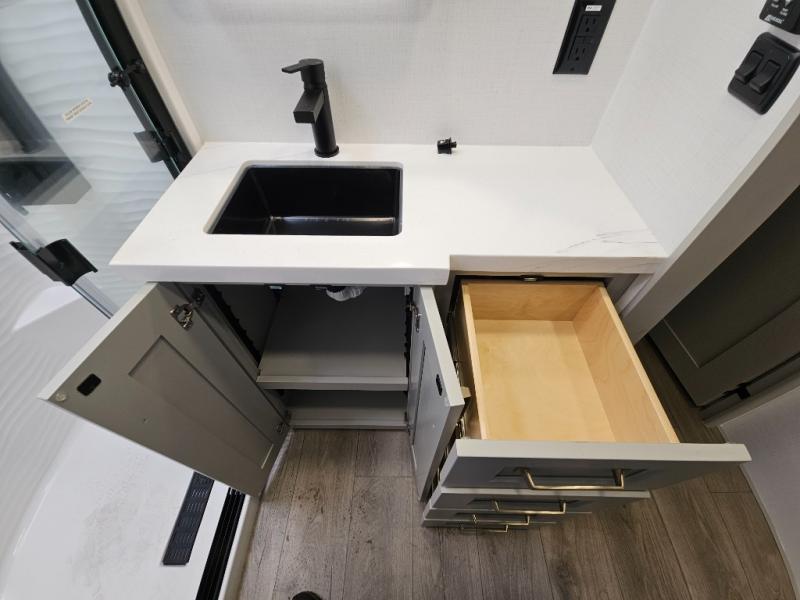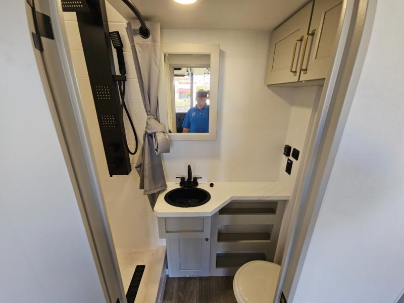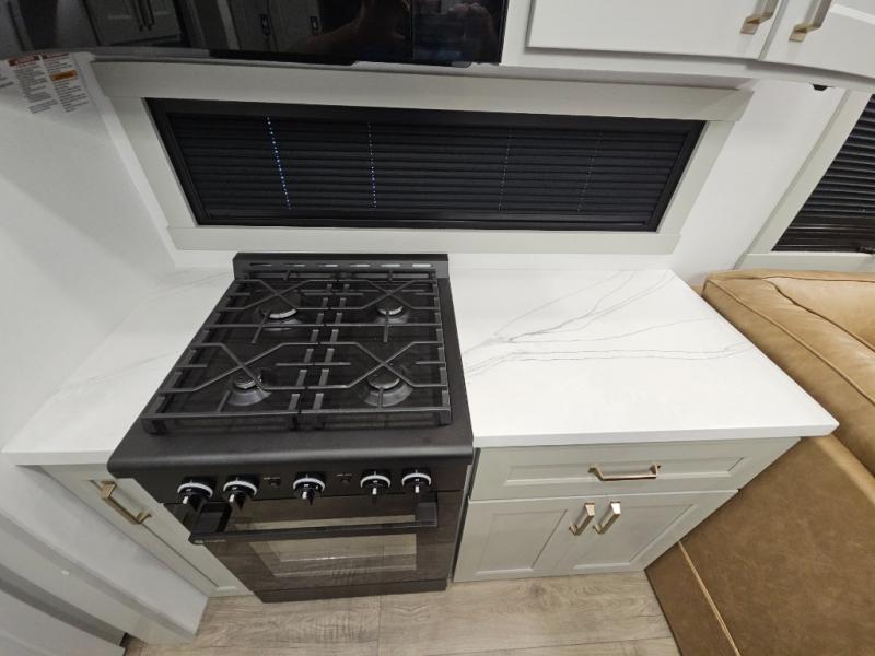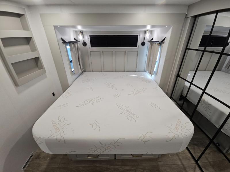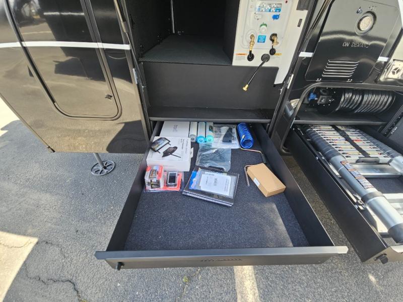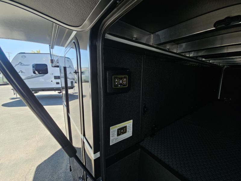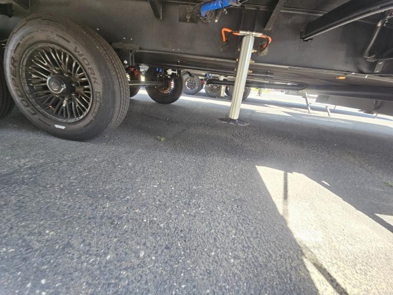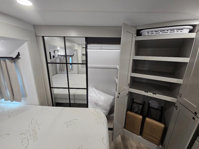 Whether you use this toy hauler to haul your favorite ride-on toys or as a mobile office, you're sure to love every inch of it! The 14' separate garage includes a Fold-N-Stow table and independent dual sofas, along with a full bath and a loft/storage with a twin bed for more sleeping space. The middle kitchen is every chef's dream with its GE appliances, kitchen island, and convenient features, such as pull-out trash bins and a cutting board, a pull-down knife rack and utensil tray, and a pull-out pantry/utility closet! Right next to the kitchen is the living room with a L-sofa with four modes, a 65" Phillips Smart TV and a fireplace, plus a convertible dining table/L-desk where you can dine or get some work done. You'll love the second full bath up front close to the private bedroom, and here, you'll find a king bed slide out, under-bed storage drawers and motion lights, a walk-in closet with cordless vacuum prep, and a sliding dresser top with hidden storage for valuables. There is also washer and dryer prep in the bedroom and garage, making this toy hauler full-time capable!