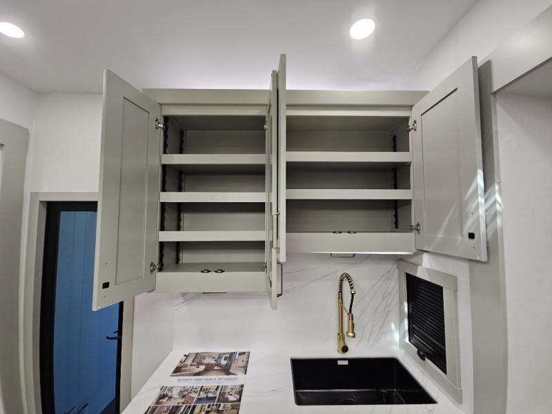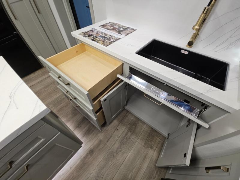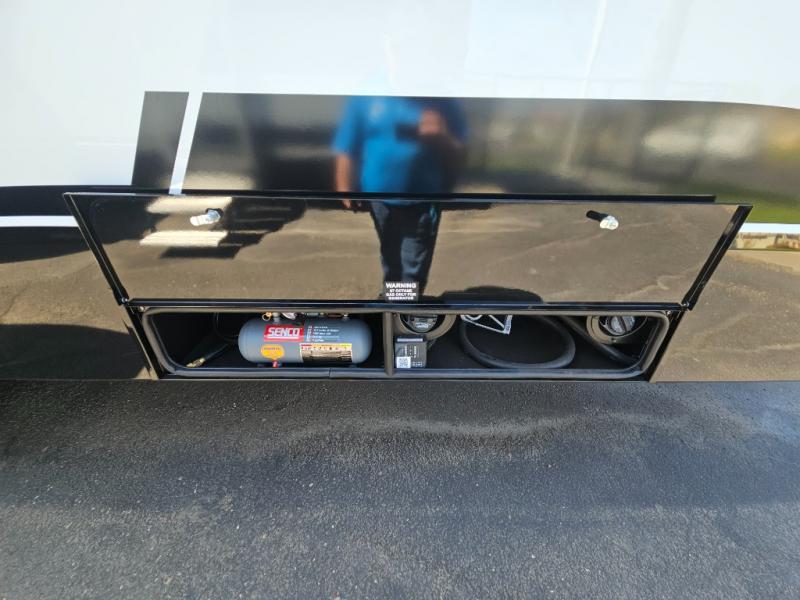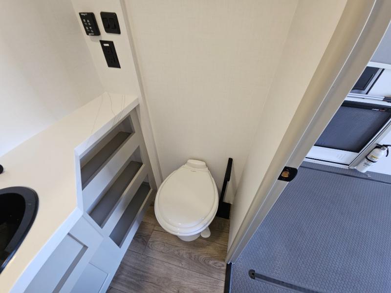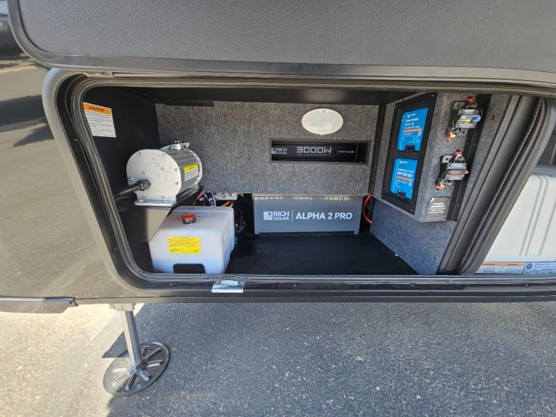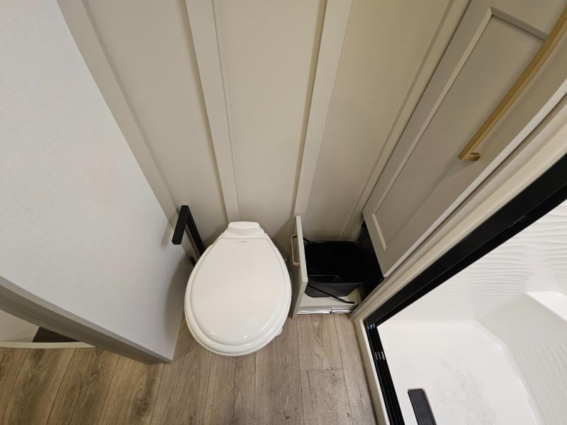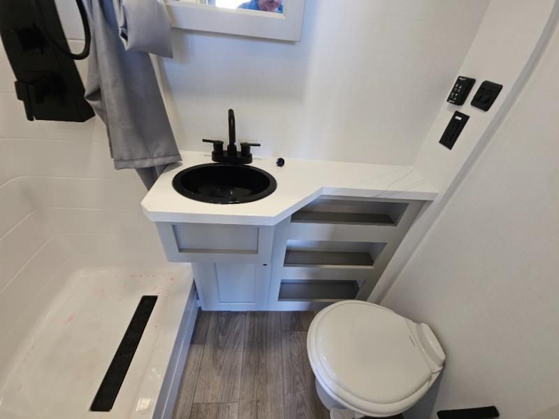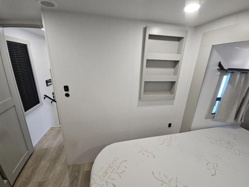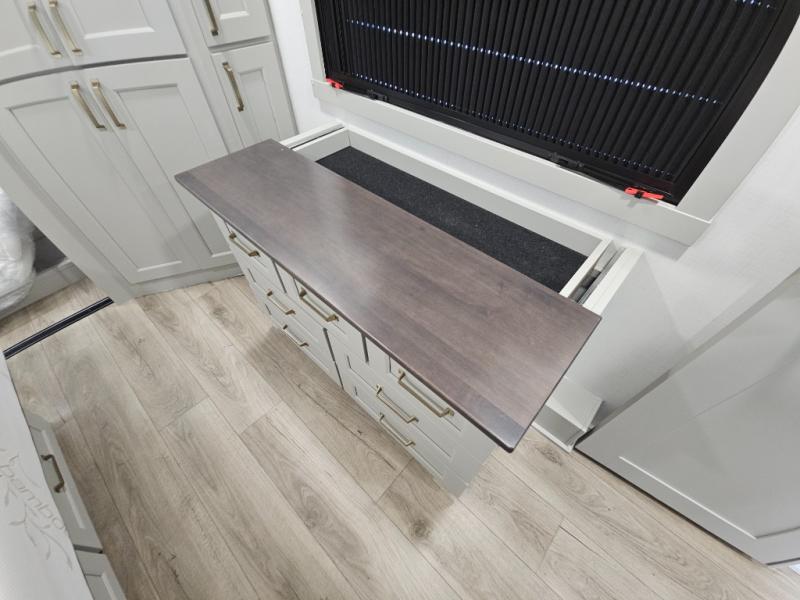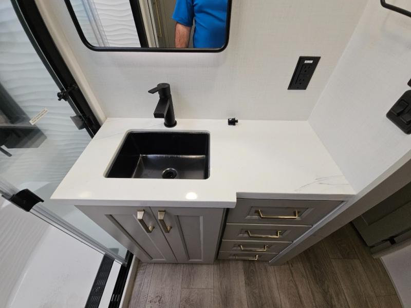 Whether you use this toy hauler to haul your favorite ride-on toys or as a mobile office, you're sure to love every inch of it! The 14' separate garage includes a Fold-N-Stow table and independent dual sofas, along with a full bath and a loft/storage with a twin bed for more sleeping space. The middle kitchen is every chef's dream with its GE appliances, kitchen island, and convenient features, such as pull-out trash bins and a cutting board, a pull-down knife rack and utensil tray, and a pull-out pantry/utility closet! Right next to the kitchen is the living room with a L-sofa with four modes, a 65" Phillips Smart TV and a fireplace, plus a convertible dining table/L-desk where you can dine or get some work done. You'll love the second full bath up front close to the private bedroom, and here, you'll find a king bed slide out, under-bed storage drawers and motion lights, a walk-in closet with cordless vacuum prep, and a sliding dresser top with hidden storage for valuables. There is also washer and dryer prep in the bedroom and garage, making this toy hauler full-time capable!