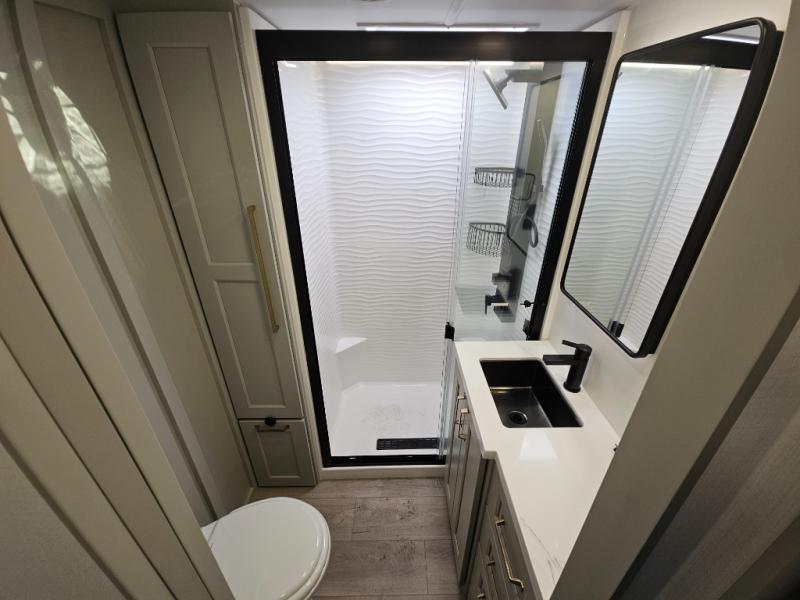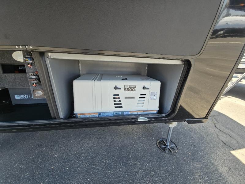 With any Model G toy hauler fifth wheel by Brinkley you will enjoy luxurious amenities, tons of storage space, and innovative features that have been developed and tested in the real world. Durable construction includes an industry leading PDI process, an industry best insulation package, and reinforced and walkable slide roofs. Some of the exterior features you'll find are a 3-way pass-through with a multi-functional flip-up bulkhead wall, under I-beam storage, a MAX-Vision reverse lighting system, and a low-maintenance roof to name a few. A Rockford Fosgate audio system comes standard, along with a OneControl app system that lets you control your fifth wheel's functions right from your mobile device. You will find the solar system with a designated storage area to be ultra convenient, plus there is a FlexPower 5500 with a dual fuel inverter generator for all your power needs. Head inside to find a residential interior with Brinkley's CraftSense wood trim construction, floating entrance steps, integrated window screens and insulated blackout blinds, and residential solid surface countertops plus backsplash. You will also enjoy the neon shower lighting and recessed medicine cabinets in the bath, plus motion activated LED bed lights and dual bedside outlets in the bedroom. Choose a Model G toy hauler fifth wheel to experience all the luxury it has to offer!