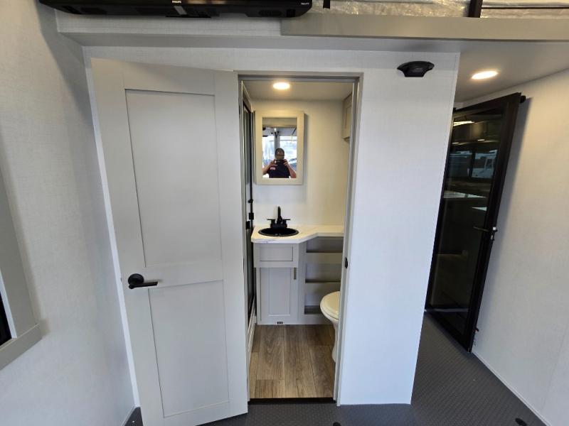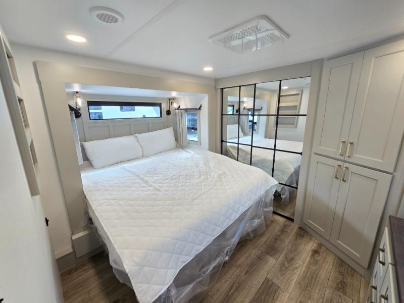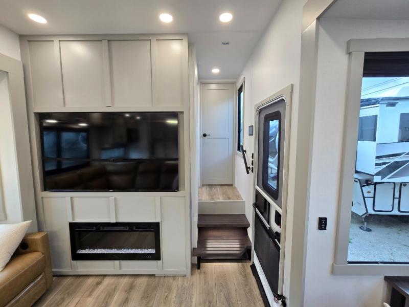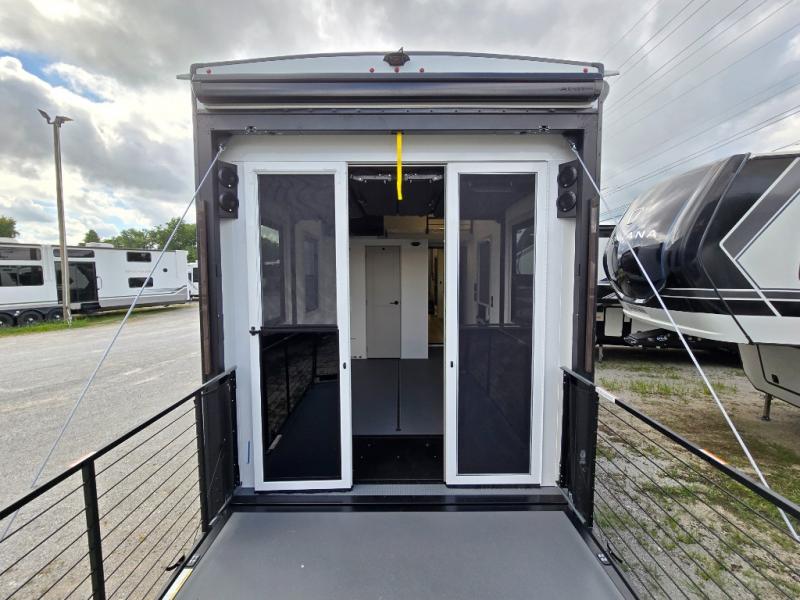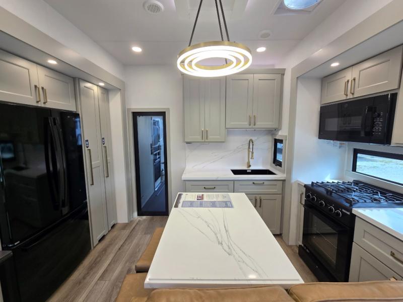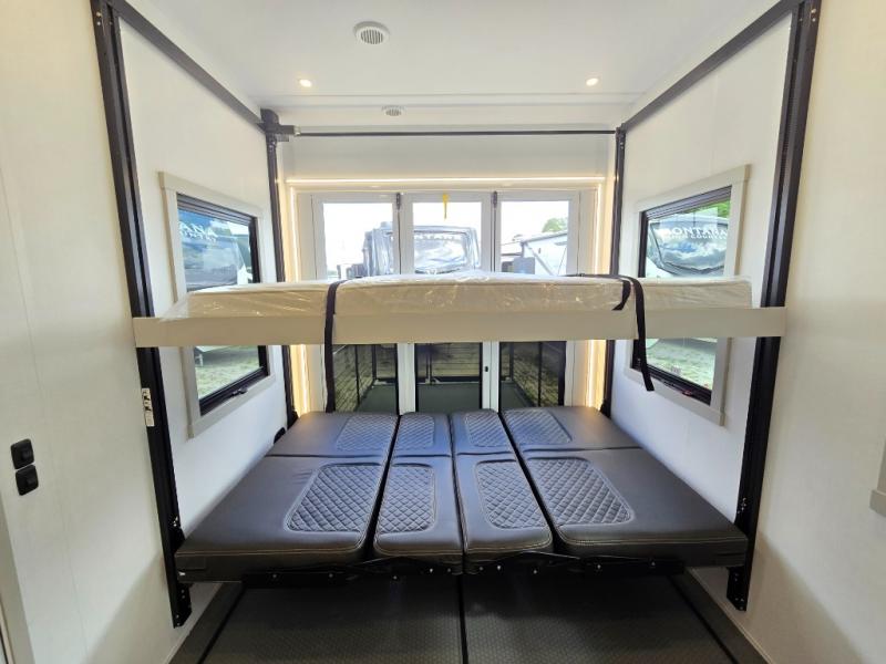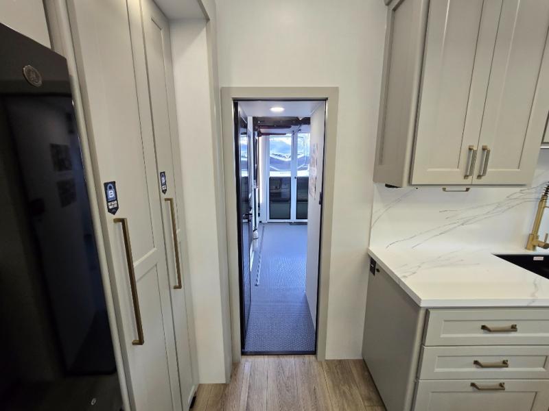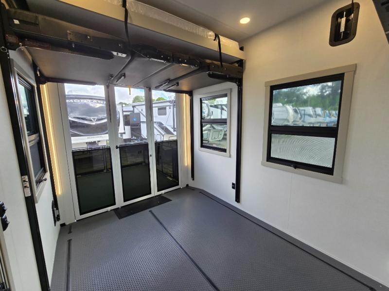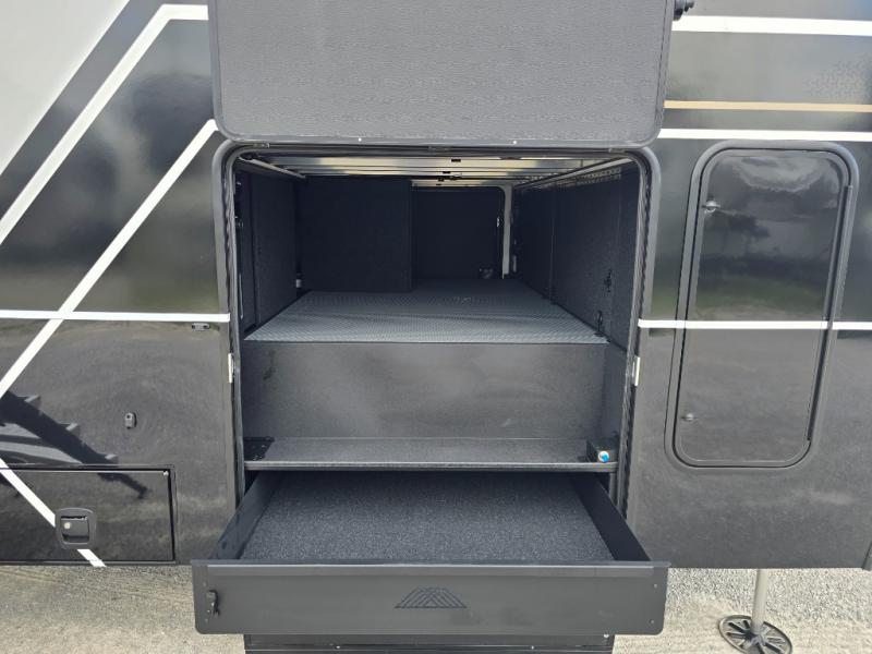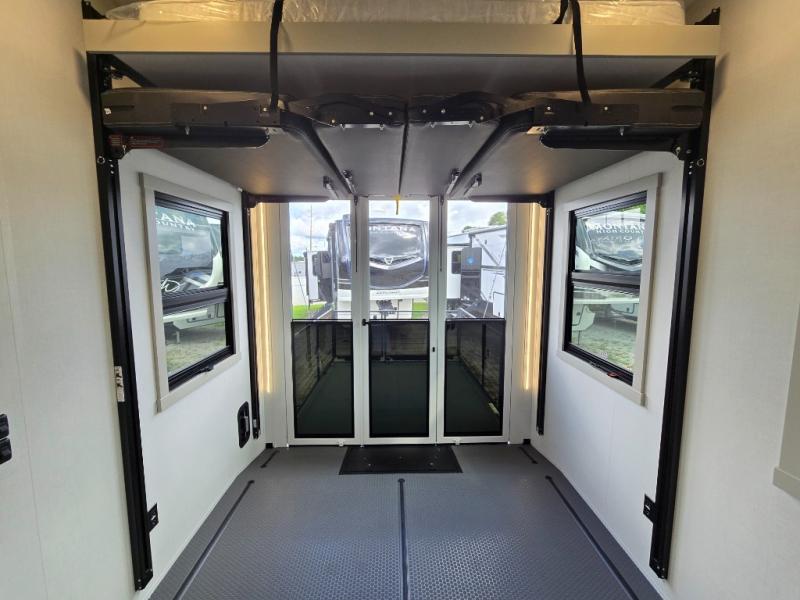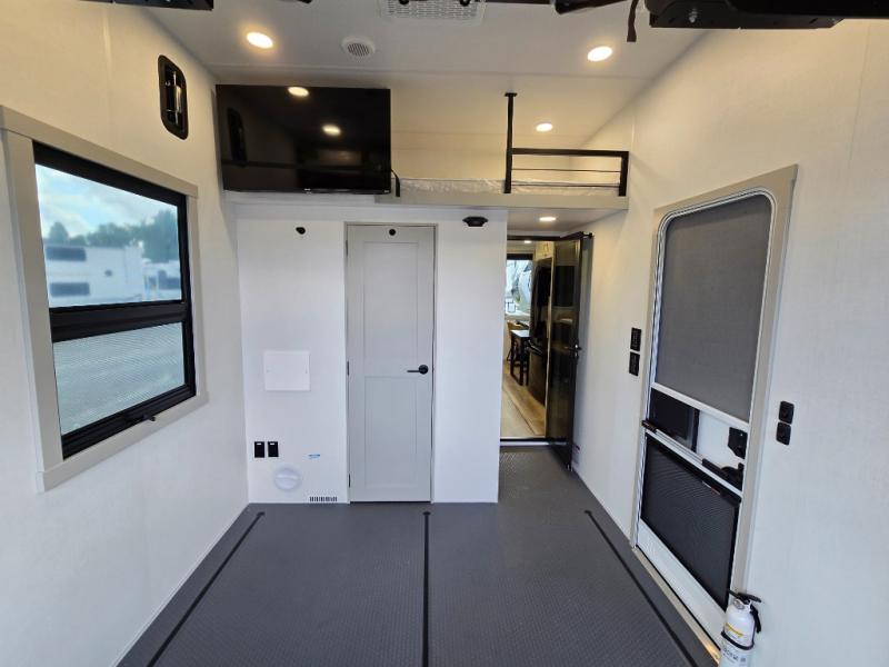 Whether you use this toy hauler to haul your favorite ride-on toys or as a mobile office, you're sure to love every inch of it! The 14' separate garage includes a Fold-N-Stow table and independent dual sofas, along with a full bath and a loft/storage with a twin bed for more sleeping space. The middle kitchen is every chef's dream with its GE appliances, kitchen island, and convenient features, such as pull-out trash bins and a cutting board, a pull-down knife rack and utensil tray, and a pull-out pantry/utility closet! Right next to the kitchen is the living room with a L-sofa with four modes, a 65" Phillips Smart TV and a fireplace, plus a convertible dining table/L-desk where you can dine or get some work done. You'll love the second full bath up front close to the private bedroom, and here, you'll find a king bed slide out, under-bed storage drawers and motion lights, a walk-in closet with cordless vacuum prep, and a sliding dresser top with hidden storage for valuables. There is also washer and dryer prep in the bedroom and garage, making this toy hauler full-time capable!