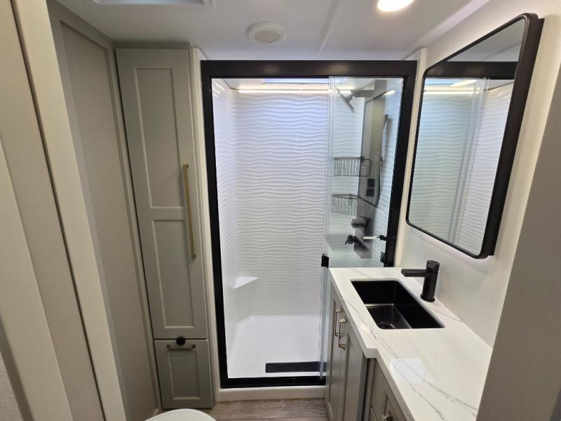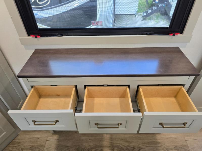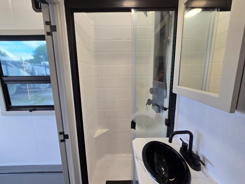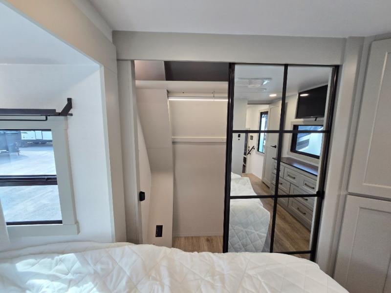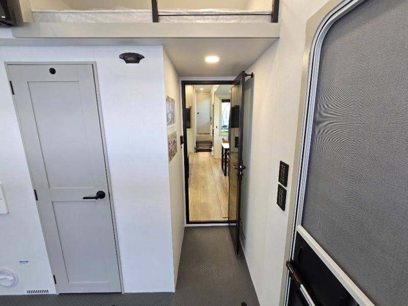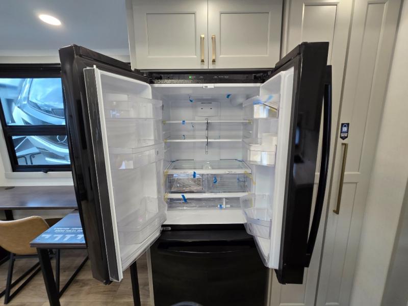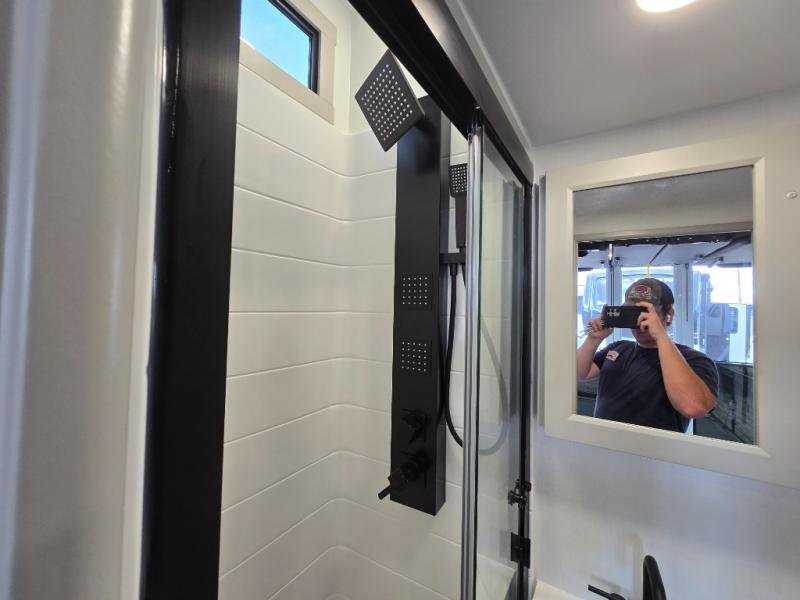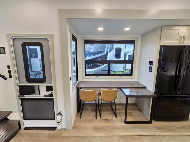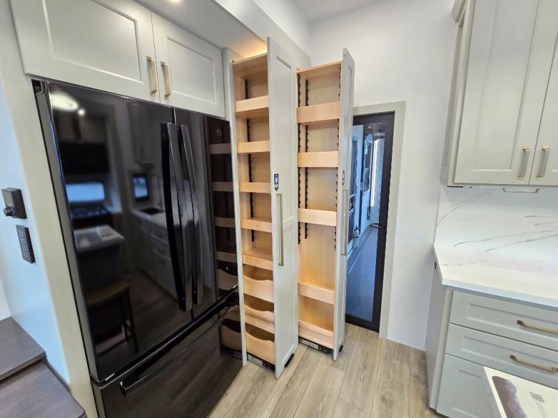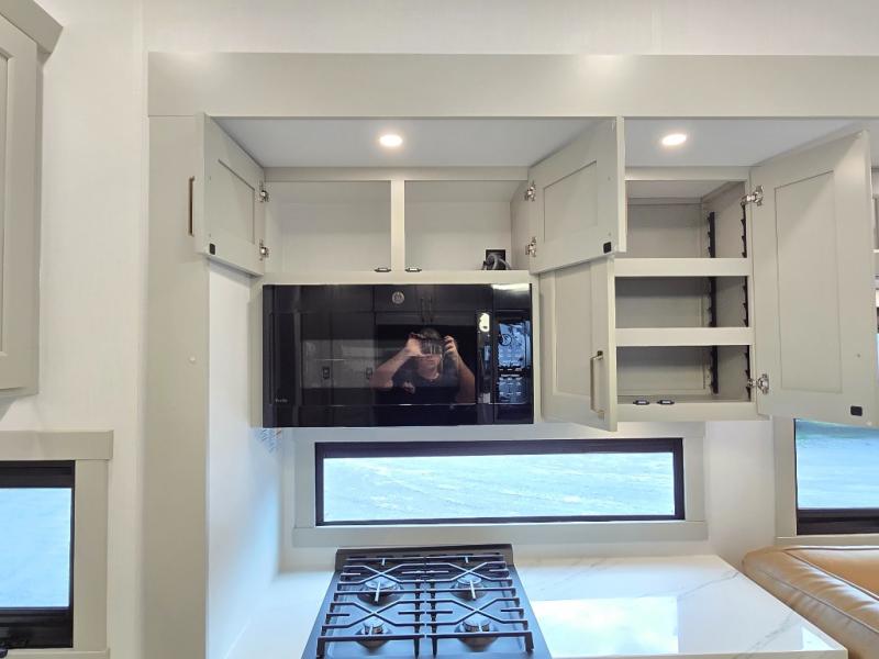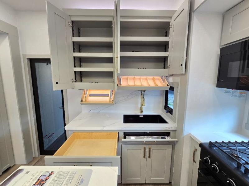 Whether you use this toy hauler to haul your favorite ride-on toys or as a mobile office, you're sure to love every inch of it! The 14' separate garage includes a Fold-N-Stow table and independent dual sofas, along with a full bath and a loft/storage with a twin bed for more sleeping space. The middle kitchen is every chef's dream with its GE appliances, kitchen island, and convenient features, such as pull-out trash bins and a cutting board, a pull-down knife rack and utensil tray, and a pull-out pantry/utility closet! Right next to the kitchen is the living room with a L-sofa with four modes, a 65" Phillips Smart TV and a fireplace, plus a convertible dining table/L-desk where you can dine or get some work done. You'll love the second full bath up front close to the private bedroom, and here, you'll find a king bed slide out, under-bed storage drawers and motion lights, a walk-in closet with cordless vacuum prep, and a sliding dresser top with hidden storage for valuables. There is also washer and dryer prep in the bedroom and garage, making this toy hauler full-time capable!