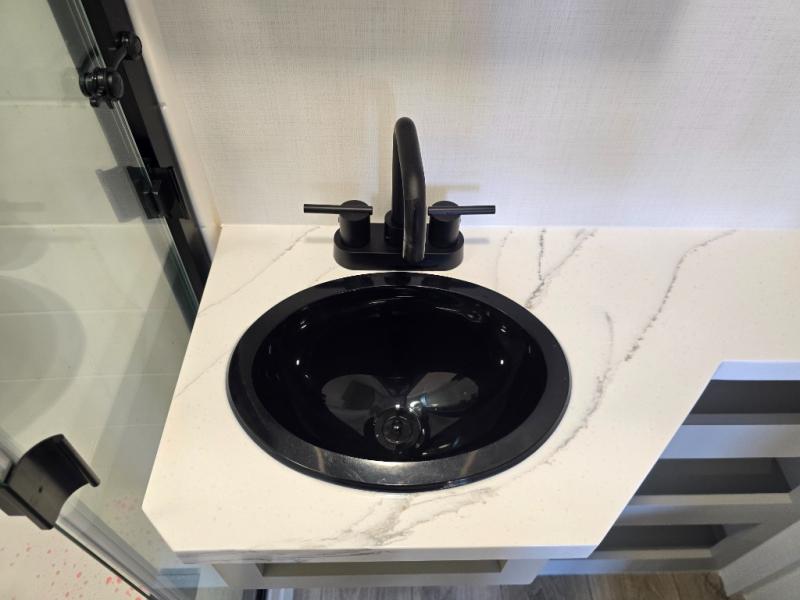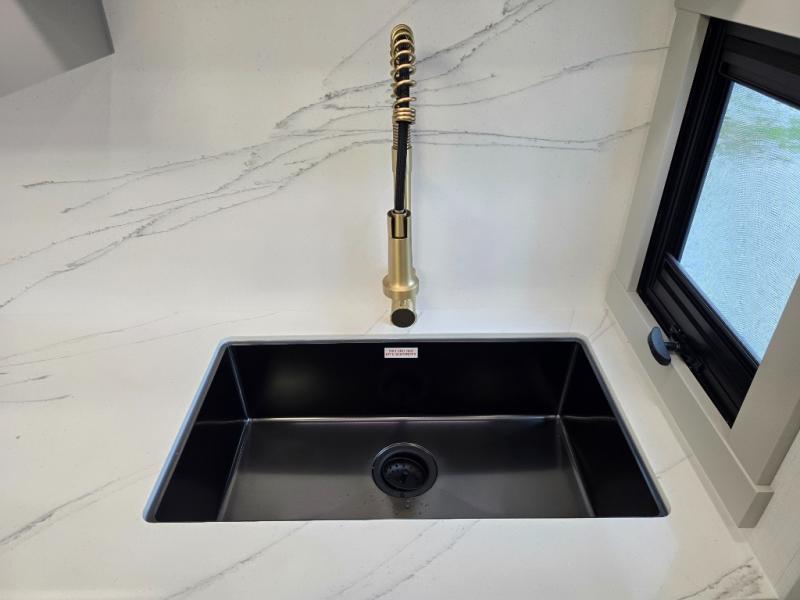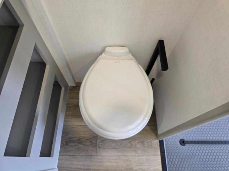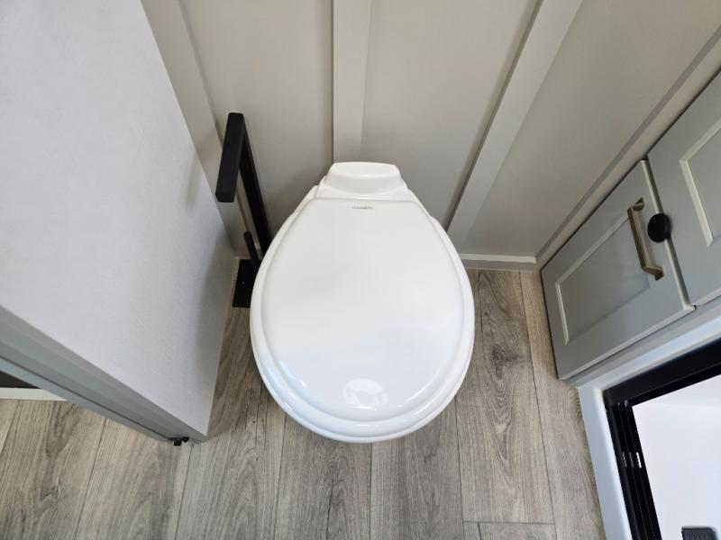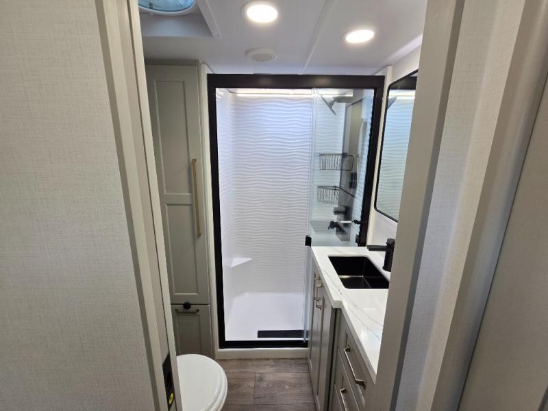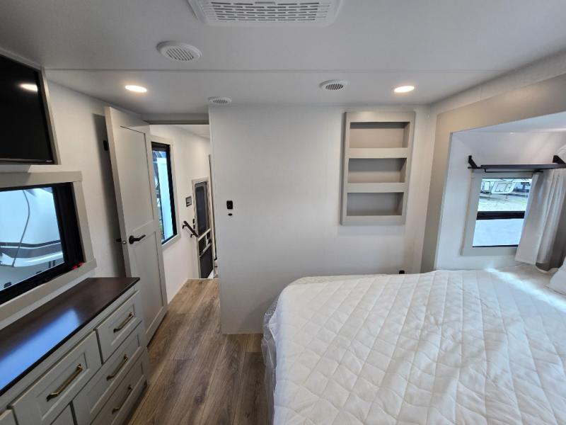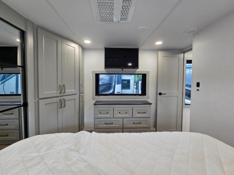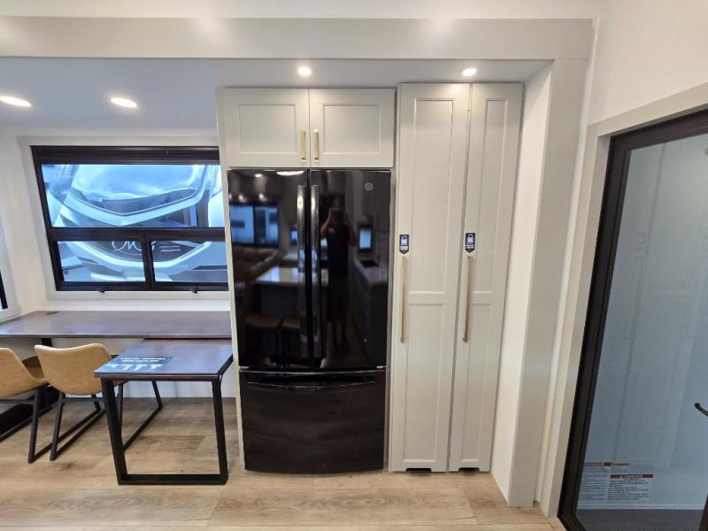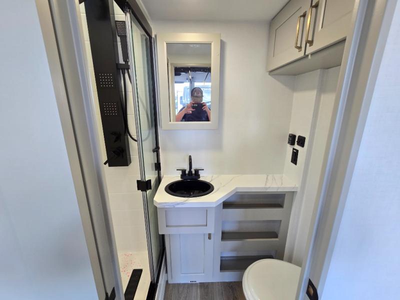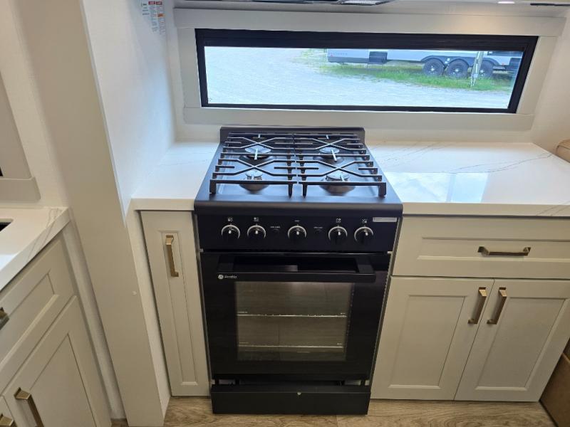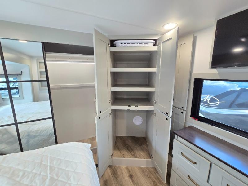 Whether you use this toy hauler to haul your favorite ride-on toys or as a mobile office, you're sure to love every inch of it! The 14' separate garage includes a Fold-N-Stow table and independent dual sofas, along with a full bath and a loft/storage with a twin bed for more sleeping space. The middle kitchen is every chef's dream with its GE appliances, kitchen island, and convenient features, such as pull-out trash bins and a cutting board, a pull-down knife rack and utensil tray, and a pull-out pantry/utility closet! Right next to the kitchen is the living room with a L-sofa with four modes, a 65" Phillips Smart TV and a fireplace, plus a convertible dining table/L-desk where you can dine or get some work done. You'll love the second full bath up front close to the private bedroom, and here, you'll find a king bed slide out, under-bed storage drawers and motion lights, a walk-in closet with cordless vacuum prep, and a sliding dresser top with hidden storage for valuables. There is also washer and dryer prep in the bedroom and garage, making this toy hauler full-time capable!